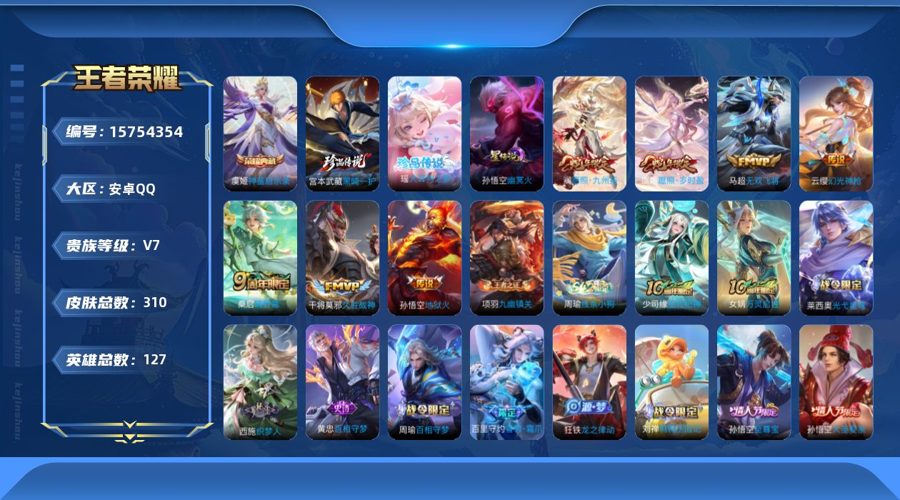 - PX_2095728-贵族等级: V3 英雄数: 81 皮肤数: 34 限定皮: 游园惊梦,至尊宝