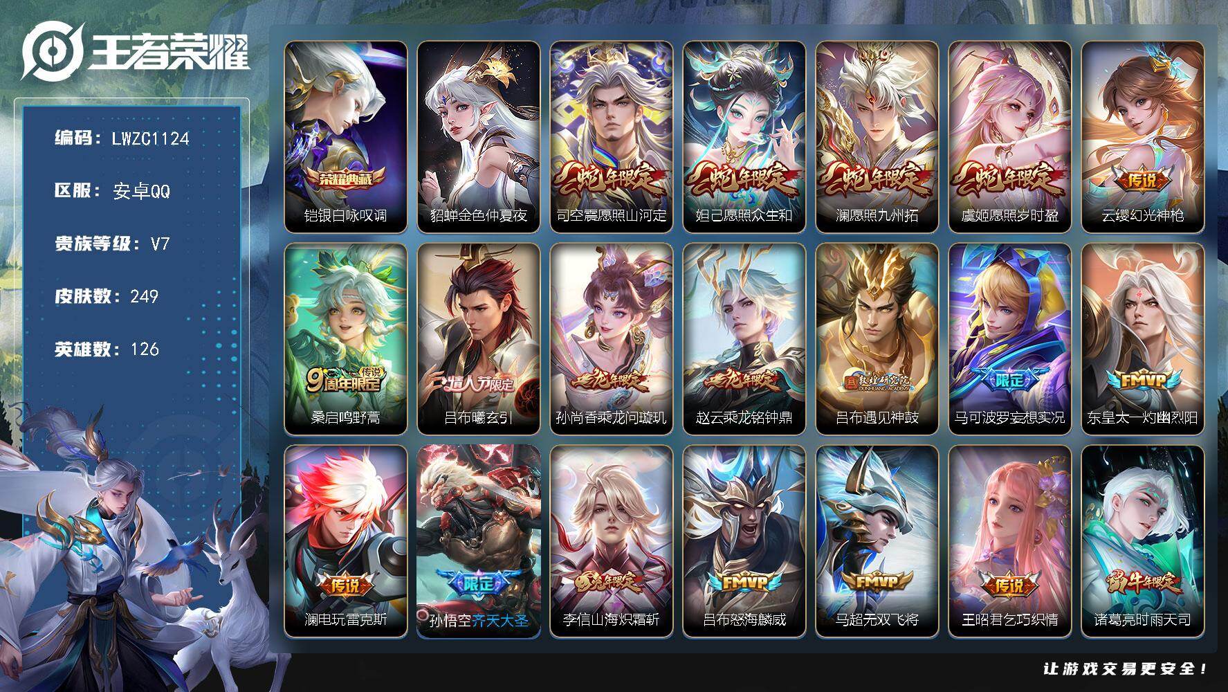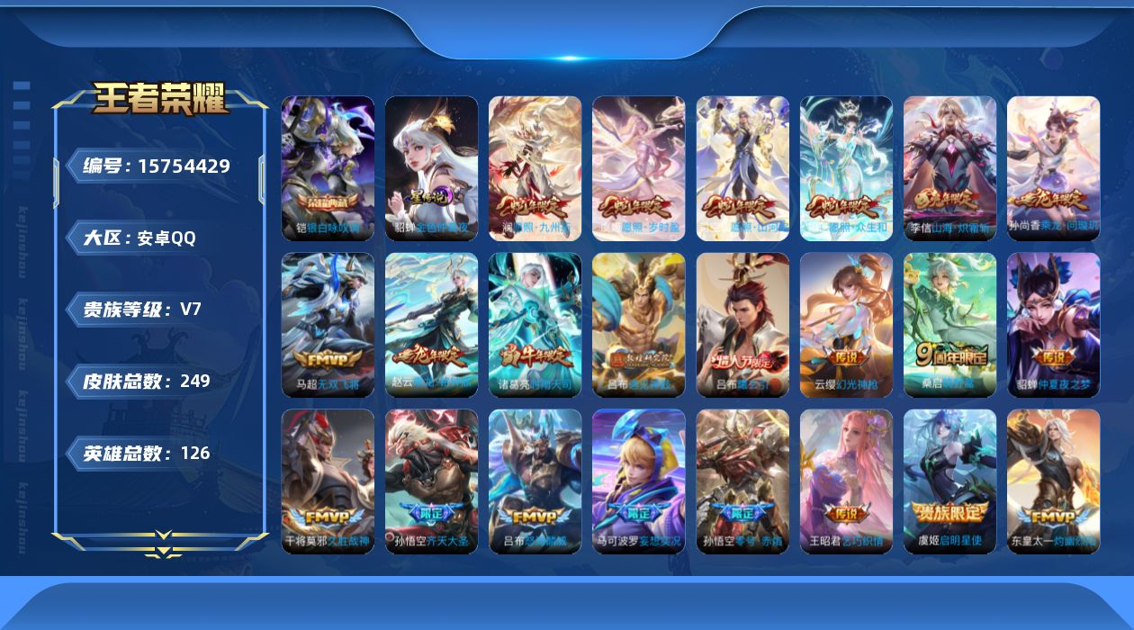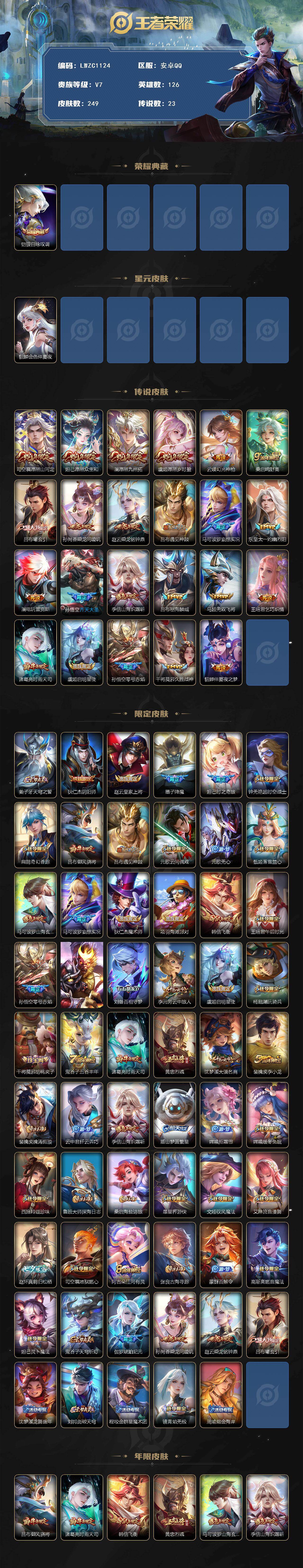 [15754429]【特价急出/详情看图】安卓Q-V7-至尊星耀V段位-126英雄-249皮肤-1典藏皮肤-23传说-86史诗