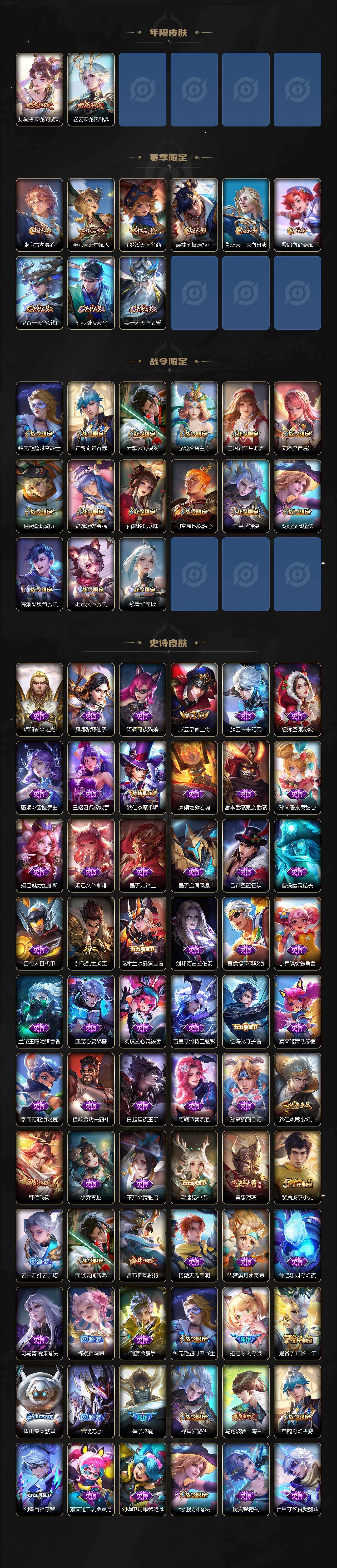 【限定皮肤】:姜子牙天穹之誓,狄仁杰阴阳师,赵云皇家上将,墨子降魔,妲己时之奇旅,钟无艳超时空战士,扁鹊奇幻香踪,吕布御风骁将,吕布遇见神鼓,元歌云间偶戏,元歌无心,甄姬落雪兰心,马可波罗山海玄木吟,马可波罗妄想实况,狄仁杰魔术师,项羽海滩派对,韩信飞衡,王昭君午后时光,孙悟空零号赤焰,孙悟空齐天大圣,刘备百相守梦,李元芳云中旅人,虞姬启明星使,杨戬潮玩骑兵,干将莫邪胡桃夹子,鬼谷子五谷丰年,诸葛亮时雨天司,黄忠烈魂,沈梦溪大漠名商,裴擒虎李小龙,裴擒虎擒涛扼浪,云中君纤云弄巧,李信山海炽霜斩,盾山梦圆繁星,嫦娥拒霜思,嫦娥暖冬兔眠,西施玲珑珍味,鲁班大师探海日志,桑启海盐诗旅,暃星界游侠,戈娅驭风魔法,艾琳流音漫舞,赵怀真鹤归松栖,司空震地狱燃心,阿古朵江河有灵,张良古海寻踪,蒙犽百解令,高渐离燃音魔法,妲己灵卜魔法,鬼谷子天穹祈灯,伽罗琥珀纪元,孙尚香乘龙问璇玑,赵云乘龙铭钟鼎,吕布曦玄引,沈梦溪龙舞盛年,刘邦剑破天穹,程咬金群星魔术团,镜青焰无极,周瑜熔金海岸