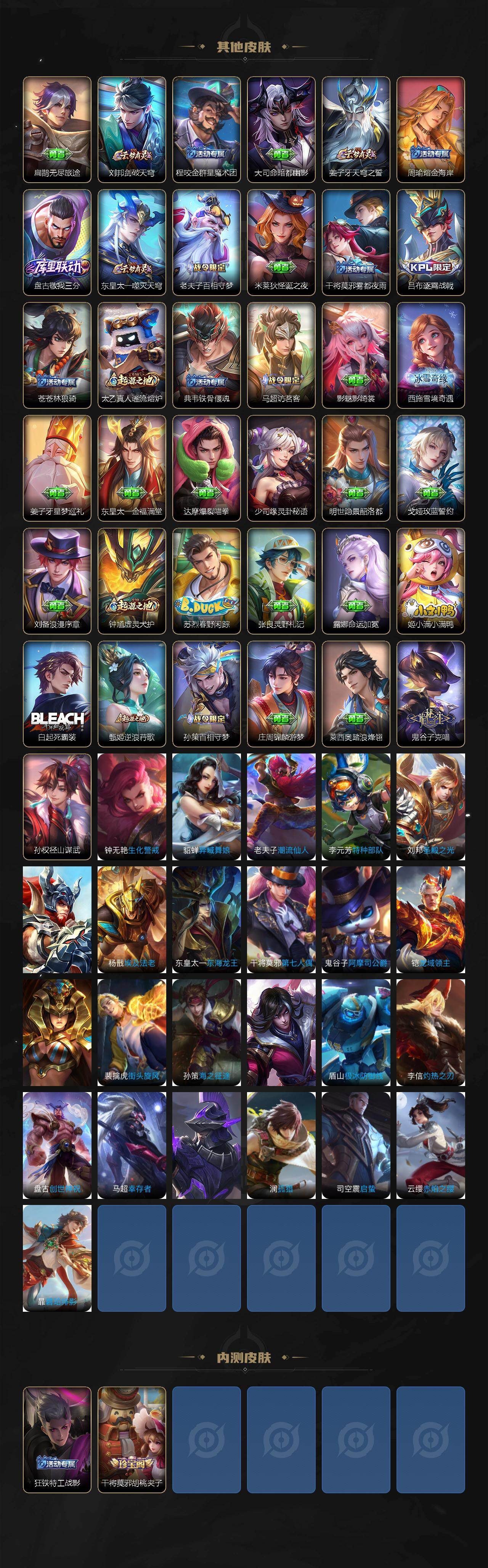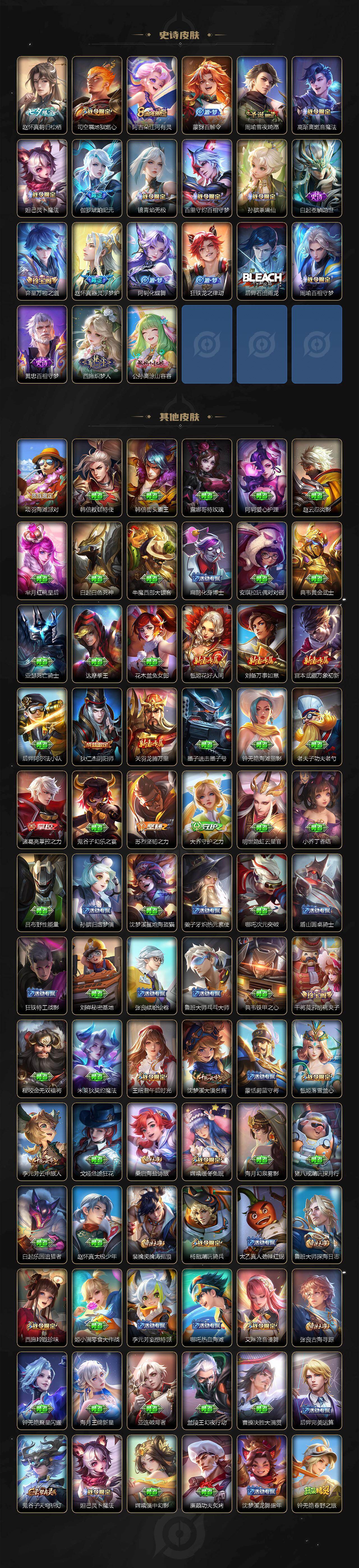 小乔青蛇,瑶遇见神鹿,李元芳逐浪之夏,不知火舞魅语,孙策猫狗日记,阿轲节奏热浪,露娜紫霞仙子,王昭君偶像歌手,项羽苍穹之光,阿轲暗夜猫娘,吕布末日机甲,墨子龙骑士,白起星夜王子,安琪拉心灵骇客,程咬金功夫厨神,刘邦德古拉伯爵,兰陵王暗隐猎兽者,曹操幽灵船长,宫本武藏鬼剑武藏,司马懿暗渊魔法,亚瑟心灵战警,钟馗乐园奇幻夜,杨戬天秀·启明,蔡文姬舞动绿茵,廉颇地狱岩魂,小乔缤纷独角兽,夏侯惇乘风破浪,花木兰水晶猎龙者,铠曙光守护者,墨子金属风暴,吕布圣诞狂欢,貂蝉圣诞恋歌,百里守约特工魅影,嫦娥拒霜思,澜赏金猎手,刘备百相守梦,蔡文姬电玩·兔顽号,刘禅电玩·爆裂旋风,镜真我赫兹,百里守约真我赫兹,赵怀真鹤归松栖,蒙犽百解令,周瑜雪夜绮愿,高渐离燃音魔法,伽罗琥珀纪元,白起苍鳞隐世,赵怀真器灵·浮梦炉