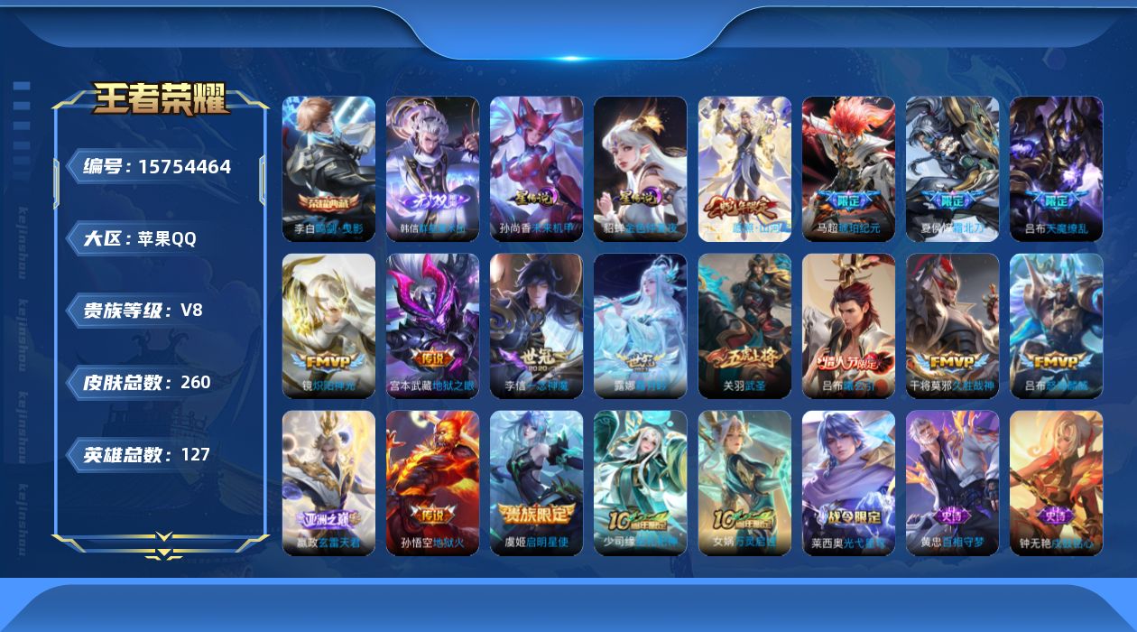 [15754464]【特价出售/店主推荐】苹果Q-V8-最强王者段位-127英雄-260皮肤-1典藏皮肤-1无双-2星传说-16传说-75史诗