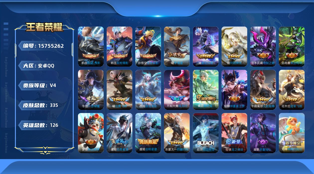 [15755262]【特价出售/店主推荐/背包一颗荣耀水晶】:安卓Q-V9-永恒钻石III段位-126英雄-335皮肤-3典藏皮肤-17传说-105史诗