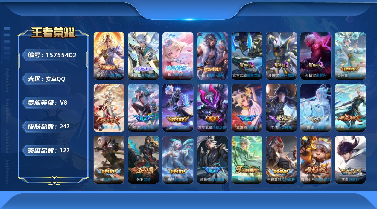[15755402]【店主推荐捡漏号!可直接换绑】安卓Q-V8-最强王者段位-127英雄-247皮肤-1典藏皮肤-1无双-2珍品传说-26传说-67史诗-4星元 【英雄全皮】:孙权全皮,阿古朵全皮,空空儿全皮 【荣耀典藏】:花木兰九霄神辉 【无双皮肤】:诸葛亮天机白泽 【珍品传说】:张飞兔狲蓬尾,瑶大耳狗之梦 【传说皮肤】:后羿神树通天,公孙离云诺千山,澜愿照九州拓,嬴政玄雷天君,桑启鸣野蒿,亚连落雪白狼,赵云乘龙铭钟鼎,澜逐花归海,露娜霜月吟,诸葛亮鹤羽星尊,夏洛特浮生妄,李白诗剑行,鲁班七号寅虎瑞焰,西施游龙清影,李元芳飞鸢探春,铠绛天战甲,虞姬启明星使,孙悟空零号赤焰,关羽武圣,曜云鹰飞将,李信一念神魔,貂蝉猫影幻舞,干将莫邪久胜战神,后羿黄金射手座,宫本武藏地狱之眼,孙悟空地狱火 【限定皮肤】:蒙犽顽岩魄,姜子牙天穹之誓,狄仁杰阴阳师,赵云皇家上将,妲己时之奇旅,孙尚香蔷薇恋人,鲁班七号寅虎瑞焰,庄周高山流水,高渐离玩趣恶龙,元歌云间偶戏,狄仁杰魔术师,狄仁杰万华元夜,达摩沙漠行僧,项羽海滩派对,关羽武圣,程咬金演武夺筹,韩信傲雪梅枪,兰陵王金庭之子,孙悟空至尊宝,孙悟空零号赤焰,孙悟空孙行者,张飞虎魄,李元芳云中旅人,虞姬启明星使,钟馗神迹守卫,钟馗驱傩正仪,女娲朔望之晖,鬼谷子原初探秘者,鬼谷子五谷丰年,诸葛亮鹤羽星尊,苏烈千军破阵,沈梦溪大漠名商,裴擒虎李小龙,裴擒虎擒涛扼浪,云中君纤云弄巧,盾山梦圆繁星,猪八戒西部大镖客,上官婉儿梁祝,嫦娥拒霜思,嫦娥暖冬兔眠,鲁班大师探海日志,桑启海盐诗旅,夏洛特浮生妄,阿古朵江河有灵,张良古海寻踪,蒙犽百解令,妲己灵卜魔法,鬼谷子天穹祈灯,伽罗琥珀纪元,姬小满妄想食味,赵云乘龙铭钟鼎,亚连落雪白狼,沈梦溪龙舞盛年,鲁班七号蔬乡物语,李元芳蔬乡物语,刘邦剑破天穹,程咬金群星魔术团,镜青焰无极,项羽苍威无极,周瑜熔金海岸 【年限皮肤】:鲁班七号寅虎瑞焰,关羽武圣,张飞虎魄,赵云乘龙铭钟鼎 【赛季限定】:狄仁杰万华元夜,达摩沙漠行僧,程咬金演武夺筹,兰陵王金庭之子,张良古海寻踪,李元芳云中旅人,钟馗驱傩正仪,鬼谷子原初探秘者,苏烈千军破阵,沈梦溪大漠名商,裴擒虎擒涛扼浪,鲁班大师探海日志,桑启海盐诗旅,鬼谷子天穹祈灯,刘邦剑破天穹,姜子牙天穹之誓 【战令限定】:元歌云间偶戏,钟馗神迹守卫,女娲朔望之晖,猪八戒西部大镖客,嫦娥暖冬兔眠,妲
