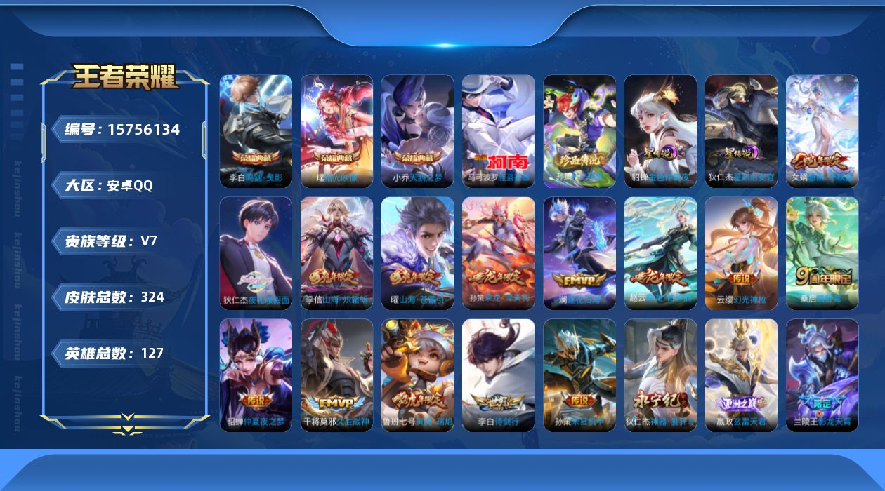 [15756134]【特价急出/详情看图】安卓Q-V7-最强王者段位-127英雄-324皮肤-3典藏皮肤-2珍品传说-3星元-23传说-92史诗