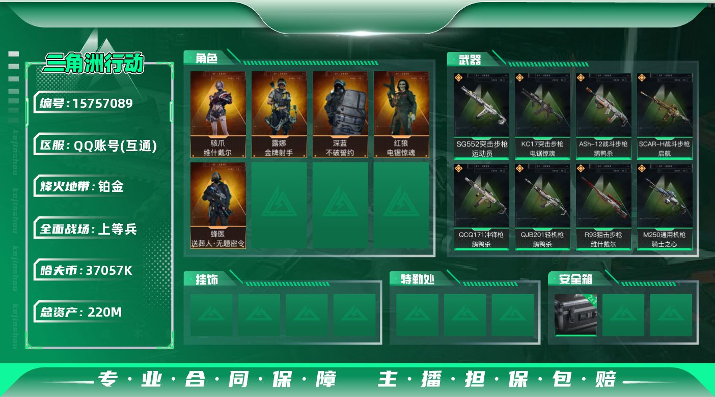 [15757089]【特价出售/店主推荐】 220m总资产-37057k哈伏币-60烽火等级-铂金-30战场等级-上等兵 【干员外观】:骇爪-维什戴尔,蜂医-送葬人·无题密令,深蓝-不破誓约,红狼-电锯惊魂,露娜-金牌射手 【近战皮肤】:近战-黑鹰 【传说外观】:M4A1突击步枪-阿米娅,ASh-12战斗步枪-鹅鸭杀,SG552突击步枪-运动员,AK-12突击步枪-特斯拉线圈,SCAR-H战斗步枪-启航,腾龙突击步枪-捞点薯条,KC17突击步枪-电锯惊魂,UZI冲锋枪-特斯拉线圈,SR-3M紧凑突击步枪-特斯拉线圈,勇士冲锋枪-能天使-午夜邮差,QCQ171冲锋枪-鹅鸭杀,725双管霰弹枪-送葬人-无题密令,M250通用机枪-骑士之心,QJB201轻机枪-鹅鸭杀,R93狙击步枪-维什戴尔,AWM狙击步枪-捞点薯条,93R-捞点薯条,复合弓-黑·天际线 【史诗外观】:ASh-12战斗步枪-无极限,M16A4突击步枪-竞赛选手,AUG突击步枪-蝮蛇,M7战斗步枪-百步穿杨,G3战斗步枪-流沙送葬,AS Val突击步枪-百步穿杨,腾龙突击步枪-无垢,K437突击步枪-守护者,MP5冲锋枪-战术竞备,Vector冲锋枪-猎鳄行动,Vector冲锋枪-百步穿杨,Vector冲锋枪-异域战争,SR-3M紧凑突击步枪-荒野求生,SR-3M紧凑突击步枪-战术竞备,勇士冲锋枪-工业狂潮,MP7冲锋枪-无垢,MP7冲锋枪-守护者,PKM通用机枪-蝮蛇,PKM通用机枪-荒野求生,M250通用机枪-囚徒,Mini-14射手步枪-守护者,SVD狙击步枪-荒野求生,PSG-1射手步枪-无垢,SV-98狙击步枪-林中猎手,M700狙击步枪-蝮蛇,M700狙击步枪-百步穿杨,AWM狙击步枪-无极限,AWM狙击步枪-流沙送葬,沙漠之鹰-曙光,复合弓-守护者 【稀有外观】:M1014霰弹枪-花岗岩,M4A1突击步枪-繁盛,AKM突击步枪-战术演练,AKM突击步枪-肃杀,QBZ95-1突击步枪-公平竞技,ASh-12战斗步枪-繁盛,K416突击步枪-虎啸,M16A4突击步枪-街头涂鸦,M7战斗步枪-捣蛋鬼,SCAR-H战斗步枪-荣耀列队,SCAR-H战斗步枪-黄昏,G3战斗步枪-战术演练,G3战斗步枪-主宰,腾龙突击步枪-雪崩,腾龙突击步枪-前沿科技,MP5冲锋枪-虎啸,MP5冲锋枪-哈夫克卫队,P90冲锋枪-黄昏,P9