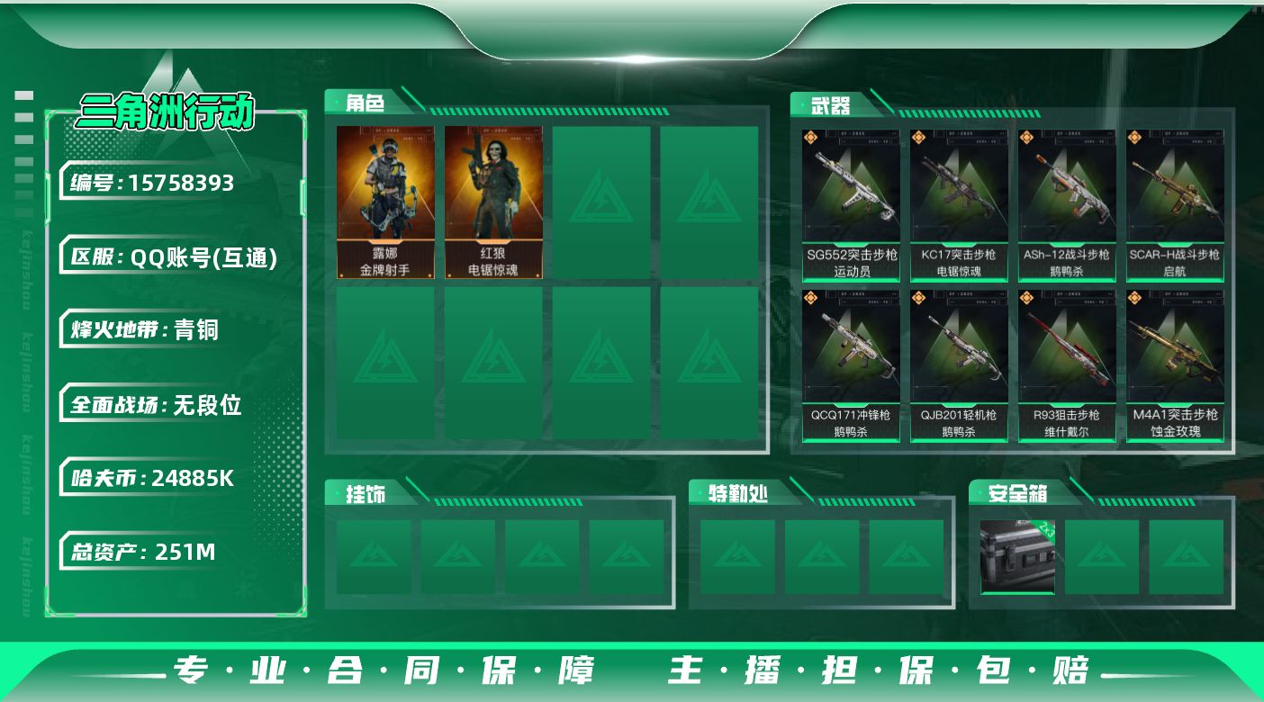 [15758393]【特价出售/店主推荐】 251m总资产-24885k哈伏币-60烽火等级-青铜-1战场等级-无军衔 【干员外观】:红狼-电锯惊魂,露娜-金牌射手 【近战皮肤】:近战-黑鹰 【传说外观】:M4A1突击步枪-蚀金玫瑰,ASh-12战斗步枪-鹅鸭杀,SG552突击步枪-运动员,SCAR-H战斗步枪-启航,KC17突击步枪-电锯惊魂,QCQ171冲锋枪-鹅鸭杀,QJB201轻机枪-鹅鸭杀,R93狙击步枪-维什戴尔 【史诗外观】:M7战斗步枪-百步穿杨,SG552突击步枪-深海恐惧,G3战斗步枪-流沙送葬,AS Val突击步枪-百步穿杨,MP5冲锋枪-战术竞备,Vector冲锋枪-百步穿杨,M250通用机枪-囚徒,M700狙击步枪-百步穿杨,AWM狙击步枪-流沙送葬 【稀有外观】:M4A1突击步枪-繁盛,ASh-12战斗步枪-繁盛,M7战斗步枪-捣蛋鬼,SCAR-H战斗步枪-荣耀列队,腾龙突击步枪-冰天雪地,MP5冲锋枪-弄臣,MP5冲锋枪-哈夫克卫队,Vector冲锋枪-先锋,UZI冲锋枪-亚特兰蒂斯,SMG-45-行动开启,勇士冲锋枪-主宰,勇士冲锋枪-冰天雪地,M1014霰弹枪-幻影结构,QJB201轻机枪-哈夫克卫队,Mini-14射手步枪-荣耀列队,SR-25射手步枪-开拓,PSG-1射手步枪-主宰,G18-星链科技,G18-哈夫克航天 【普通外观】:G17-古铜,AKM突击步枪-噬菌体,M4A1突击步枪-粉色涂装,M4A1突击步枪-高雅黑,M4A1突击步枪-海色,QBZ95-1突击步枪-高雅黑,QBZ95-1突击步枪-海浪,QBZ95-1突击步枪-海色,K416突击步枪-高雅黑,M16A4突击步枪-高雅黑,AUG突击步枪-浅蓝涂装,M7战斗步枪-红色涂装,SG552突击步枪-浅蓝涂装,SG552突击步枪-海浪,AK-12突击步枪-变色龙,SCAR-H战斗步枪-数码迷彩,G3战斗步枪-高雅黑,PTR-32突击步枪-黄蜂,CAR-15突击步枪-变色龙,K437突击步枪-磐石,MP5冲锋枪-黄蜂,Vector冲锋枪-几何迷彩,UZI冲锋枪-海色,野牛冲锋枪-高雅黑,SR-3M紧凑突击步枪-变色龙,QCQ171冲锋枪-三角洲力量,M1014霰弹枪-高雅黑,M1014霰弹枪-变色龙,M250通用机枪-条纹,QJB201轻机枪-磐石,SVD狙击步枪-高雅黑,SR-25射手步