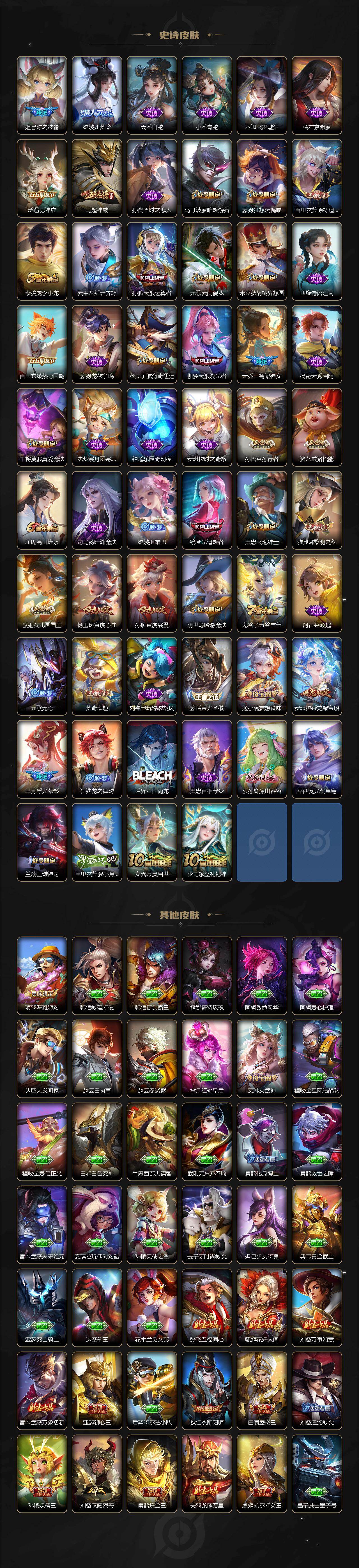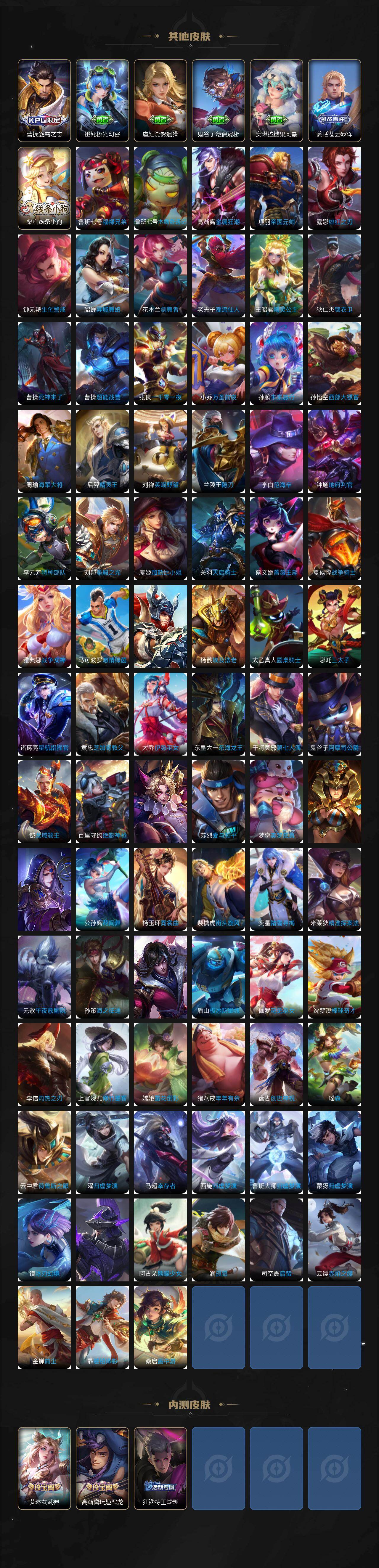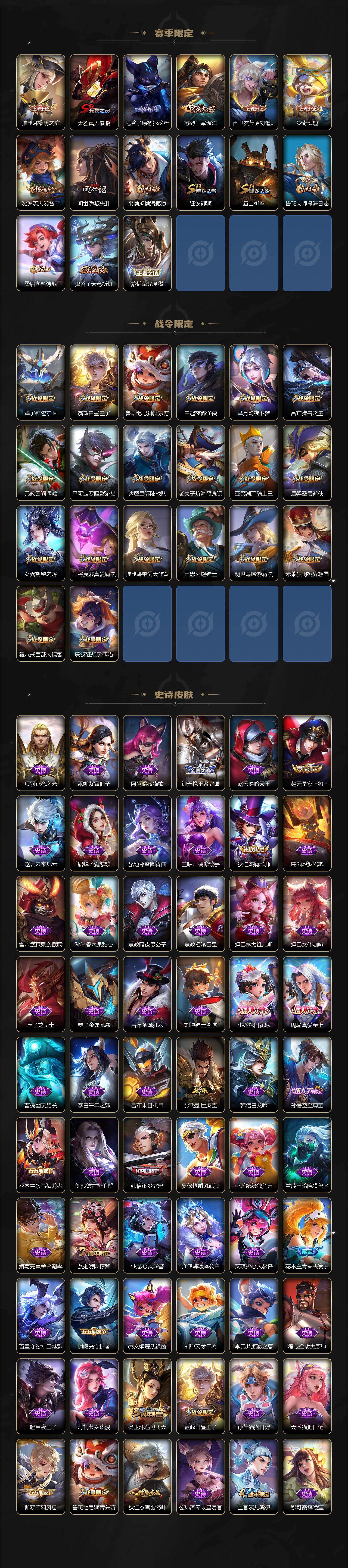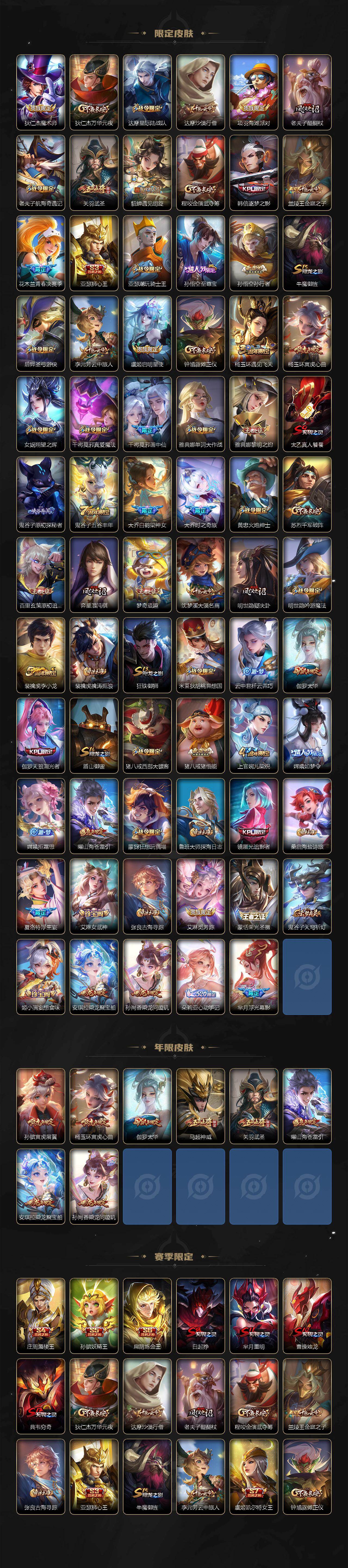 【限定皮肤】:白起狰,狄仁杰阴阳师,小乔纯白花嫁,虞姬凯尔特女王,赵云皇家上将,墨子神迹守卫,妲己时之彼端,嬴政白昼王子,孙尚香异界灵契,鲁班七号狮舞东方,庄周蜃楼王,庄周高山流水,高渐离玩趣恶龙,钟无艳王者之锤,孙膑妖精王,孙膑天狼运算者,孙膑寅虎展翼,扁鹊炼金王,白起夜都怪侠,芈月重明,芈月幻夜卜梦,吕布猎兽之王,周瑜真爱至上,元歌云间偶戏,元歌无心,甄姬女儿国国王,甄姬游园惊梦,曹操烛龙,典韦穷奇,马可波罗暗影游猎,狄仁杰魔术师,狄仁杰万华元夜,达摩星际陆战队,达摩沙漠行僧,项羽海滩派对,老夫子醍醐杖,老夫子航海奇遇记,关羽武圣,貂蝉遇见胡旋,程咬金演武夺筹,韩信逐梦之影,兰陵王金庭之子,花木兰青春决赛季,亚瑟狮心王,亚瑟潮玩骑士王,孙悟空至尊宝,孙悟空孙行者,牛魔御旌,后羿圣弓游侠,李元芳云中旅人,虞姬启明星使,钟馗驱傩正仪,杨玉环遇见飞天,杨玉环寅虎心曲,女娲朔望之晖,干将莫邪真爱魔法,干将莫邪画中仙,雅典娜单词大作战,雅典娜黎明之约,太乙真人饕餮,鬼谷子原初探秘者,鬼谷子五谷丰年,大乔白鹤梁神女