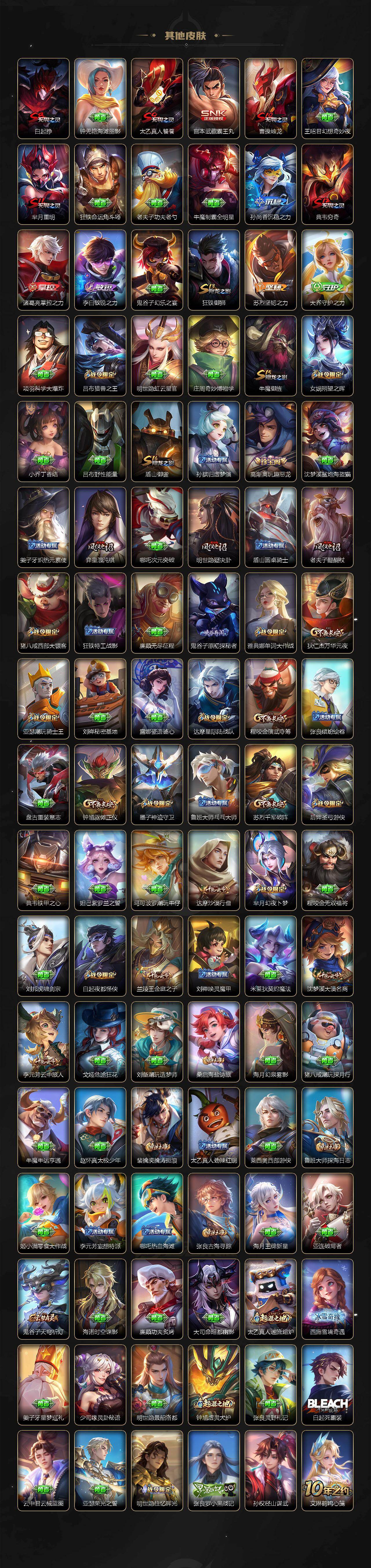 小乔青蛇,大乔白蛇,瑶遇见神鹿,娜可露露晚萤,伽罗箭羽风息,李元芳逐浪之夏,不知火舞魅语,公孙离无限星赏官,大乔猫狗日记,孙策猫狗日记,阿轲节奏热浪,露娜紫霞仙子,诸葛亮黄金分割率,王昭君偶像歌手,韩信白龙吟,项羽苍穹之光,孙尚香时之恋人,阿轲暗夜猫娘,雅典娜冰冠公主,吕布末日机甲,蒙犽龙鼓争鸣,橘右京修罗,墨子龙骑士,嬴政摇滚巨星,刘禅绅士熊喵,刘禅天才门将,白起星夜王子,安琪拉心灵骇客,安琪拉时之奇旅,程咬金功夫厨神,刘邦德古拉伯爵,兰陵王暗隐猎兽者,曹操幽灵船长,宫本武藏鬼剑武藏,司马懿暗渊魔法,亚瑟心灵战警,钟馗乐园奇幻夜,杨戬天秀·启明,蔡文姬舞动绿茵,廉颇地狱岩魂,西施诗语江南,小乔缤纷独角兽,夏侯惇乘风破浪,花木兰水晶猎龙者,铠曙光守护者,百里玄策热力回旋,墨子金属风暴,百里玄策原初追逐者,吕布圣诞狂欢,貂蝉圣诞恋歌,百里守约特工魅影,嬴政暗夜贵公子,嫦娥拒霜思,雅典娜黎明之约,李白千年之狐,阿古朵顽趣,刘禅电玩·爆裂旋风,安琪拉乘龙·聚宝船