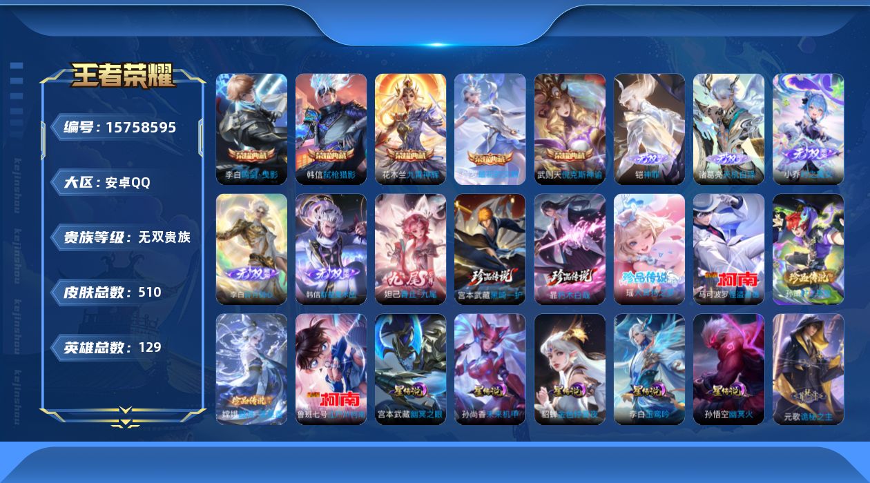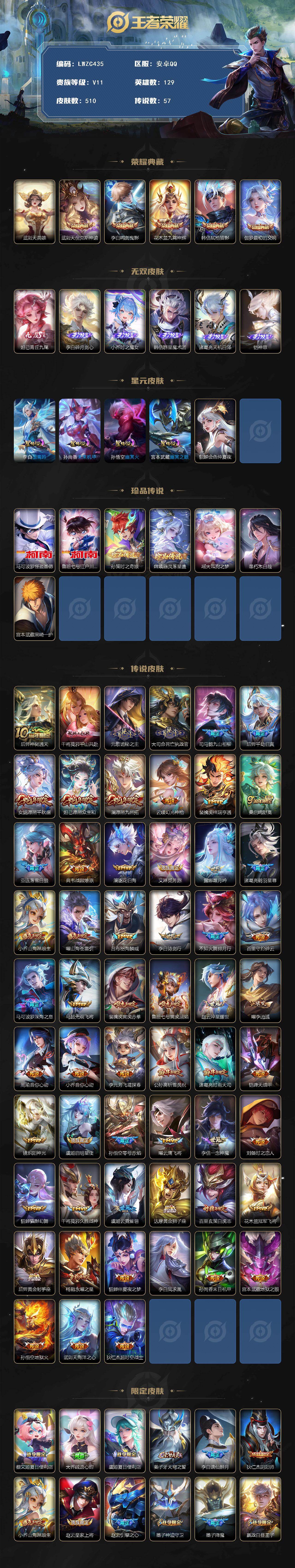 [15758595]可二次【特价出售/店主推荐 发育路31段 1市标】安卓Q-V11-至尊星耀V段位-129英雄-510皮肤-5典藏皮肤-1典藏英雄-6无双-7珍品传说-57传说-5星传说-175史诗 【英雄全皮】:元歌全皮,李白全皮,达摩全皮,司马懿全皮,刘邦全皮,韩信全皮,孙权全皮,钟馗全皮,苍全皮,沈梦溪全皮,亚连全皮,大司命全皮,蒙恬全皮,莱西奥全皮,空空儿全皮,影全皮,少司缘全皮 【荣耀典藏】:武则天英雄,武则天倪克斯神谕,李白鸣剑曳影,花木兰九霄神辉,韩信弑枪猎影,伽罗最初的交响 【无双皮肤】:妲己青丘九尾,李白碎月剑心,小乔时之魔女,韩信群星魔术团,诸葛亮天机白泽,铠神罪 【珍品传说】:马可波罗怪盗基德,鲁班七号江户川柯南,孙策时之奇旅,嫦娥器灵落星盏,瑶大耳狗之梦,暃朽木白哉,宫本武藏黑崎一护 【传说皮肤】:后羿神树通天,干将莫邪千山共赴,元歌诡秘之主,大司命死亡执政官,司马懿九山相柳,后羿千劫归真,女娲愿照千秋盛,妲己愿照众生和,澜愿照九州拓,云缨幻光神枪,裴擒虎祥瑞亨通,桑启鸣野蒿,亚连落雪白狼,典韦战鼓燎原,澜逐花归海,艾琳觅芳踪,露娜霜月吟,诸葛亮鹤羽星尊,小乔山海琳琅生,曜山海苍雷引,吕布怒海麟威,李白诗剑行,不知火舞绯月行,百里守约碎云,马可波罗深海之息,马超无双飞将,裴擒虎寅虎赤拳,鲁班七号寅虎瑞焰,赵云淬星耀世,曜李逍遥 ,周瑜音你心动,小乔音你心动,李元芳飞鸢探春,公孙离祈雪灵祝,诸葛亮时雨天司,铠绛天战甲,镜炽阳神光,虞姬启明星使,孙悟空零号赤焰,曜云鹰飞将,李信一念神魔,刘备时之恋人,貂蝉猫影幻舞,干将莫邪久胜战神,虞姬云霓雀翎,达摩黄金狮子座,百里玄策白虎志,花木兰冠军飞将,后羿黄金射手座,杨戬永曜之星,貂蝉仲夏夜之梦,李白凤求凰,孙尚香末日机甲,宫本武藏地狱之眼,孙悟空地狱火,武则天海洋之心,狄仁杰超时空战士 【限定皮肤】:蔡文姬夏日便利店,大乔绒语心约,虞姬夏日便利店,姜子牙天穹之誓,李白谪仙醉月,狄仁杰阴阳师,小乔山海琳琅生,赵云皇家上将,赵云引擎之心,墨子神迹守卫,墨子降魔,嬴政白昼王子,孙尚香蔷薇恋人,鲁班七号狮舞东方,鲁班七号寅虎瑞焰,庄周高山流水,高渐离死亡摇滚,阿轲迷踪丽影,扁鹊奇幻香踪,芈月白晶晶,芈月幻夜卜梦,吕布猎兽之王,吕布御风骁将,周瑜赤莲之焰,元歌云间偶戏,元歌无心,夏侯惇朔风刀,甄姬游园惊梦,典韦蓝屏警告,马可波罗