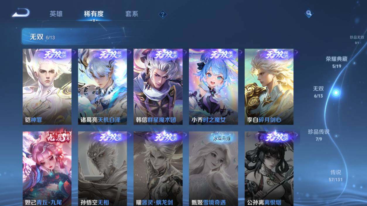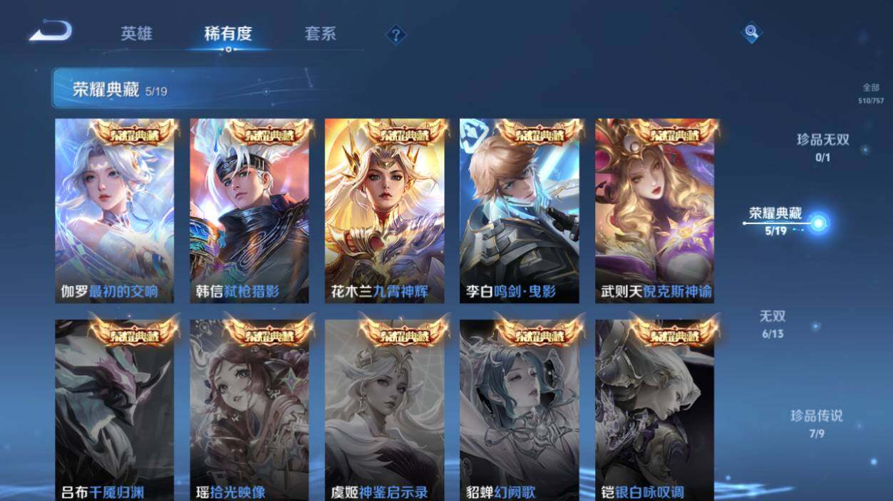 【荣耀典藏】:武则天英雄,武则天倪克斯神谕,李白鸣剑曳影,花木兰九霄神辉,韩信弑枪猎影,伽罗最初的交响