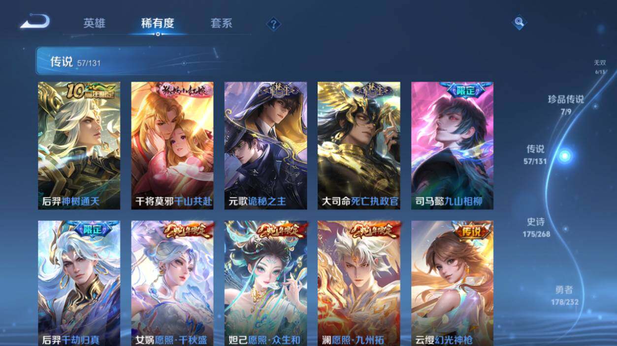 【传说皮肤】:后羿神树通天,干将莫邪千山共赴,元歌诡秘之主,大司命死亡执政官,司马懿九山相柳,后羿千劫归真,女娲愿照千秋盛,妲己愿照众生和,澜愿照九州拓,云缨幻光神枪,裴擒虎祥瑞亨通,桑启鸣野蒿,亚连落雪白狼,典韦战鼓燎原,澜逐花归海,艾琳觅芳踪,露娜霜月吟,诸葛亮鹤羽星尊,小乔山海琳琅生,曜山海苍雷引,吕布怒海麟威,李白诗剑行,不知火舞绯月行,百里守约碎云,马可波罗深海之息,马超无双飞将,裴擒虎寅虎赤拳,鲁班七号寅虎瑞焰,赵云淬星耀世,曜李逍遥 ,周瑜音你心动,小乔音你心动,李元芳飞鸢探春,公孙离祈雪灵祝,诸葛亮时雨天司,铠绛天战甲,镜炽阳神光,虞姬启明星使,孙悟空零号赤焰,曜云鹰飞将,李信一念神魔,刘备时之恋人,貂蝉猫影幻舞,干将莫邪久胜战神,虞姬云霓雀翎,达摩黄金狮子座,百里玄策白虎志,花木兰冠军飞将,后羿黄金射手座,杨戬永曜之星,貂蝉仲夏夜之梦,李白凤求凰,孙尚香末日机甲,宫本武藏地狱之眼,孙悟空地狱火,武则天海洋之心,狄仁杰超时空战士
