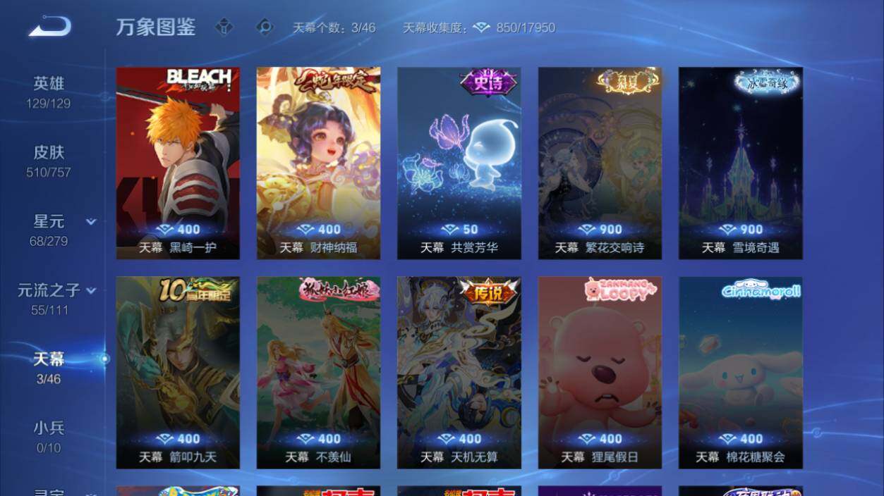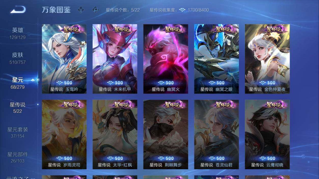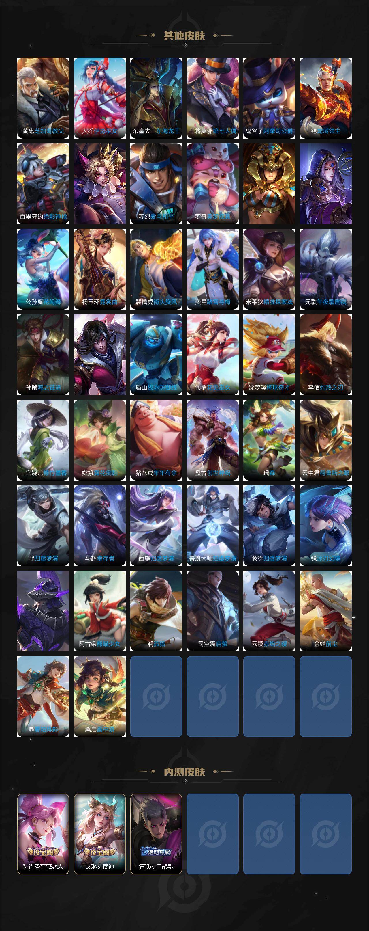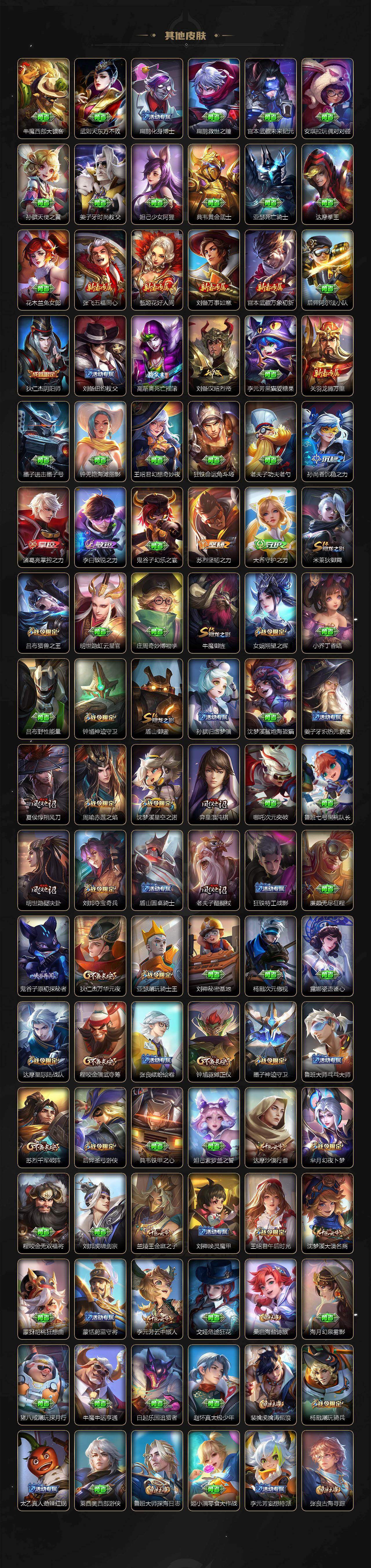 米莱狄御霄,牛魔御旌,盾山御銮,夏侯惇朔风刀,明世隐疑决卦,老夫子醍醐杖,鬼谷子原初探秘者,狄仁杰万华元夜,程咬金演武夺筹,钟馗驱傩正仪,苏烈千军破阵,吕布猎兽之王,嬴政白昼王子,女娲朔望之晖,典韦蓝屏警告,钟馗神迹守卫,鲁班七号狮舞东方,沈梦溪星空之诺,李元芳银河之约,刘邦夺宝奇兵,蒙犽狂想玩偶喵,元歌云间偶戏,弈星混沌棋,达摩沙漠行僧,兰陵王金庭之子,沈梦溪大漠名商,李元芳云中旅人,桑启海盐诗旅,裴擒虎擒涛扼浪,鲁班大师探海日志,张良古海寻踪,项羽苍威无极