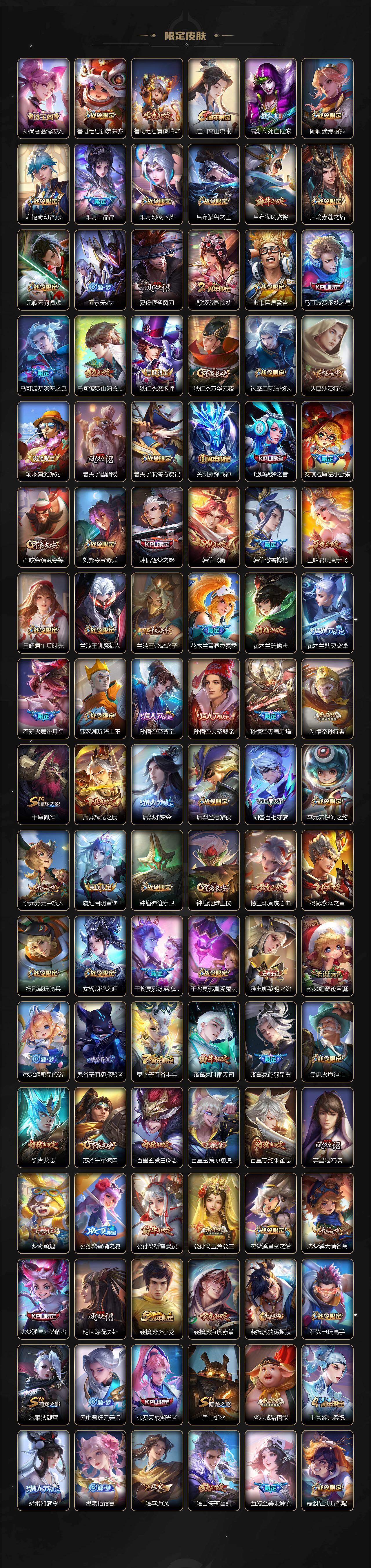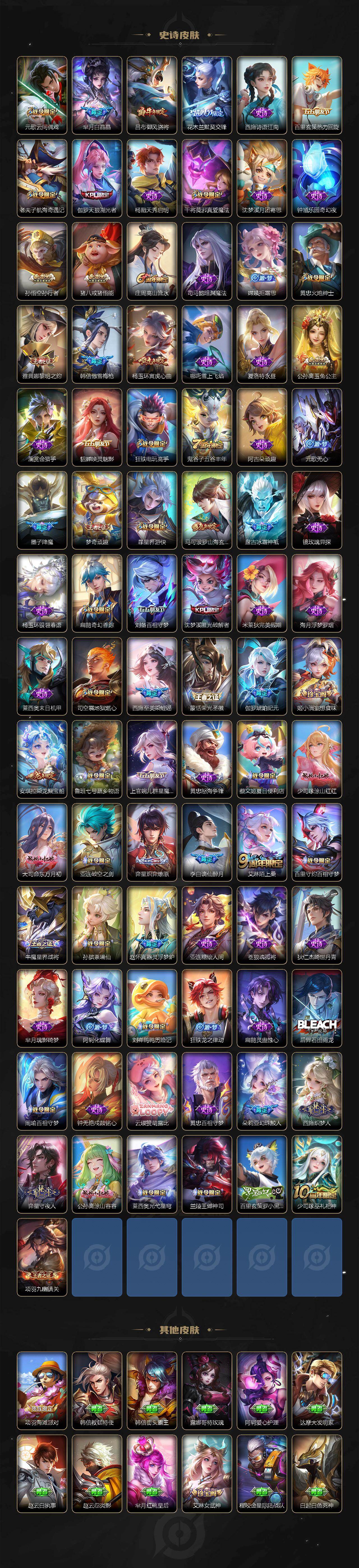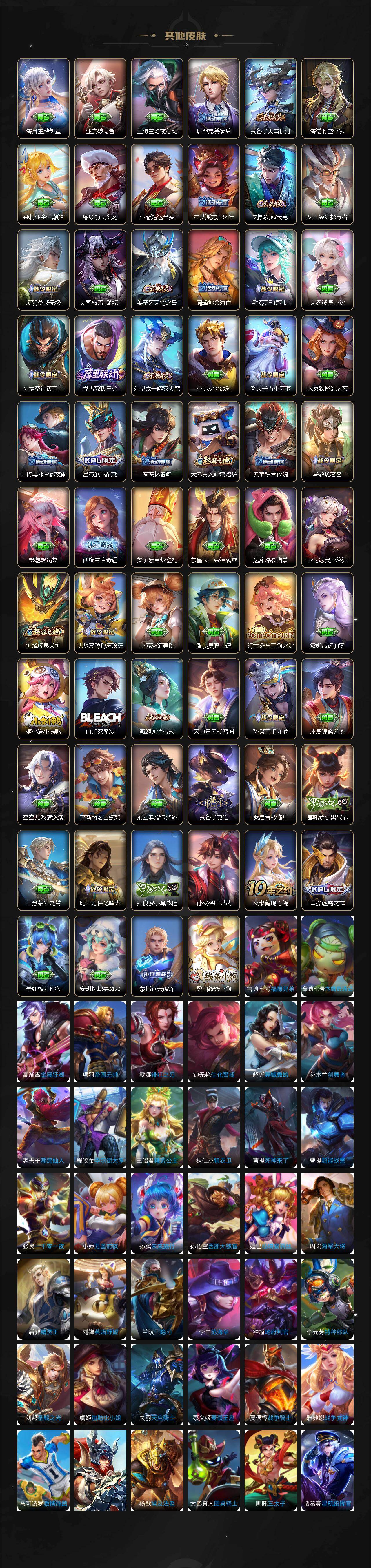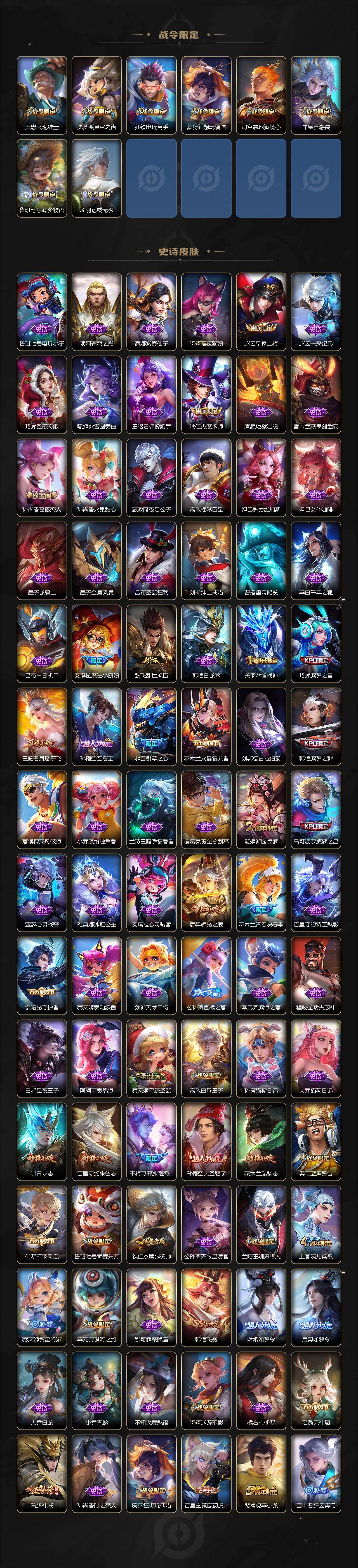 小乔青蛇,大乔白蛇,瑶遇见神鹿,娜可露露晚萤,伽罗箭羽风息,李元芳逐浪之夏,不知火舞魅语,公孙离无限星赏官,大乔猫狗日记,孙策猫狗日记,阿轲节奏热浪,露娜紫霞仙子,诸葛亮黄金分割率,王昭君偶像歌手,韩信白龙吟,项羽苍穹之光,孙尚香时之恋人,阿轲暗夜猫娘,雅典娜冰冠公主,吕布末日机甲,鲁班七号电玩小子,橘右京修罗,墨子龙骑士,嬴政摇滚巨星,刘禅绅士熊喵,刘禅天才门将,白起星夜王子,安琪拉心灵骇客,程咬金功夫厨神,刘邦德古拉伯爵,兰陵王暗隐猎兽者,曹操幽灵船长,宫本武藏鬼剑武藏,司马懿暗渊魔法,亚瑟心灵战警,钟馗乐园奇幻夜,杨戬天秀·启明,蔡文姬舞动绿茵,廉颇地狱岩魂,西施诗语江南,小乔缤纷独角兽,夏侯惇乘风破浪,花木兰水晶猎龙者,铠曙光守护者,百里玄策热力回旋,墨子金属风暴,百里玄策原初追逐者,吕布圣诞狂欢,貂蝉圣诞恋歌,百里守约特工魅影,嬴政暗夜贵公子,嫦娥拒霜思,雅典娜黎明之约,李白千年之狐,哪吒雪上飞焰,夏洛特永昼,澜赏金猎手,貂蝉唤灵魅影,阿古朵顽趣,镜玫瑰异探,杨玉环银翎春语,刘备百相守梦,沈梦溪匿光破解者,海月浮梦罗烟,莱西奥末日机甲,伽罗琥珀纪元,安琪拉乘龙·聚宝船,上官婉儿群星魔术团,李白谪仙醉月,赵怀真器灵·浮梦炉,亚连糖绘人间,苍狼魂孤将,狄仁杰绮世丹青