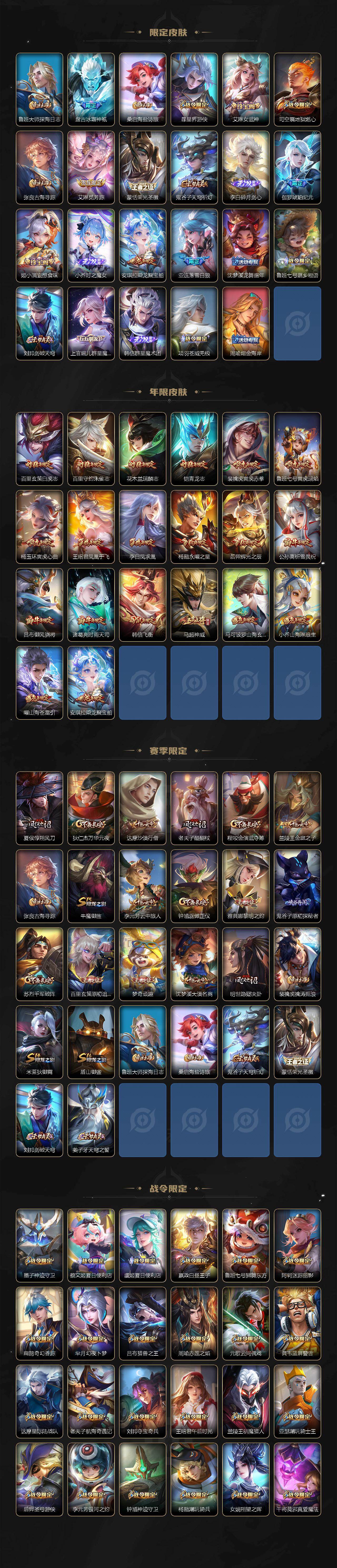 【限定皮肤】:蔡文姬夏日便利店,大乔绒语心约,虞姬夏日便利店,姜子牙天穹之誓,李白谪仙醉月,狄仁杰阴阳师,小乔山海琳琅生,赵云皇家上将,赵云引擎之心,墨子神迹守卫,墨子降魔,嬴政白昼王子,孙尚香蔷薇恋人,鲁班七号狮舞东方,鲁班七号寅虎瑞焰,庄周高山流水,高渐离死亡摇滚,阿轲迷踪丽影,扁鹊奇幻香踪,芈月白晶晶,芈月幻夜卜梦,吕布猎兽之王,吕布御风骁将,周瑜赤莲之焰,元歌云间偶戏,元歌无心,夏侯惇朔风刀,甄姬游园惊梦,典韦蓝屏警告,马可波罗