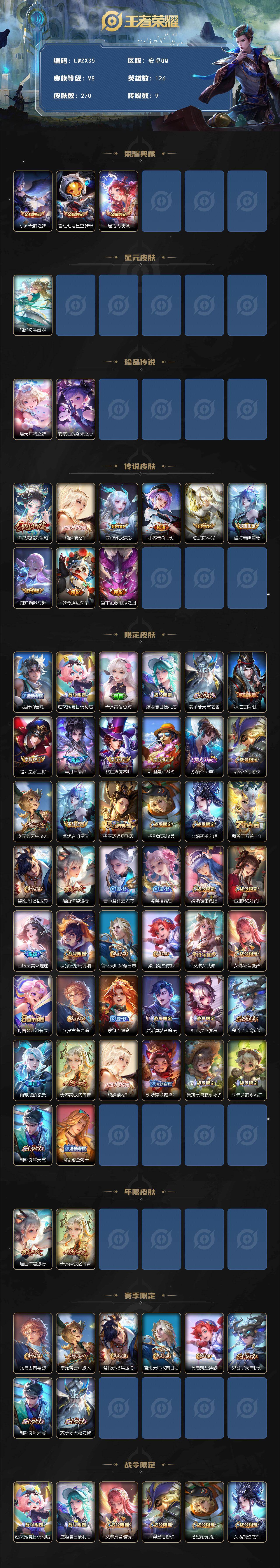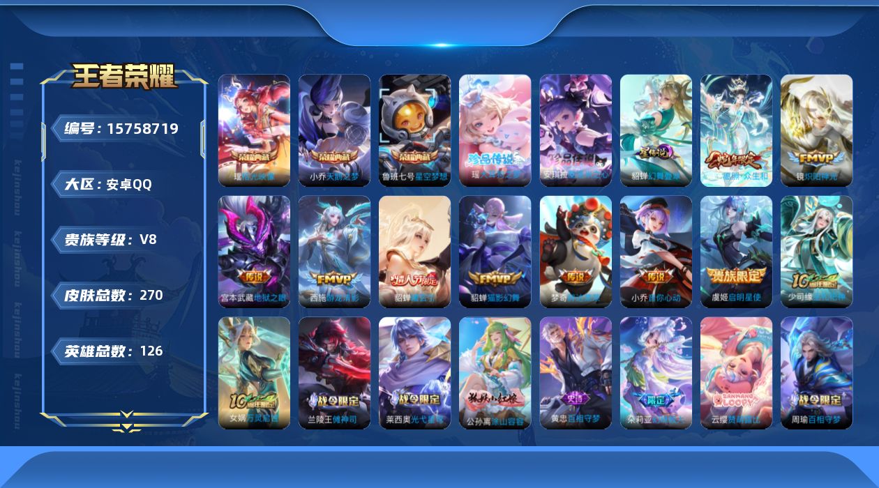 [15758719]【特价出售/店主推荐】安卓Q-V8-最强王者段位-126英雄-270皮肤-3典藏皮肤-2珍品传说-9传说-68史诗-1星元