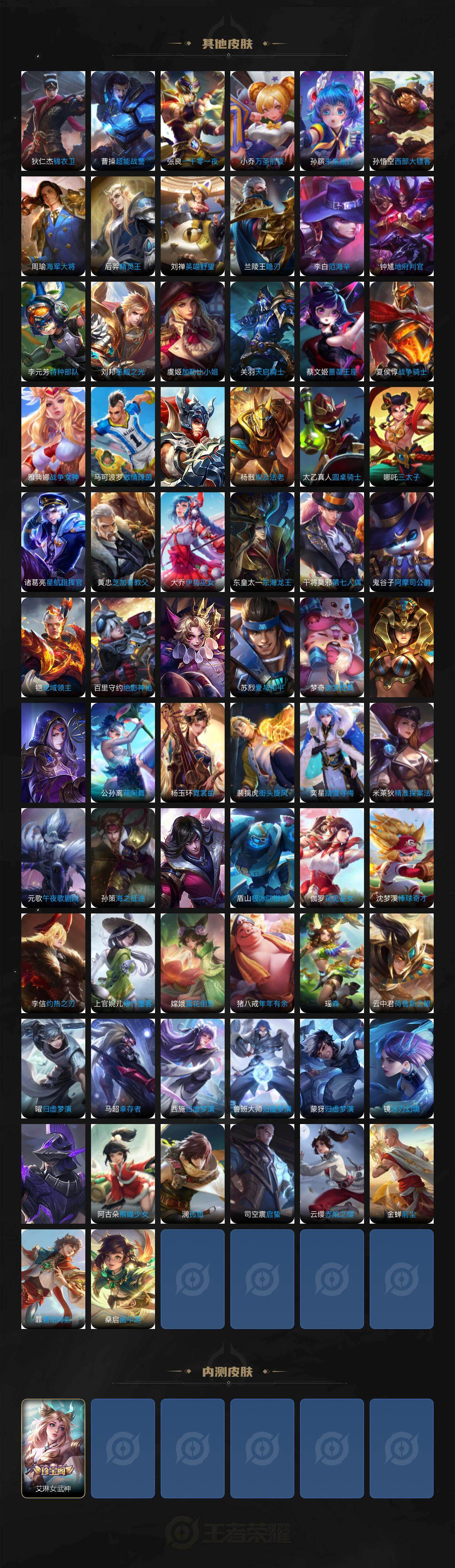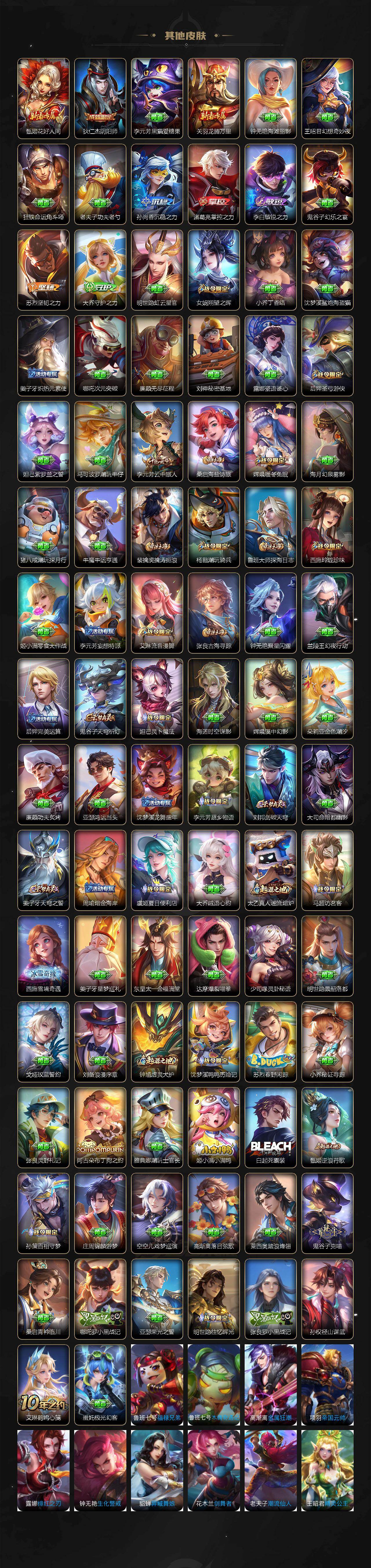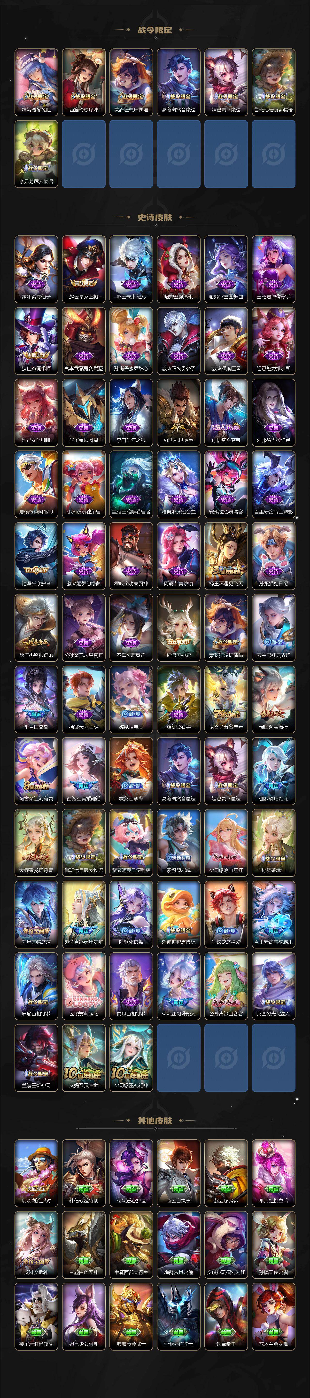 【限定皮肤】:蒙犽顽岩魄,蔡文姬夏日便利店,大乔绒语心约,虞姬夏日便利店,姜子牙天穹之誓,狄仁杰阴阳师,赵云皇家上将,芈月白晶晶,狄仁杰魔术师,项羽海滩派对,孙悟空至尊宝,后羿圣弓游侠,李元芳云中旅人,虞姬启明星使,杨玉环遇见飞天,杨戬潮玩骑兵,女娲朔望之晖,鬼谷子五谷丰年,裴擒虎擒涛扼浪,瑶山海碧波行,云中君纤云弄巧,嫦娥拒霜思,嫦娥暖冬兔眠,西施玲珑珍味,西施至美乘鲤谣,蒙犽狂想玩偶喵,鲁班大师探海日志,桑启海盐诗旅,艾琳女武神,艾琳流音漫舞,阿古朵江河有灵,张良古海寻踪,蒙犽百解令,高渐离燃音魔法,妲己灵卜魔法,鬼谷子天穹祈灯,伽罗琥珀纪元,大乔乘龙忆丹青,貂蝉曦玄引,沈梦溪龙舞盛年,鲁班七号蔬乡物语,李元芳蔬乡物语,刘邦剑破天穹,周瑜熔金海岸