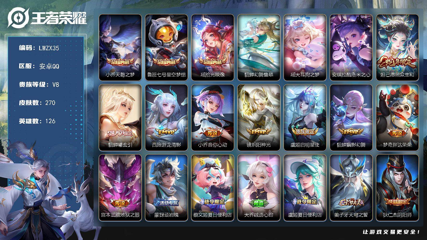 [15758719]【特价出售/店主推荐】安卓Q-V8-最强王者段位-126英雄-270皮肤-3典藏皮肤-2珍品传说-9传说-68史诗-1星元 【英雄全皮】:孙权全皮,空空儿全皮,少司缘全皮 【荣耀典藏】:小乔天鹅之梦,鲁班七号星空梦想,瑶拾光映像 【珍品传说】:瑶大耳狗之梦,安琪拉酷洛米之心 【传说皮肤】:妲己愿照众生和,貂蝉曦玄引,西施游龙清影,小乔音你心动,镜炽阳神光,虞姬启明星使,貂蝉猫影幻舞,梦奇胖达荣荣,宫本武藏地狱之眼 【限定皮肤】:蒙犽顽岩魄,蔡文姬夏日便利店,大乔绒语心约,虞姬夏日便利店,姜子牙天穹之誓,狄仁杰阴阳师,赵云皇家上将,芈月白晶晶,狄仁杰魔术师,项羽海滩派对,孙悟空至尊宝,后羿圣弓游侠,李元芳云中旅人,虞姬启明星使,杨玉环遇见飞天,杨戬潮玩骑兵,女娲朔望之晖,鬼谷子五谷丰年,裴擒虎擒涛扼浪,瑶山海碧波行,云中君纤云弄巧,嫦娥拒霜思,嫦娥暖冬兔眠,西施玲珑珍味,西施至美乘鲤谣,蒙犽狂想玩偶喵,鲁班大师探海日志,桑启海盐诗旅,艾琳女武神,艾琳流音漫舞,阿古朵江河有灵,张良古海寻踪,蒙犽百解令,高渐离燃音魔法,妲己灵卜魔法,鬼谷子天穹祈灯,伽罗琥珀纪元,大乔乘龙忆丹青,貂蝉曦玄引,沈梦溪龙舞盛年,鲁班七号蔬乡物语,李元芳蔬乡物语,刘邦剑破天穹,周瑜熔金海岸 【年限皮肤】:瑶山海碧波行,大乔乘龙忆丹青 【赛季限定】:张良古海寻踪,李元芳云中旅人,裴擒虎擒涛扼浪,鲁班大师探海日志,桑启海盐诗旅,鬼谷子天穹祈灯,刘邦剑破天穹,姜子牙天穹之誓 【战令限定】:蔡文姬夏日便利店,虞姬夏日便利店,艾琳流音漫舞,后羿圣弓游侠,杨戬潮玩骑兵,女娲朔望之晖,嫦娥暖冬兔眠,西施玲珑珍味,蒙犽狂想玩偶喵,高渐离燃音魔法,妲己灵卜魔法,鲁班七号蔬乡物语,李元芳蔬乡物语 【史诗皮肤】:露娜紫霞仙子,赵云皇家上将,赵云未来纪元,貂蝉圣诞恋歌,甄姬冰雪圆舞曲,王昭君偶像歌手,狄仁杰魔术师,宫本武藏鬼剑武藏,孙尚香水果甜心,嬴政暗夜贵公子,嬴政摇滚巨星,妲己魅力维加斯,妲己女仆咖啡,墨子金属风暴,李白千年之狐,张飞乱世虎臣,孙悟空至尊宝,刘邦德古拉伯爵,夏侯惇乘风破浪,小乔缤纷独角兽,兰陵王暗隐猎兽者,雅典娜冰冠公主,安琪拉心灵骇客,百里守约特工魅影,铠曙光守护者,蔡文姬舞动绿茵,程咬金功夫厨神,阿轲节奏热浪,杨玉环遇见飞天,孙策猫狗日记,狄仁杰鹰眼统帅,公孙离无限星赏官,不知火舞魅语,瑶遇见