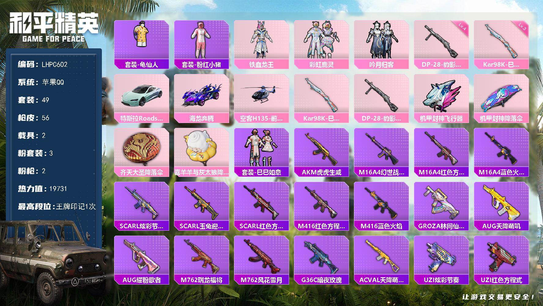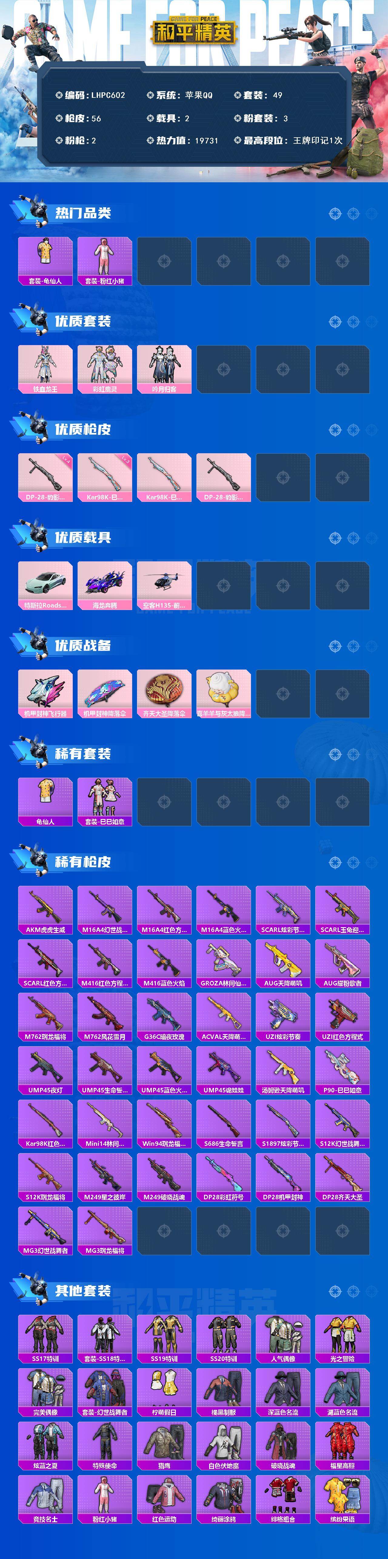 [15758740]可二次【特价急出/详情看图】苹果 手Q-3粉装-2特效枪-2载具-1粉色飞行器-19731热力值-1王牌印记-49套装-56枪皮 【热门品类】:套装-龟仙人,套装-粉红小猪 【粉色套装】:粉装-铁血龙王,粉装-彩虹鹿灵,粉装-吟月归客 【粉色枪皮等级】:Kar98K-巳巳如意(三级),DP-28-豹影疾电(四级) 【粉色载具】:特斯拉Roadster(水滴蓝),海龙奔腾,空客H135-蔚蓝之翼 【粉色枪皮】:Kar98K-巳巳如意,DP-28-豹影疾电 【粉色飞行器】:机甲封神飞行器 【粉色降落伞】:机甲封神降落伞,齐天大圣降落伞,喜羊羊与灰太狼降落伞 【稀有套装】:套装-龟仙人,套装-巳巳如意 【稀有枪皮】:AKM-虎虎生威,M16A4-幻世战舞者,M16A4-红色方程式,M16A4-蓝色火焰,SCAR-L-炫彩节奏,SCAR-L-玉兔迎春,SCAR-L-红色方程式,M416-红色方程式,M416-蓝色火焰,GROZA-林间仙鹿,AUG-天降萌叽,AUG-耀粉歌者,M762-瑞龙福将,M762-风花雪月,G36C-暗夜玫瑰,AC-VAL-天降萌叽,UZI-炫彩节奏,UZI-红色方程式,UMP45-夜灯,UMP45-生命誓言,UMP45-蓝色火焰,UMP45-诡娃娃,汤姆逊-天降萌叽,P90-巳巳如意,Kar98K-红色方程式,Mini14-林间仙鹿,Win94-瑞龙福将,S686-生命誓言,S1897-炫彩节奏,S12K-瑞龙福将,S12K-幻世战舞者,M249-星之彼岸,M249-破晓战魂,DP-28-彩虹符号,DP-28-机甲封神,DP-28-齐天大圣,MG3-幻世战舞者,MG3-瑞龙福将 【其他套装】:套装-SS17特训,套装-SS18特训,套装-SS19特训,套装-SS20特训,套装-人气偶像,套装-光之冒险,套装-完美偶像,套装-幻世战舞者,套装-柠萌假日,套装-橘黑制服,套装-深蓝色名流,套装-湖蓝色名流,套装-炫蓝之夏,套装-特殊使命,套装-猎鹰,套装-白色伏地魔,套装-破晓战魂,套装-福星高照,套装-竞技名士,套装-粉红小猪,套装-红色运动,套装-绮丽涂鸦,套装-绯格组合,套装-缤纷果语,套装-耀粉歌者,套装-蓝色运动,套装-虎虎生威吉莉,套装-都市漫游者,套装-酒红色名流,套装-长空猛禽,套装-青年教官,套装-魅力单车,套装-麻辣教官,套装-黄
