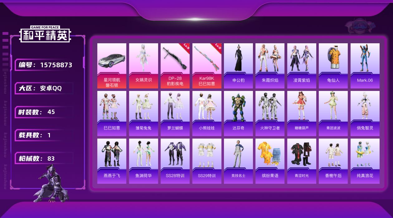 [15758873]【店主推荐捡漏号!可直接换绑】安卓 手Q-无敌战神框-2粉装-2特效枪-1载具-21258热力值-4王牌印记-45套装-83枪皮 【热门品类】:套装-龟仙人,角色-Mark.06 【粉色套装】:角色-女娲灵识 【粉色枪皮等级】:Kar98K-巳巳如意(五级),DP-28-豹影疾电(五级) 【粉色载具】:星河领航(磐石银) 【粉色枪皮】:Kar98K-巳巳如意,DP-28-豹影疾电 【粉色降落伞】:闲梦青缨降落伞,精灵梦叶罗丽降落伞,未来领航者降落伞 【稀有套装】:套装-龟仙人,套装-巳巳如意,套装-雏菊兔兔,套装-萝兰蝴蝶,套装-小熊娃娃,角色-达芬奇,套装-火种守卫者,套装-糖糖葫芦,套装-青团波波,角色-俏兔智灵,套装-燕燕于飞,套装-鱼渊荷华,套装-朱霞炽焰,套装-凌霄紫焰,角色-申公豹 【稀有枪皮】:AKM-破晓战魂,SCAR-L-红色方程式,M416-红色方程式,AUG-耀粉歌者,M762-第五大道,ARX-凌霄紫焰,UZI-天降萌叽,UZI-月影灵韵,汤姆逊-炫彩节奏,JS9-凌霄紫焰,P90-巳巳如意,SKS-迅猛狂鲨,MK12-金蛇镇世,S686-巳巳如意,S686-千金淑猫,S12K-玩趣呆呆,MG3-第五大道,MG-36-凌霄紫焰,P92-凌霄紫焰,平底锅-凌霄紫焰,破片手榴弹-巳巳如意 【其他套装】:套装-SS28特训,套装-SS29特训,套装-竞技名士,套装-缤纷果语,套装-青涩时光,套装-龟仙人,套装-香榭午后,套装-纯真浪花,套装-热情海星,角色-Mark.06 【营地ID】:964899707