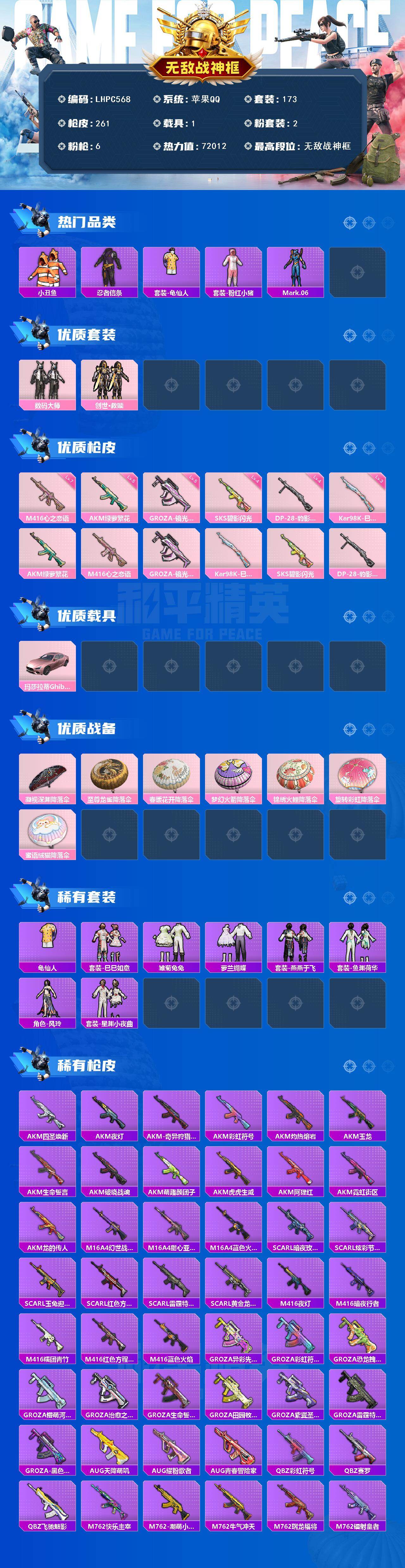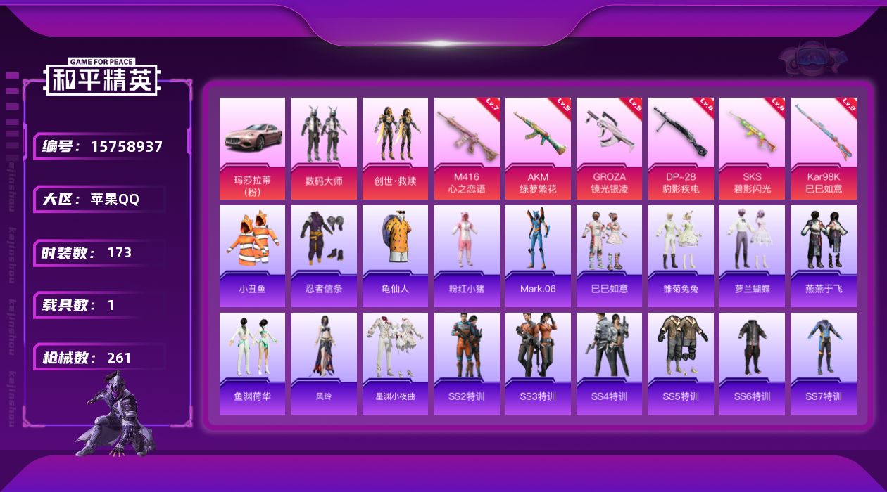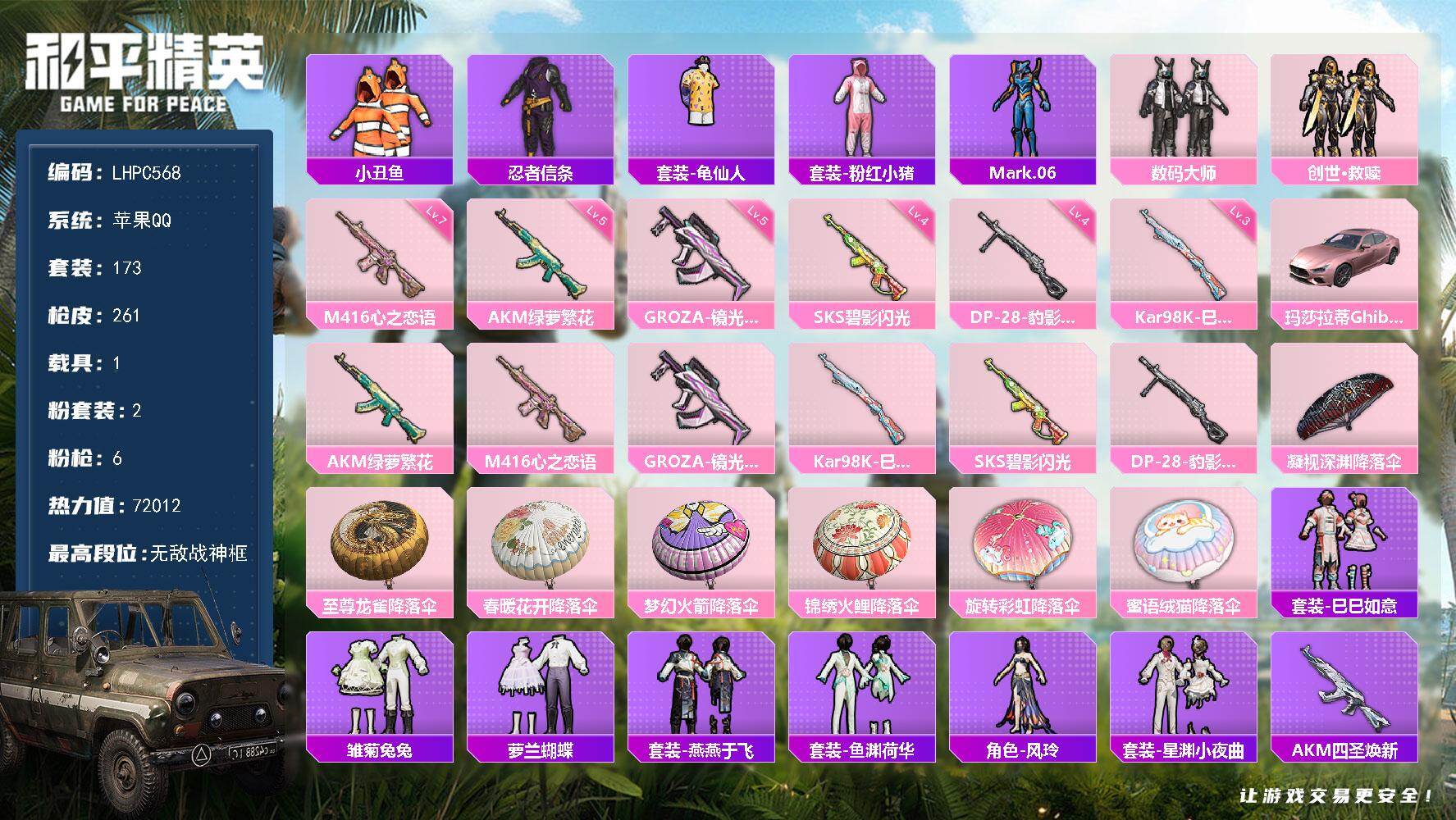 [15758937]可二次【特价出售/店主推荐】苹果 手Q-无敌战神框-2粉装-6特效枪-1载具-0粉色飞行器-72012热力值-21王牌印记-173套装-261枪皮 【热门品类】:套装-小丑鱼,套装-忍者信条,套装-龟仙人,套装-粉红小猪,角色-Mark.06 【粉色套装】:粉装-数码大师,套装-创世·救赎 【粉色枪皮等级】:AKM-绿萝繁花(五级),M416-心之恋语(七级),GROZA-镜光银凌(五级),Kar98K-巳巳如意(三级),SKS-碧影闪光(四级),DP-28-豹影疾电(四级) 【粉色载具】:玛莎拉蒂Ghibli(粉) 【粉色枪皮】:AKM-绿萝繁花,M416-心之恋语,GROZA-镜光银凌,Kar98K-巳巳如意,SKS-碧影闪光,DP-28-豹影疾电 【粉色降落伞】:凝视深渊降落伞,至尊龙雀降落伞,春暖花开降落伞,梦幻火箭降落伞,锦绣火鲤降落伞,旋转彩虹降落伞,蜜语绒猫降落伞,炫彩糖果降落伞 【稀有套装】:套装-龟仙人,套装-巳巳如意,套装-雏菊兔兔,套装-萝兰蝴蝶,套装-燕燕于飞,套装-鱼渊荷华,角色-风玲,套装-星渊小夜曲 【稀有枪皮】:AKM-四圣焕新,AKM-夜灯,AKM-奇异狩猎者,AKM-彩虹符号,AKM-灼热熔岩,AKM-玉龙,AKM-生命誓言,AKM-破晓战魂,AKM-萌趣颜团子,AKM-虎虎生威,AKM-阿狸红,AKM-霓虹街区,AKM-龙的传人,M16A4-幻世战舞者,M16A4-甜心亚梦,M16A4-蓝色火焰,SCAR-L-暗夜玫瑰,SCAR-L-炫彩节奏,SCAR-L-玉兔迎春,SCAR-L-红色方程式,SCAR-L-雷霆特警,SCAR-L-黄金龙骨,M416-夜灯,M416-暗夜行者,M416-糯团青竹,M416-红色方程式,M416-蓝色火焰,GROZA-异彩先驱,GROZA-彩虹符号,GROZA-恐龙拽拽,GROZA-懵萌河马,GROZA-治愈之星,GROZA-生命誓言,GROZA-田园牧歌,GROZA-紫翼圣骑,GROZA-雷霆特警,GROZA-黑色刀锋,AUG-天降萌叽,AUG-耀粉歌者,AUG-青春冒险家,QBZ-彩虹符号,QBZ-赛罗,QBZ-飞驰魅影,M762-快乐主宰,M762-潮萌小黄鸭,M762-牛气冲天,M762-瑞龙福将,M762-镭射皇者,G36C-懵萌河马,G36C-时空追击者,AC-VAL-天降萌叽,AC-