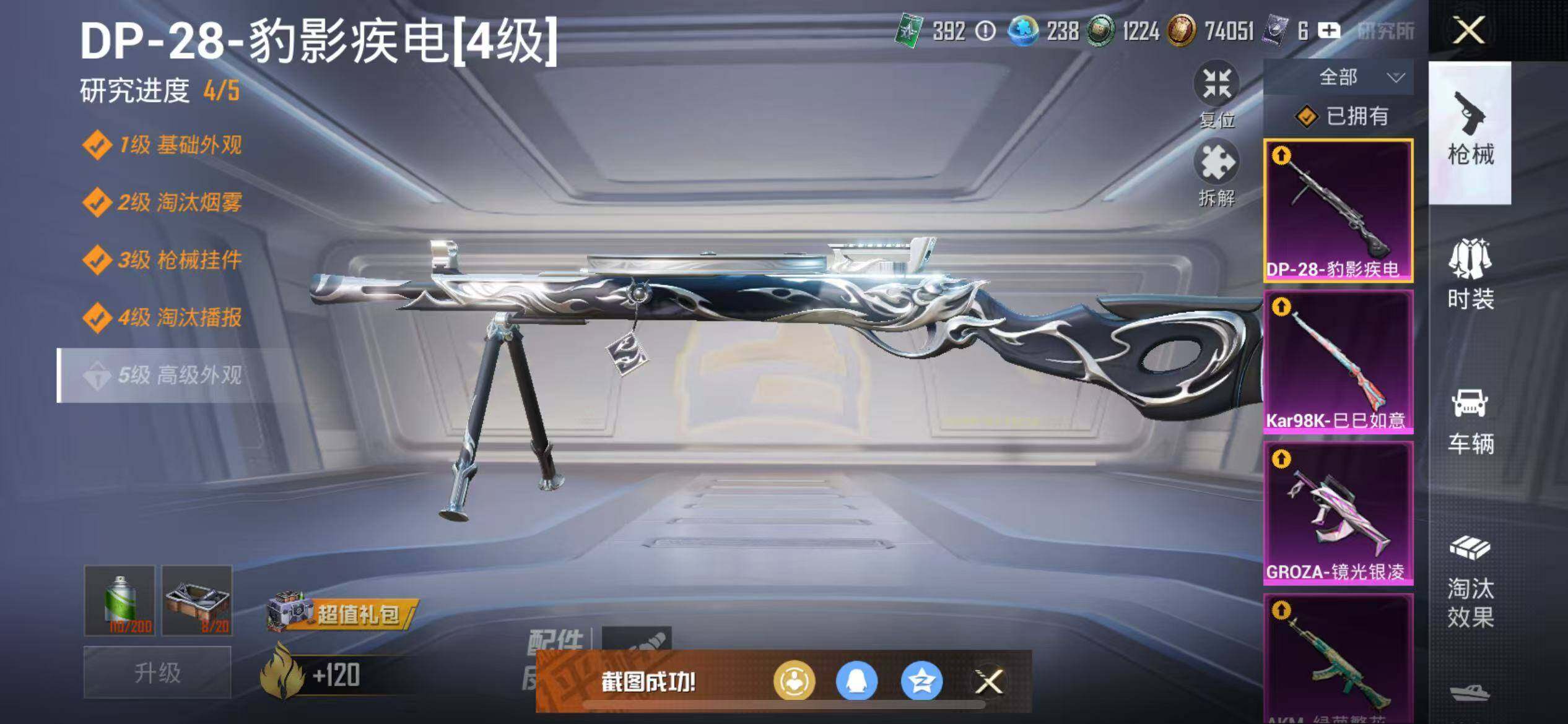 【粉色枪皮等级】:AKM-绿萝繁花(五级),M416-心之恋语(七级),GROZA-镜光银凌(五级),Kar98K-巳巳如意(三级),SKS-碧影闪光(四级),DP-28-豹影疾电(四级)