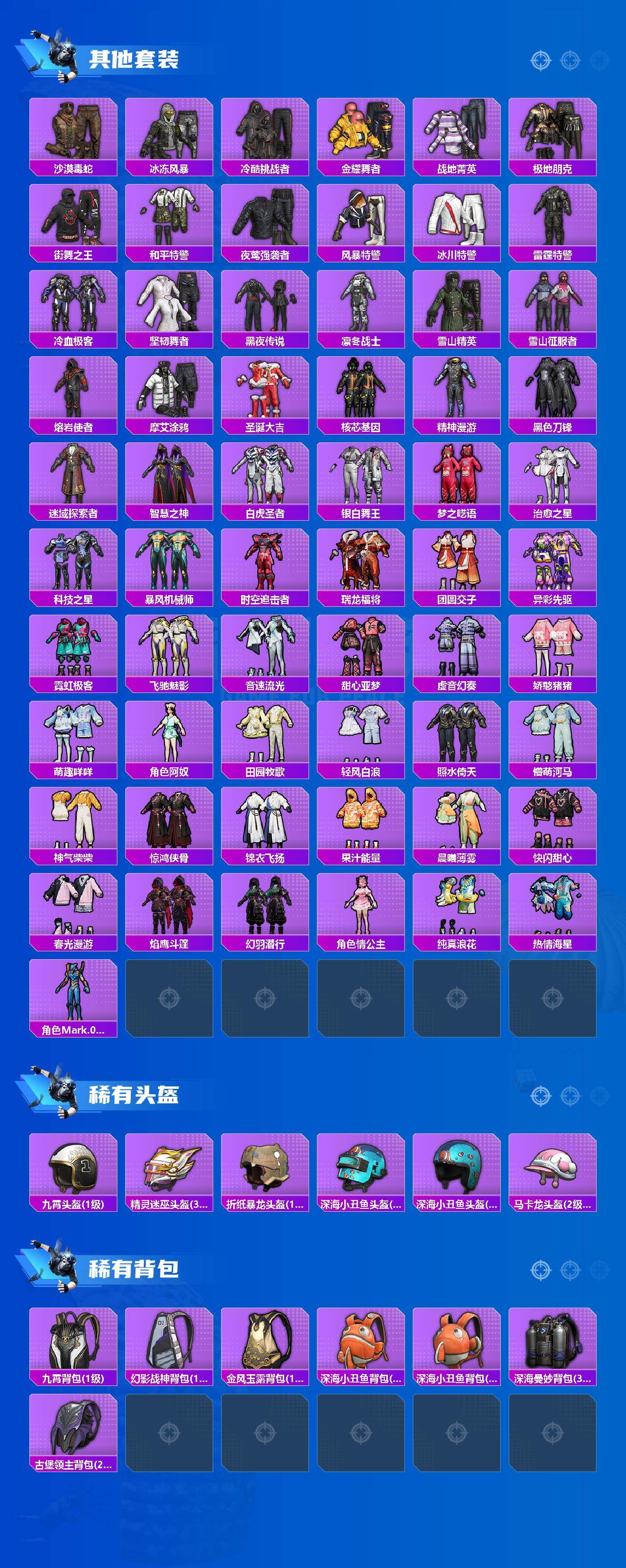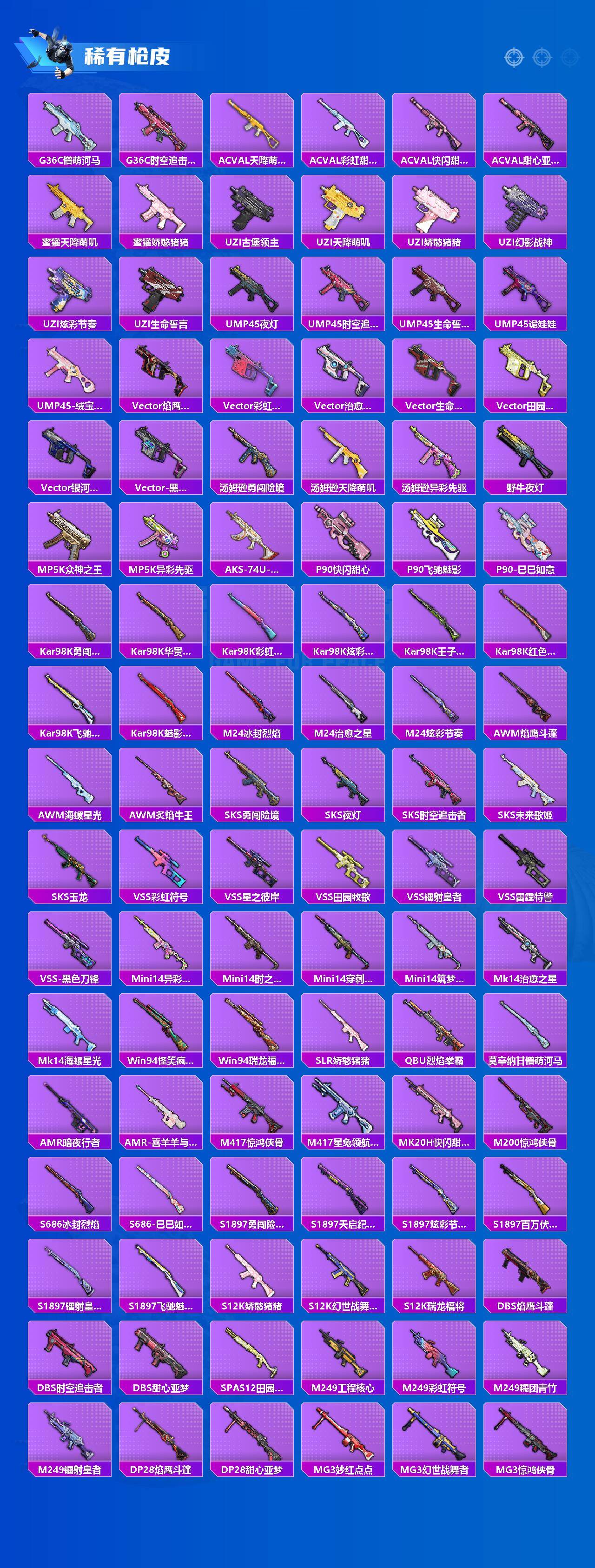 【稀有枪皮】:AKM-四圣焕新,AKM-夜灯,AKM-奇异狩猎者,AKM-彩虹符号,AKM-灼热熔岩,AKM-玉龙,AKM-生命誓言,AKM-破晓战魂,AKM-萌趣颜团子,AKM-虎虎生威,AKM-阿狸红,AKM-霓虹街区,AKM-龙的传人,M16A4-幻世战舞者,M16A4-甜心亚梦,M16A4-蓝色火焰,SCAR-L-暗夜玫瑰,SCAR-L-炫彩节奏,SCAR-L-玉兔迎春,SCAR-L-红色方程式,SCAR-L-雷霆特警,SCAR-L-黄金龙骨,M416-夜灯,M416-暗夜行者,M416-糯团青竹,M416-红色方程式,M416-蓝色火焰,GROZA-异彩先驱,GROZA-彩虹符号,GROZA-恐龙拽拽,GROZA-懵萌河马,GROZA-治愈之星,GROZA-生命誓言,GROZA-田园牧歌,GROZA-紫翼圣骑,GROZA-雷霆特警,GROZA-黑色刀锋,AUG-天降萌叽,AUG-耀粉歌者,AUG-青春冒险家,QBZ-彩虹符号,QBZ-赛罗,QBZ-飞驰魅影,M762-快乐主宰,M762-潮萌小黄鸭,M762-牛气冲天,M762-瑞龙福将,M762-镭射皇者,G36C-懵萌河马,G36C-时空追击者,AC-VAL-天降萌叽,AC-