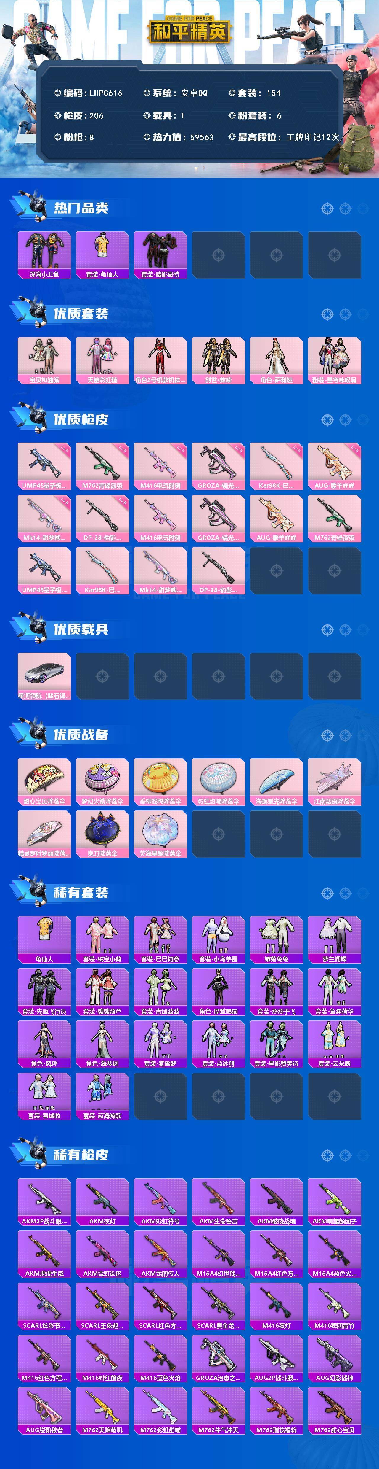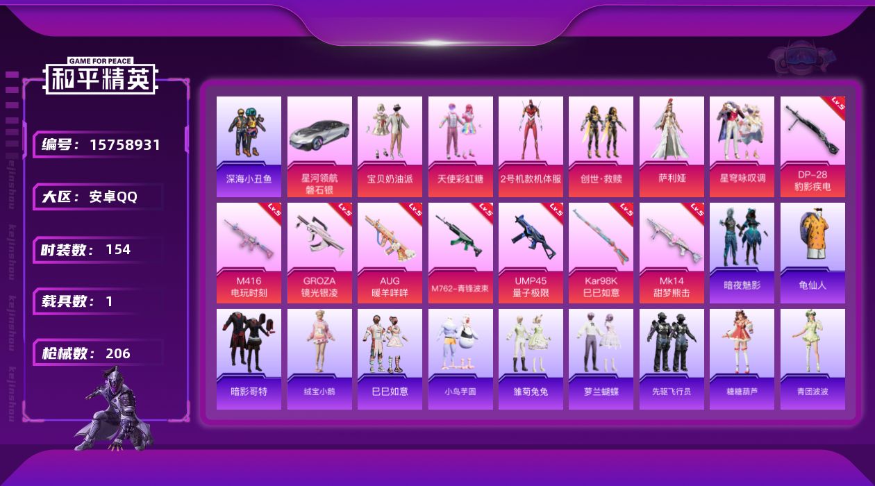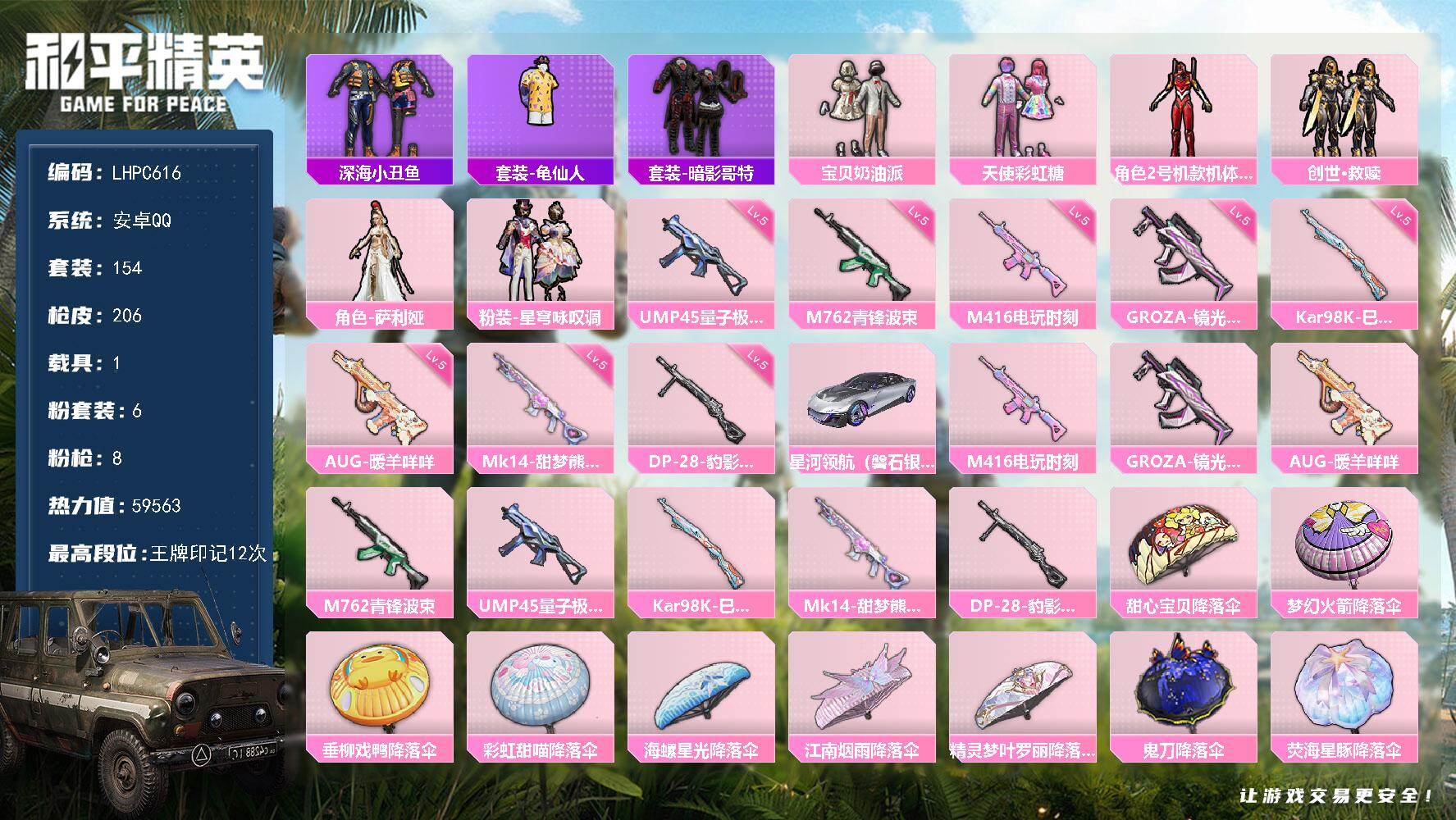 [15758931]可二次【特价出售/店主推荐】安卓 手Q-6粉装-8特效枪-1载具-1粉色飞行器-59563热力值-12王牌印记-154套装-206枪皮 【热门品类】:套装-深海小丑鱼,套装-龟仙人,套装-暗影哥特 【粉色套装】:粉装-宝贝奶油派,粉装-天使彩虹糖,角色-2号机款机体服,套装-创世·救赎,角色-萨利娅,粉装-星穹咏叹调 【粉色枪皮等级】:M416-电玩时刻(五级),GROZA-镜光银凌(五级),AUG-暖羊咩咩(五级),M762-青锋波束(五级),UMP45-量子极限(五级),Kar98K-巳巳如意(五级),Mk14-甜梦熊击(五级),DP-28-豹影疾电(五级) 【粉色载具】:星河领航(磐石银) 【粉色枪皮】:M416-电玩时刻,GROZA-镜光银凌,AUG-暖羊咩咩,M762-青锋波束,UMP45-量子极限,Kar98K-巳巳如意,Mk14-甜梦熊击,DP-28-豹影疾电 【粉色降落伞】:甜心宝贝降落伞,梦幻火箭降落伞,垂柳戏鸭降落伞,彩虹甜喵降落伞,海螺星光降落伞,江南烟雨降落伞,精灵梦叶罗丽降落伞,鬼刀降落伞,荧海星豚降落伞,炫彩糖果降落伞 【稀有套装】:套装-龟仙人,套装-绒宝小鹅,套装-巳巳如意,套装-小鸟芋圆,套装-雏菊兔兔,套装-萝兰蝴蝶,套装-先驱飞行员,套装-糖糖葫芦,套装-青团波波,角色-摩登魅猫,套装-燕燕于飞,套装-鱼渊荷华,角色-风玲,角色-海琴烟,套装-紫幽梦,套装-蓝冰羽,套装-星影赞美诗,套装-云朵鹅,套装-雪绒豹,套装-蓝海鲸歌,套装-炫彩糖果 【稀有枪皮】:AKM-2P战斗服款,AKM-夜灯,AKM-彩虹符号,AKM-生命誓言,AKM-破晓战魂,AKM-萌趣颜团子,AKM-虎虎生威,AKM-霓虹街区,AKM-龙的传人,M16A4-幻世战舞者,M16A4-红色方程式,M16A4-蓝色火焰,SCAR-L-炫彩节奏,SCAR-L-玉兔迎春,SCAR-L-红色方程式,SCAR-L-黄金龙骨,M416-夜灯,M416-糯团青竹,M416-红色方程式,M416-绯红前夜,M416-蓝色火焰,GROZA-治愈之星,AUG-2P战斗服款,AUG-幻影战神,AUG-耀粉歌者,M762-天降萌叽,M762-彩虹甜喵,M762-牛气冲天,M762-瑞龙福将,M762-甜心宝贝,M762-绯红前夜,M762-云朵鹅,Mk47-妙红点点,G36C-星穹咏