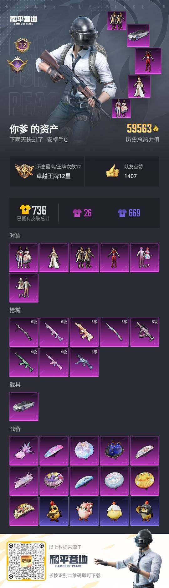 - [15381884]老101【特价出售/店主推荐】安卓 手Q-3粉装-2特效枪-0载具-2粉色飞行器-33954热力值-3王牌印记-113套装-107枪皮【热门品类】:套装-火箭少女101,套装-胖达团团,套装-SS1特训,套装-暗影哥特,套装-浪漫波比【粉色套装】:粉装-第五大道,粉装-萌物绒绒,角色-白兰星【粉色枪皮等级】:Kar98K-巳巳如意(五级),M417-第五大道(五级)【粉色枪皮】:Kar98K-巳巳如意,M417-第五大道【粉色飞行器】:萌物绒绒飞行器,镜域双华-灵镜之阶