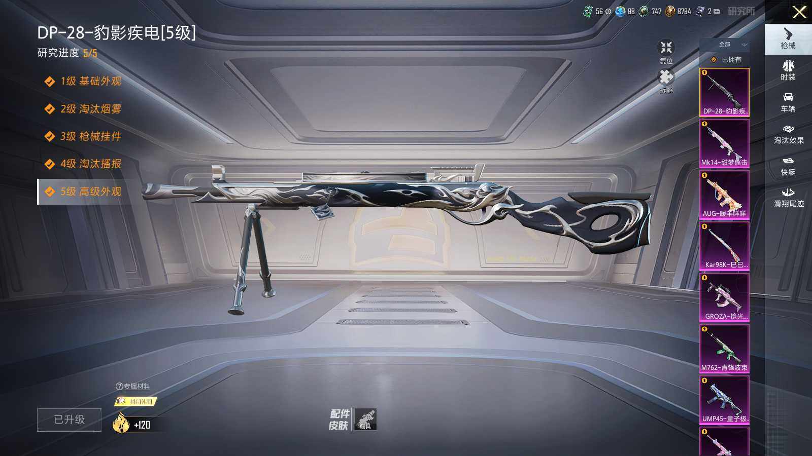 【粉色枪皮等级】:M416-电玩时刻(五级),GROZA-镜光银凌(五级),AUG-暖羊咩咩(五级),M762-青锋波束(五级),UMP45-量子极限(五级),Kar98K-巳巳如意(五级),Mk14-甜梦熊击(五级),DP-28-豹影疾电(五级)