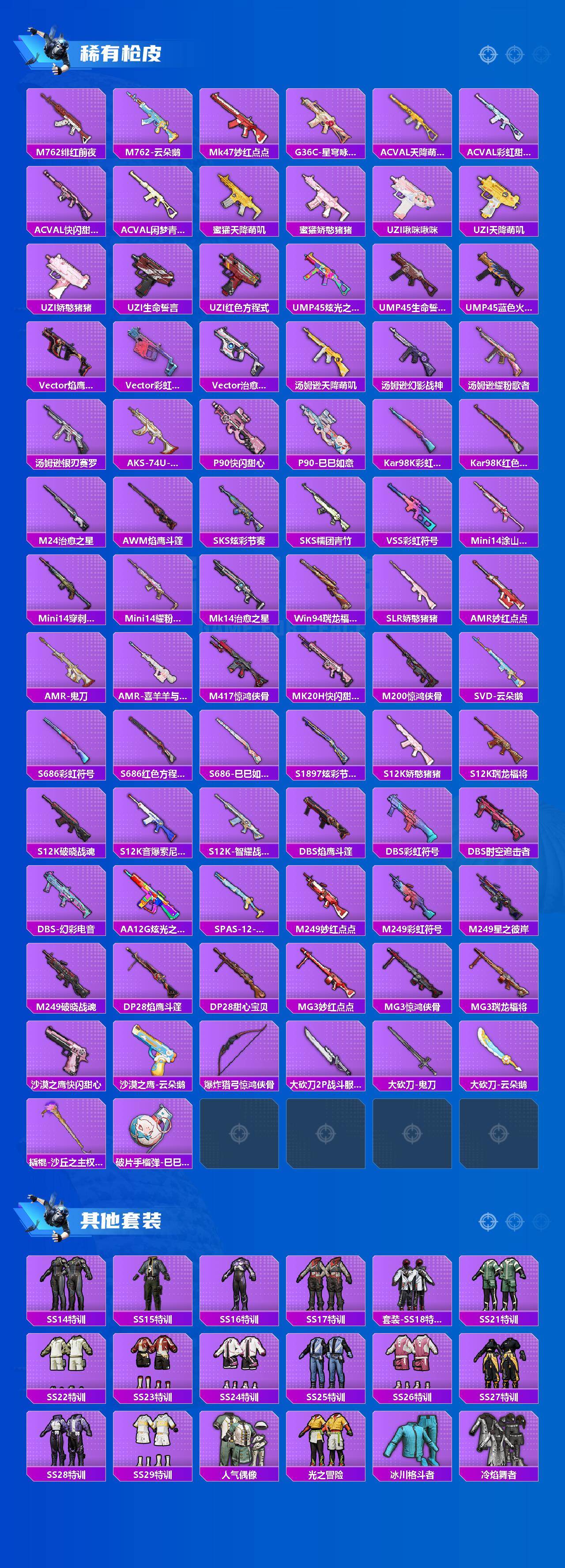 【稀有枪皮】:AKM-2P战斗服款,AKM-夜灯,AKM-彩虹符号,AKM-生命誓言,AKM-破晓战魂,AKM-萌趣颜团子,AKM-虎虎生威,AKM-霓虹街区,AKM-龙的传人,M16A4-幻世战舞者,M16A4-红色方程式,M16A4-蓝色火焰,SCAR-L-炫彩节奏,SCAR-L-玉兔迎春,SCAR-L-红色方程式,SCAR-L-黄金龙骨,M416-夜灯,M416-糯团青竹,M416-红色方程式,M416-绯红前夜,M416-蓝色火焰,GROZA-治愈之星,AUG-2P战斗服款,AUG-幻影战神,AUG-耀粉歌者,M762-天降萌叽,M762-彩虹甜喵,M762-牛气冲天,M762-瑞龙福将,M762-甜心宝贝,M762-绯红前夜,M762-云朵鹅,Mk47-妙红点点,G36C-星穹咏