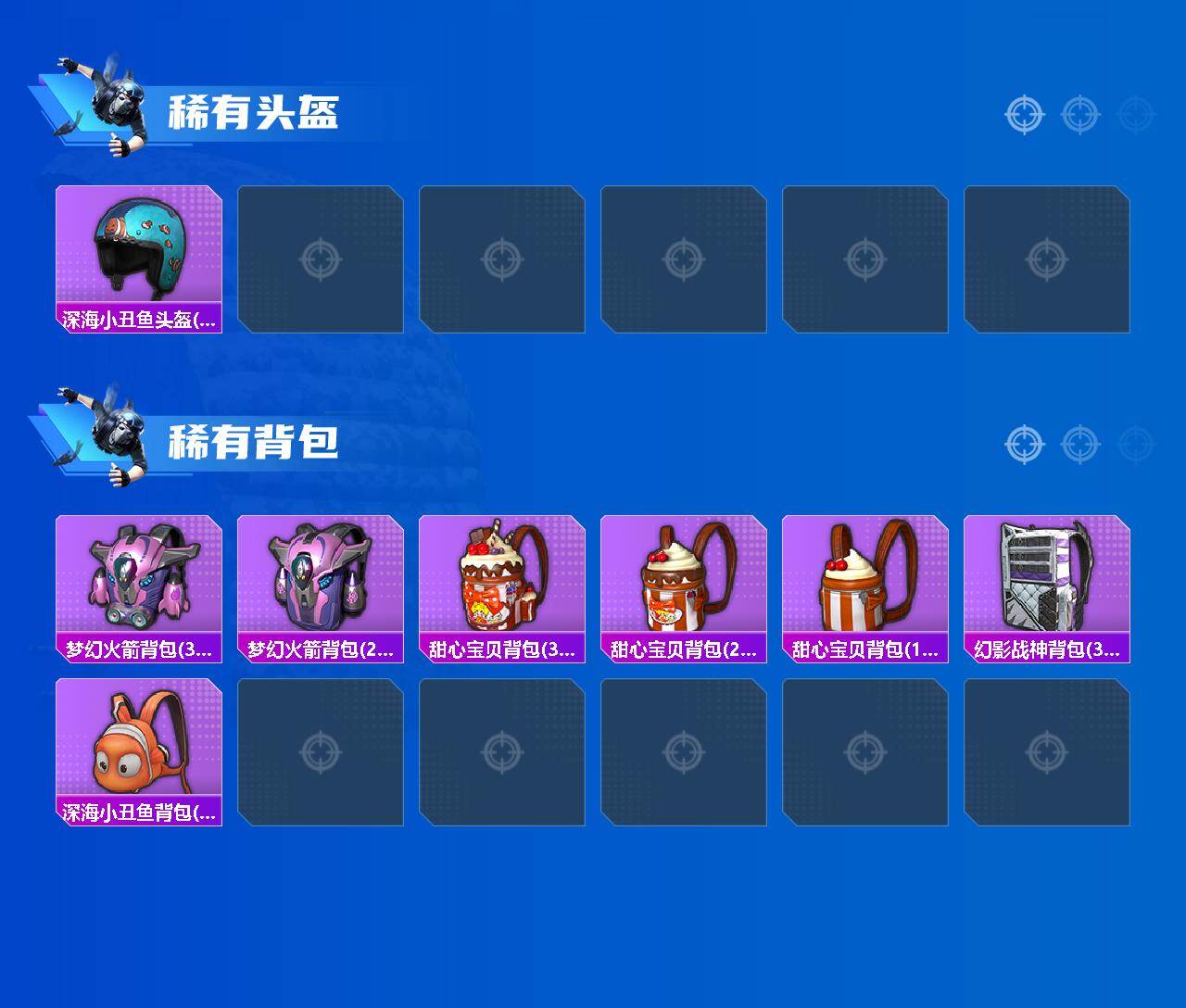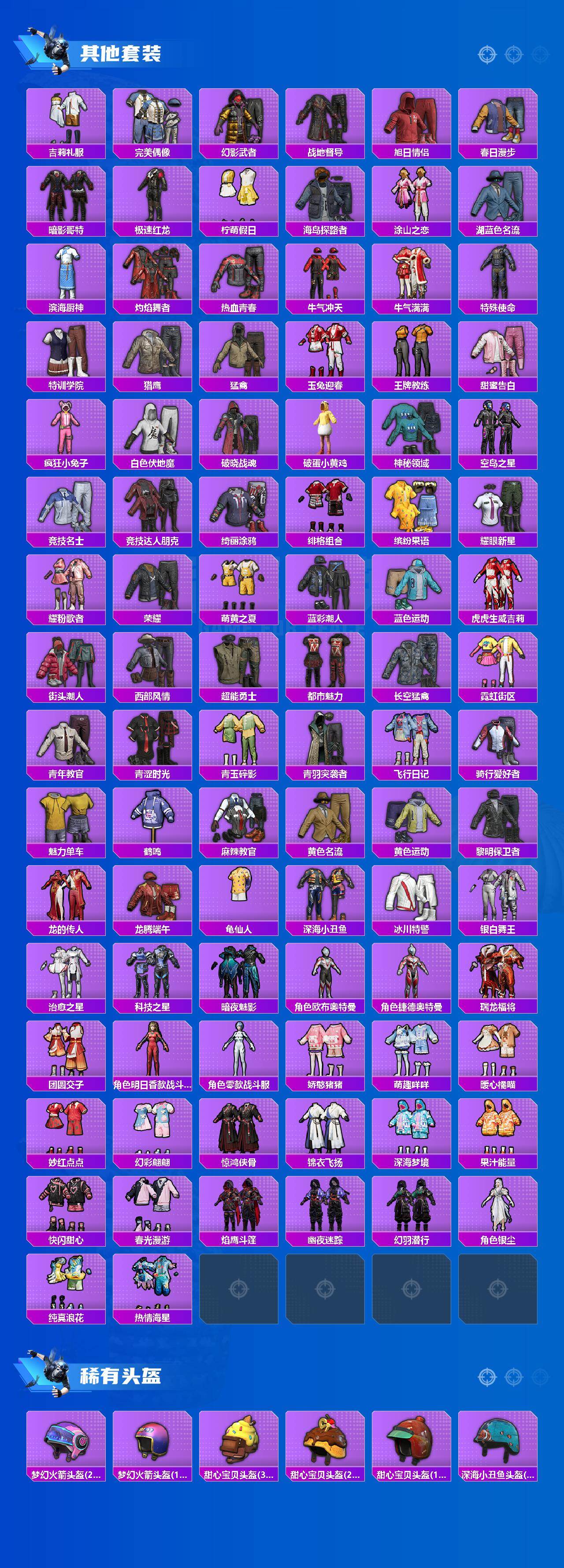 【稀有套装】:套装-龟仙人,套装-绒宝小鹅,套装-巳巳如意,套装-小鸟芋圆,套装-雏菊兔兔,套装-萝兰蝴蝶,套装-先驱飞行员,套装-糖糖葫芦,套装-青团波波,角色-摩登魅猫,套装-燕燕于飞,套装-鱼渊荷华,角色-风玲,角色-海琴烟,套装-紫幽梦,套装-蓝冰羽,套装-星影赞美诗,套装-云朵鹅,套装-雪绒豹,套装-蓝海鲸歌,套装-炫彩糖果