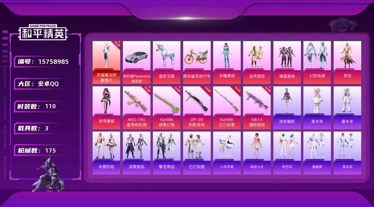 [15758985]安卓 手Q-1神装-6粉装-5特效枪-3载具-4粉色飞行器-58346热力值-6王牌印记-110套装-175枪皮 【红色神装等级】:灵猫魔法师-塞维尔(二级) 【红色角色神装】:灵猫魔法师-塞维尔 【粉色套装】:粉装-金风银杏,粉装-暗星紫秘,粉装-幻彩电音,角色-罗征,角色-绯穹魔姬,角色-异瞳寒姬 【粉色枪皮等级】:AKS-74U-星穹咏叹调(六级),Kar98K-绿意幻情(六级),Kar98K-巳巳如意(五级),Mk14-爆裂游戏(五级),DP-28-豹影疾电(五级) 【粉色载具】:保时捷Panamera(星辰紫),星梦玉骢,辉羽雀灵自行车 【粉色枪皮】:AKS-74U-星穹咏叹调,Kar98K-绿意幻情,Kar98K-巳巳如意,Mk14-爆裂游戏,DP-28-豹影疾电 【粉色飞行器】:繁龙极客飞行器,时光之誓飞行器,灵猫魔法师飞行器,灵珠游龙飞行器 【粉色降落伞】:春暖花开降落伞,星之彼岸降落伞,葫芦兄弟降落伞,焰龙焚天降落伞,暗夜玫瑰降落伞,蓝莓炮弹降落伞,绿意幻情降落伞,橘柚倾心降落伞,猪猪侠降落伞,智耀战神降落伞,辉羽雀灵降落伞,幻彩电音降落伞,双重狂想降落伞,冷漠罗丽降落伞,灵猫魔法师降落伞,喜羊羊与灰太狼降落伞,魔童闹海 敖丙降落伞,异瞳寒姬降落伞,炫彩糖果降落伞 【稀有套装】:套装-巳巳如意,套装-小鸟芋圆,角色-临安公主,套装-粉恋花,套装-紫幽梦,套装-蓝冰羽,套装-星影赞美诗,套装-彩虹兔,套装-云朵鹅,套装-雪绒豹,套装-诡诞巡游,角色-时希公主,角色-灵公主,角色-乐音,套装-朱霞炽焰,套装-凌霄紫焰,套装-擎苍青焰,玩偶服-美羊羊,玩偶服-喜羊羊,角色-绯色魅影 【稀有枪皮】:AKM-夜灯,AKM-星之彼岸,AKM-灼热熔岩,AKM-破晓战魂,AKM-虎虎生威,AKM-龙的传人,M16A4-幻世战舞者,M16A4-红色方程式,M16A4-蓝色火焰,M16A4-最终圣卫者,SCAR-L-炫彩节奏,SCAR-L-玉兔迎春,SCAR-L-红色方程式,SCAR-L-冷漠罗丽,M416-红色方程式,M416-蓝色火焰,GROZA-异彩先驱,GROZA-蓝莓炮弹,AUG-耀粉歌者,QBZ-彩虹符号,QBZ-飞驰魅影,M762-天降萌叽,M762-牛气冲天,M762-瑞龙福将,M762-风花雪月,M762-云朵鹅,G36C-星穹咏叹调,AC-VA
