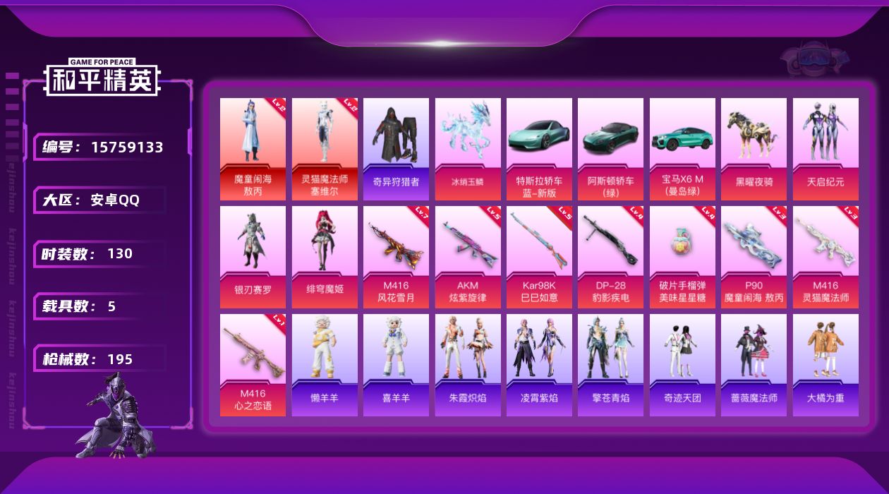 [15759133]【特价出售/店主推荐】安卓 手Q-2神装-3粉装-8特效枪-5载具-3粉色飞行器-72603热力值-6王牌印记-130套装-195枪皮 【红色神装等级】:魔童闹海-敖丙(二级),灵猫魔法师-塞维尔(二级) 【红色角色神装】:魔童闹海-敖丙,灵猫魔法师-塞维尔 【热门品类】:套装-奇异狩猎者,套装-粉红小猪 【粉色套装】:粉装-天启纪元,粉装-银刃赛罗,角色-绯穹魔姬 【粉色枪皮等级】:AKM-炫紫旋律(五级),M416-心之恋语(一级),M416-风花雪月(七级),M416-灵猫魔法师(三级),P90-魔童闹海 敖丙(三级),Kar98K-巳巳如意(五级),DP-28-豹影疾电(四级),破片手榴弹-美味星星糖(四级) 【粉色载具】:特斯拉Roadster(水滴蓝),阿斯顿马丁DBS(绿),宝马X6 M(曼岛绿),空客H135-蔚蓝之翼,黑曜夜骑,冰绡玉鳞 【粉色枪皮】:AKM-炫紫旋律,M416-心之恋语,M416-风花雪月,M416-灵猫魔法师,P90-魔童闹海 敖丙,Kar98K-巳巳如意,DP-28-豹影疾电,破片手榴弹-美味星星糖 【粉色飞行器】:精灵迷巫飞行器,灵猫魔法师飞行器,灵珠游龙飞行器 【粉色降落伞】:精灵迷巫降落伞,金风玉露降落伞,炫紫旋律降落伞,繁花小夜曲降落伞,甜蜜誓约降落伞,四圣焕新降落伞,马卡龙降落伞,潮汐统领降落伞,荧光虫舞降落伞,齐天大圣降落伞,庄周梦蝶降落伞,暗夜鎏金降落伞,第五大道降落伞,灵猫魔法师降落伞,桃源时光降落伞,魔童闹海 敖丙降落伞 【稀有套装】:套装-彩虹兔,套装-云朵鹅,套装-雪绒豹,角色-灵公主,套装-朱霞炽焰,套装-凌霄紫焰,套装-擎苍青焰,玩偶服-懒羊羊,玩偶服-喜羊羊 【稀有枪皮】:AKM-四圣焕新,AKM-夜灯,AKM-彩虹符号,AKM-星之彼岸,AKM-灼热熔岩,AKM-虎虎生威,AKM-霓虹街区,AKM-灵猫魔法师,M16A4-九霄,M16A4-幻世战舞者,M16A4-机械英豪,M16A4-魔法学院,SCAR-L-扶摇飞仙,SCAR-L-炫彩节奏,SCAR-L-生命誓言,SCAR-L-金风玉露,SCAR-L-冷漠罗丽,M416-神秘黑猫,M416-红色方程式,M416-蓝色火焰,GROZA-彩虹符号,GROZA-恐龙拽拽,GROZA-治愈之星,GROZA-黑色刀锋,AUG-耀粉歌者,AUG-魔法学院,