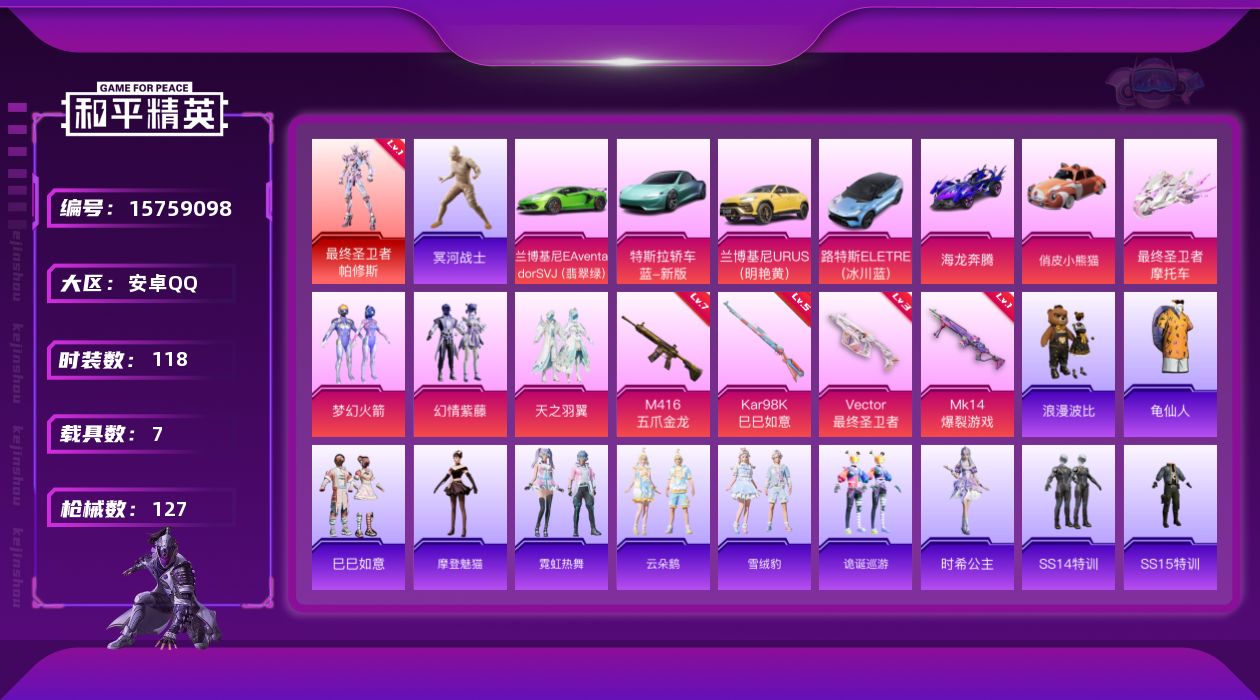 [15759098]【店主推荐捡漏号!可直接换绑】安卓 手Q-1神装-3粉装-4特效枪-7载具-3粉色飞行器-48962热力值-5王牌印记-118套装-127枪皮 【红色神装等级】:最终圣卫者-帕修斯(一级) 【红色角色神装】:最终圣卫者-帕修斯 【热门品类】:粉装-梦幻火箭,套装-冥河战士,套装-龟仙人,套装-浪漫波比 【粉色套装】:粉装-梦幻火箭,粉装-幻情紫藤,粉装-天之羽翼 【粉色枪皮等级】:M416-五爪金龙(七级),Vector-最终圣卫者(三级),Kar98K-巳巳如意(五级),Mk14-爆裂游戏(一级) 【粉色载具】:特斯拉Roadster(水滴蓝),兰博基尼Aventador SVJ(翡翠绿),兰博基尼URUS(明艳黄),路特斯ELETRE(冰川蓝),海龙奔腾,俏皮小熊猫,最终圣卫者摩托车 【粉色枪皮】:M416-五爪金龙,Vector-最终圣卫者,Kar98K-巳巳如意,Mk14-爆裂游戏 【粉色飞行器】:绿意幻情飞行器,天之羽翼飞行器,终晖之翼飞行器 【粉色降落伞】:春暖花开降落伞,绿意幻情降落伞,天之羽翼降落伞,双重狂想降落伞,最终圣卫者降落伞 【稀有套装】:套装-龟仙人,套装-巳巳如意,角色-摩登魅猫,套装-霓虹热舞,套装-云朵鹅,套装-雪绒豹,套装-诡诞巡游,角色-时希公主 【稀有枪皮】:AKM-彩虹符号,AKM-破晓战魂,AKM-萌趣颜团子,AKM-虎虎生威,AKM-龙的传人,M16A4-冥河战士,M16A4-幻世战舞者,M16A4-甜心亚梦,M16A4-蓝色火焰,M16A4-最终圣卫者,SCAR-L-炫彩节奏,SCAR-L-生命誓言,M416-夜灯,M416-红色方程式,M416-蓝色火焰,GROZA-异彩先驱,GROZA-彩虹符号,AUG-天降萌叽,AUG-青春冒险家,QBZ-彩虹符号,QBZ-飞驰魅影,M762-天降萌叽,M762-烈焰拳霸,M762-瑞龙福将,M762-云朵鹅,Mk47-天之羽翼,Mk47-洛神天依,Mk47-炫光之旅,Mk47-青春冒险家,G36C-时空追击者,AC-VAL-甜心亚梦,蜜獾-天降萌叽,UZI-啾咪啾咪,UZI-天降萌叽,UZI-炫彩节奏,UMP45-时空追击者,Vector-夜灯,汤姆逊-异彩先驱,野牛-夜灯,野牛-青春冒险家,野牛-最终圣卫者,MP5K-异彩先驱,P90-飞驰魅影,P90-巳巳如意,Kar98K