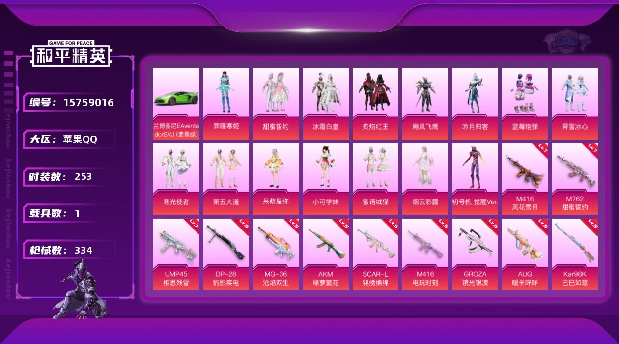 [15759016]苹果 手Q-16粉装-12特效枪-1载具-4粉色飞行器-114758热力值-21王牌印记-253套装-334枪皮