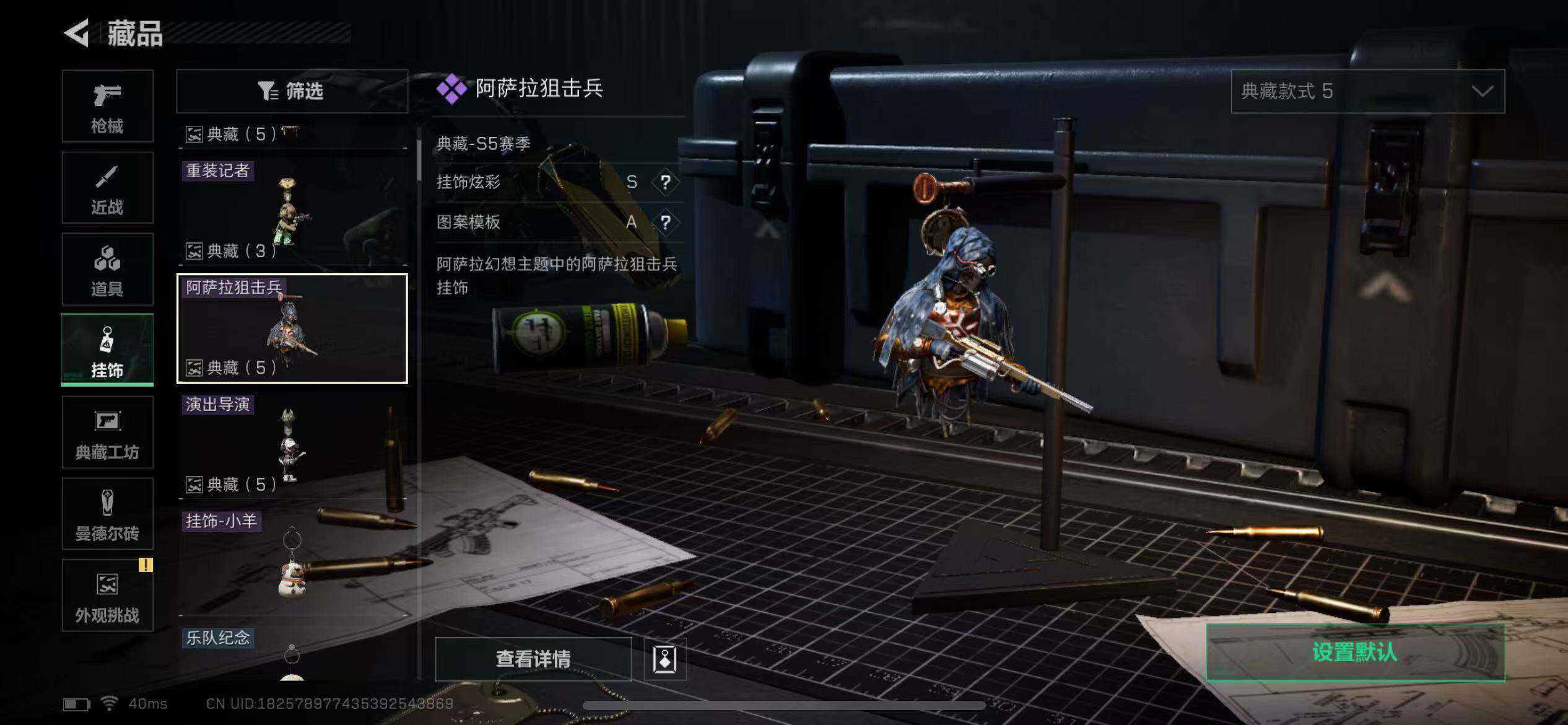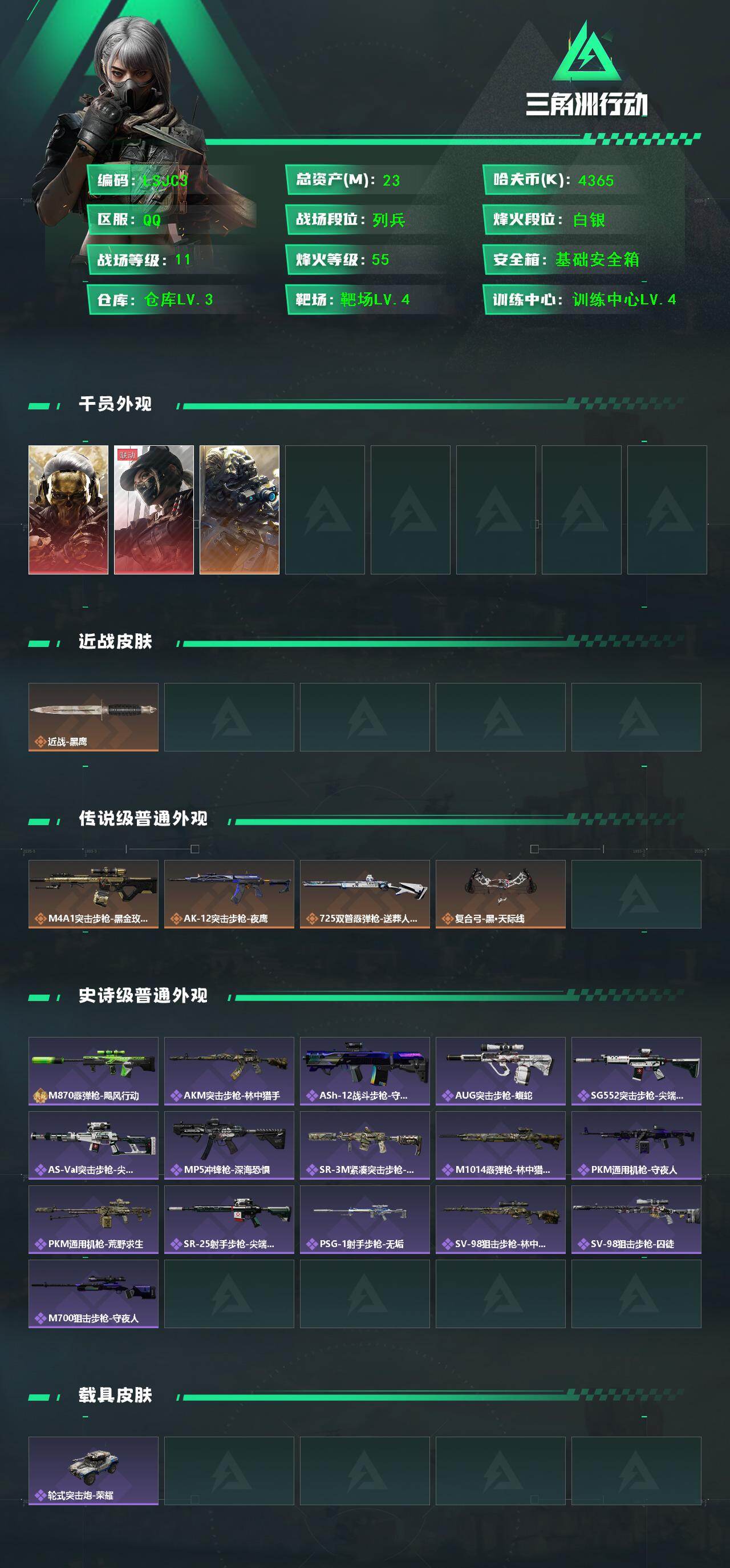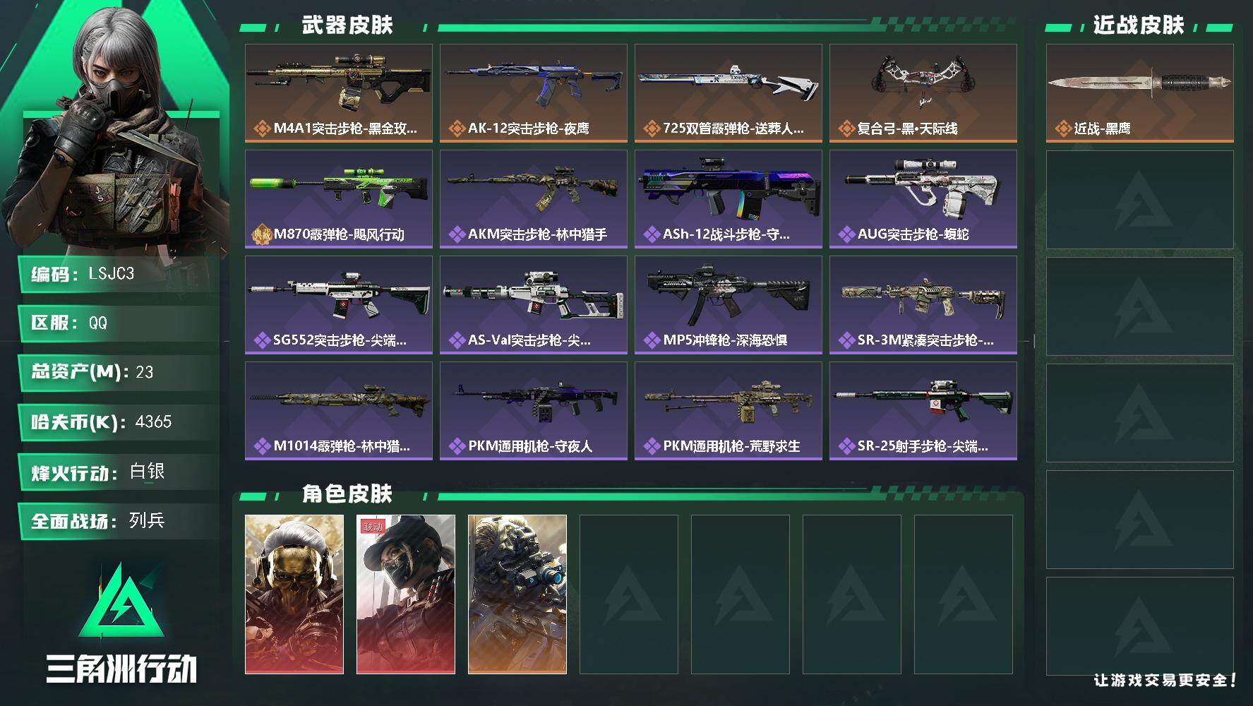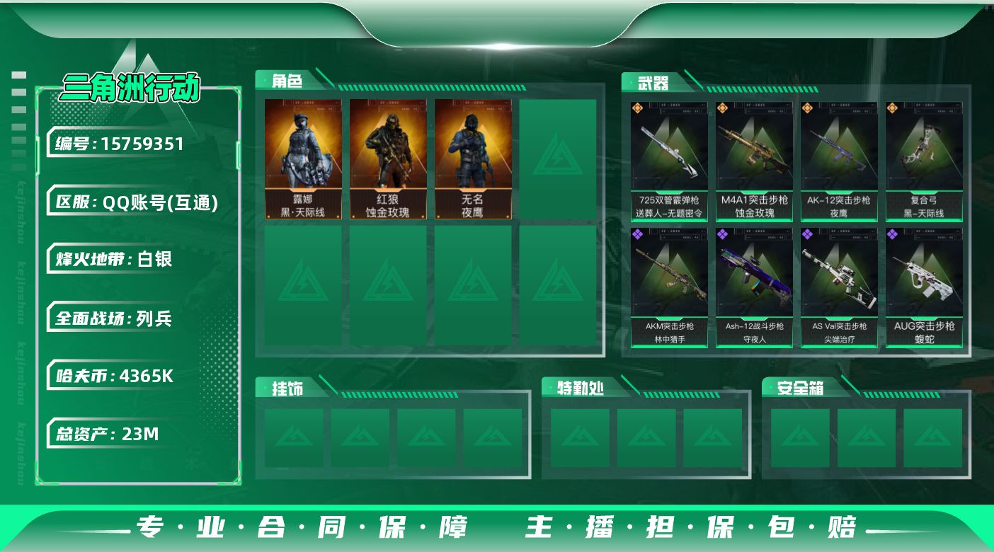 [15759351]23m总资产-4365k哈伏币-55烽火等级-白银-11战场等级-列兵 【干员外观】:红狼-蚀金玫瑰,露娜-黑·天际线,无名-夜鹰 【近战皮肤】:近战-黑鹰 【传说外观】:M4A1突击步枪-蚀金玫瑰,AK-12突击步枪-夜鹰,725双管霰弹枪-送葬人-无题密令,复合弓-黑·天际线 【史诗外观】:M870霰弹枪-飓风行动,AKM突击步枪-林中猎手,ASh-12战斗步枪-守夜人,AUG突击步枪-蝮蛇,SG552突击步枪-尖端治疗,AS Val突击步枪-尖端治疗,MP5冲锋枪-深海恐惧,SR-3M紧凑突击步枪-荒野求生,M1014霰弹枪-林中猎手,PKM通用机枪-守夜人,PKM通用机枪-荒野求生,SR-25射手步枪-尖端治疗,PSG-1射手步枪-无垢,SV-98狙击步枪-林中猎手,SV-98狙击步枪-囚徒,M700狙击步枪-守夜人 【稀有外观】:K416突击步枪-虎啸,M16A4突击步枪-远航,M7战斗步枪-捣蛋鬼,SCAR-H战斗步枪-远航,SCAR-H战斗步枪-荣耀列队,PTR-32突击步枪-天网,PTR-32突击步枪-英雄,腾龙突击步枪-雪崩,MP5冲锋枪-弄臣,P90冲锋枪-浅鲨小队,P90冲锋枪-新生,Vector冲锋枪-先锋,野牛冲锋枪-新生,SMG-45-行动开启,SMG-45冲锋枪-幻影结构,SR-3M紧凑突击步枪-雪崩,MP7冲锋枪-幻影结构,M1014霰弹枪-幻影结构,M250通用机枪-虎啸,M250通用机枪-天网,QJB201轻机枪-远航,Mini-14射手步枪-荣耀列队,SKS射手步枪-弄臣,SR-25射手步枪-开拓,SV-98狙击步枪-星链科技,SV-98狙击步枪-哈夫克航天,SV-98狙击步枪-精英联盟,R93狙击步枪-远航 【普通外观】:M4A1突击步枪-粉色涂装,M4A1突击步枪-高雅黑,M4A1突击步枪-海色,AKM突击步枪-彩墨喷涂,QBZ95-1突击步枪-高雅黑,QBZ95-1突击步枪-海浪,QBZ95-1突击步枪-海色,K416突击步枪-几何迷彩,K416突击步枪-高雅黑,M16A4突击步枪-山林猎人,AUG突击步枪-浅蓝涂装,AUG突击步枪-落花,M7战斗步枪-红色涂装,M7战斗步枪-落花,SG552突击步枪-浅蓝涂装,SG552突击步枪-海浪,SG552突击步枪-彩墨喷涂,AK-12突击步枪-坚固材料,AK-12突击步枪-落花