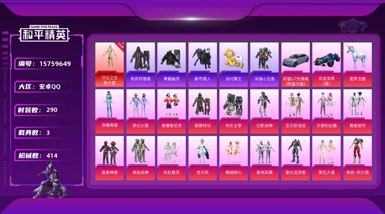 [15759649]【特价出售/店主推荐】素材身法套安卓 手Q-1神装-23粉装-25特效枪-3载具-10粉色飞行器-140979热力值-22王牌印记-290套装-414枪皮