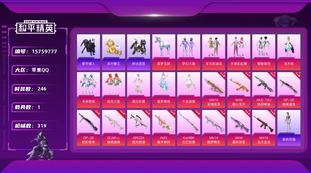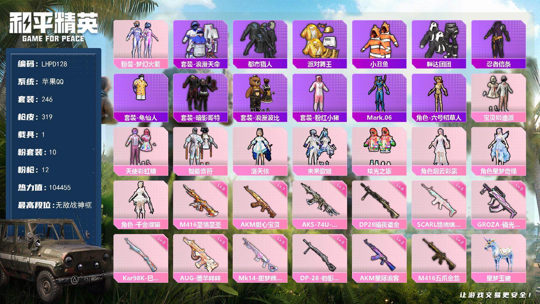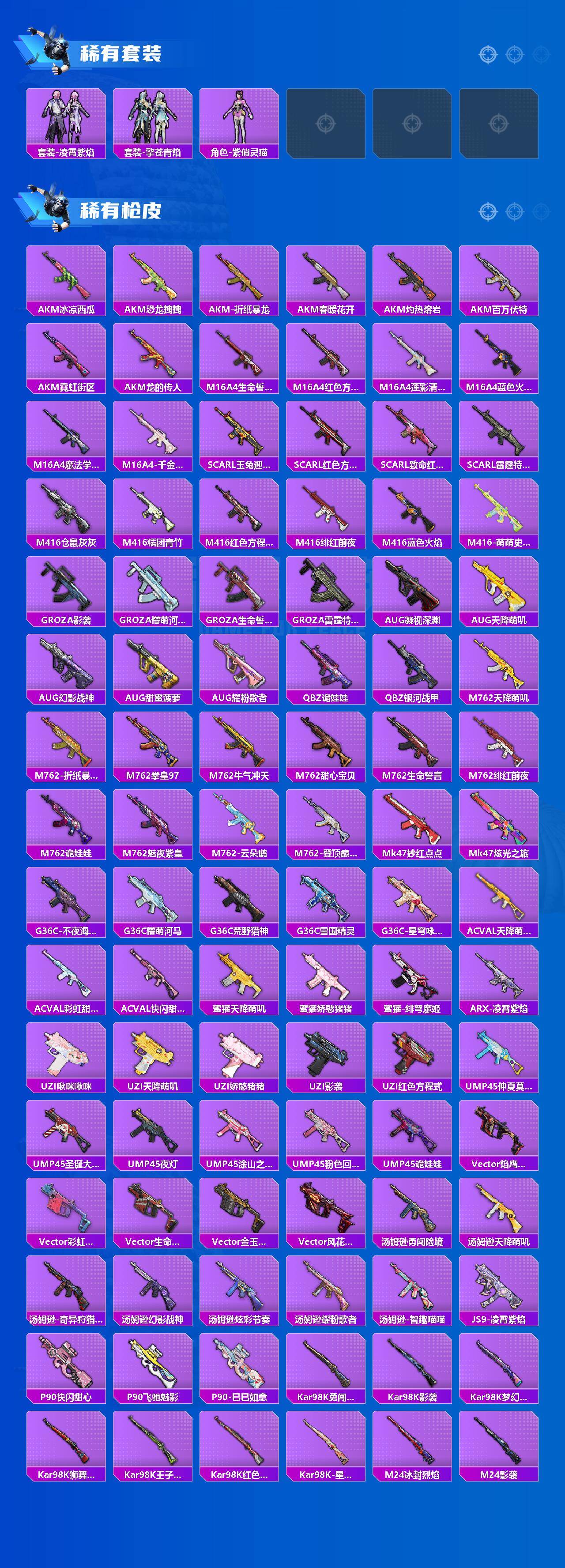 [15759777]9级m4至情至胜 满级aks 满级ak甜心宝贝【特价出售/店主推荐】苹果 手Q-无敌战神框-10粉装-12特效枪-1载具-4粉色飞行器-104455热力值-22王牌印记-246套装-319枪皮【热门品类】:粉装-梦幻火箭,套装-浪漫天命,套装-都市猎人,套装-派对舞王,套装-小丑鱼,套装-胖达团团,套装-忍者信条,套装-龟仙人,套装-暗影哥特,套装-浪漫波比,套装-粉红小猪,角色-Mark.06,角色-六号稻草人【粉色套装】:粉装-宝贝奶油派,粉装-天使彩虹糖,粉装-梦幻火箭,粉装-智能音符,角色-洛天依,粉装-未来歌姬,粉装-炫光之旅,角色-烟云彩露,角色-星梦奇缘,角色-千金淑猫【粉色枪皮等级】:AKM-甜心宝贝(七级),AKM-星际浪客(三级),SCAR-L-锦绣绵绵(五级),M416-五爪金龙(二级),M416-至情至圣(九级),GROZA-镜光银凌(五级),AUG-暖羊咩咩(五级),AKS-74U-信仰神谕(七级),Kar98K-巳巳如意(五级),Mk14-甜梦熊击(五级),DP-28-暗夜鎏金(六级),DP-28-豹影疾电(五级)【粉色载具】:星梦玉骢【粉色枪皮】:AKM-甜心宝贝,AKM-星际浪客,SCAR-L-锦绣绵绵,M416-五爪金龙,M416-至情至圣,GROZA-镜光银凌,AUG-暖羊咩咩,AKS-74U-信仰神谕,Kar98K-巳巳如意,Mk14-甜梦熊击,DP-28-暗夜鎏金,DP-28-豹影疾电【粉色飞行器】:太空嘟嘟飞行器,镜光幻境飞行翼,夜幕颂歌飞行器