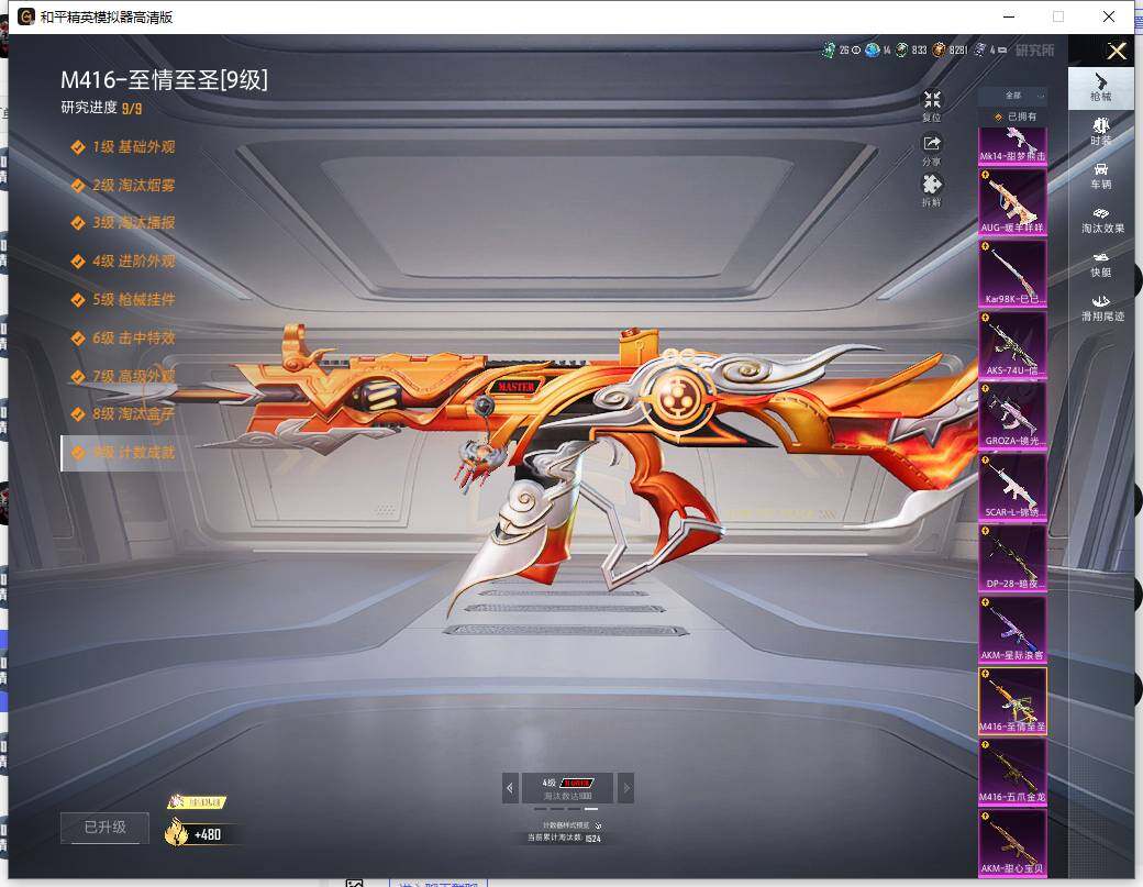 AKM-甜心宝贝,AKM-星际浪客,SCAR-L-锦绣绵绵,M416-五爪金龙,M416-至情至圣,GROZA-镜光银凌,AUG-暖羊咩咩,AKS-74U-信仰神谕,Kar98K-巳巳如意,DP-28-暗夜鎏金