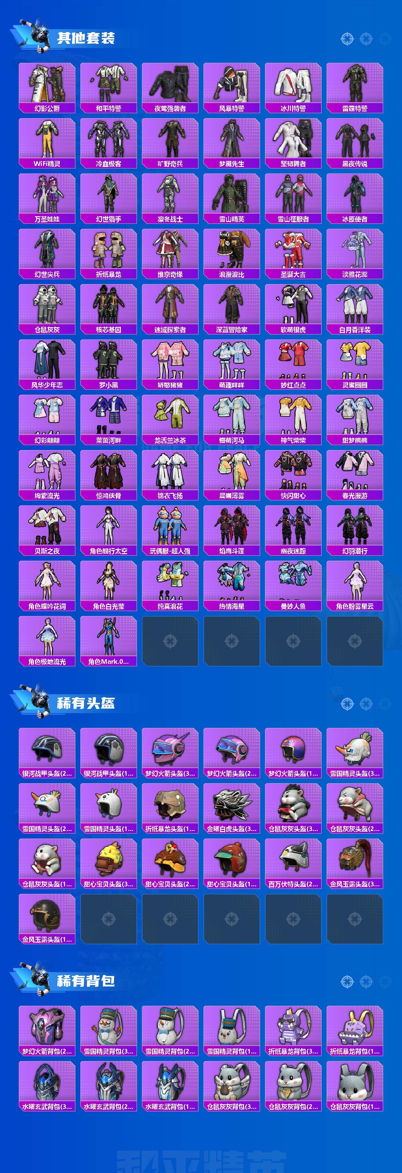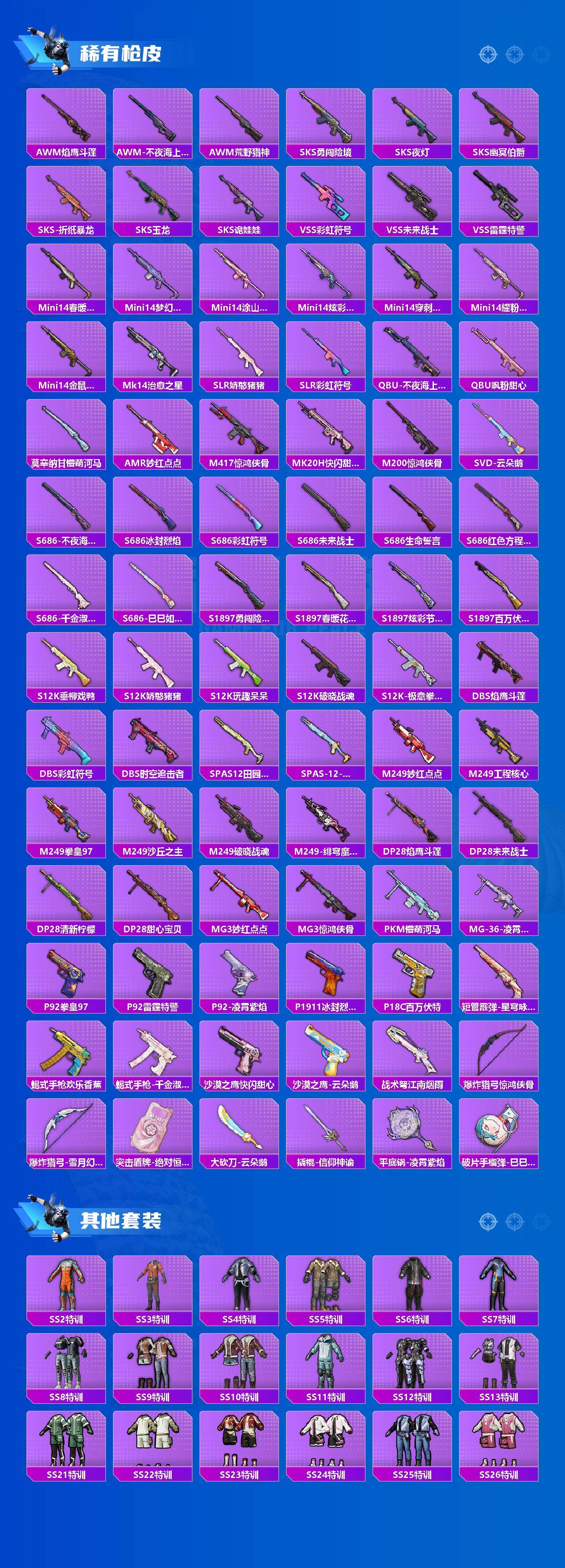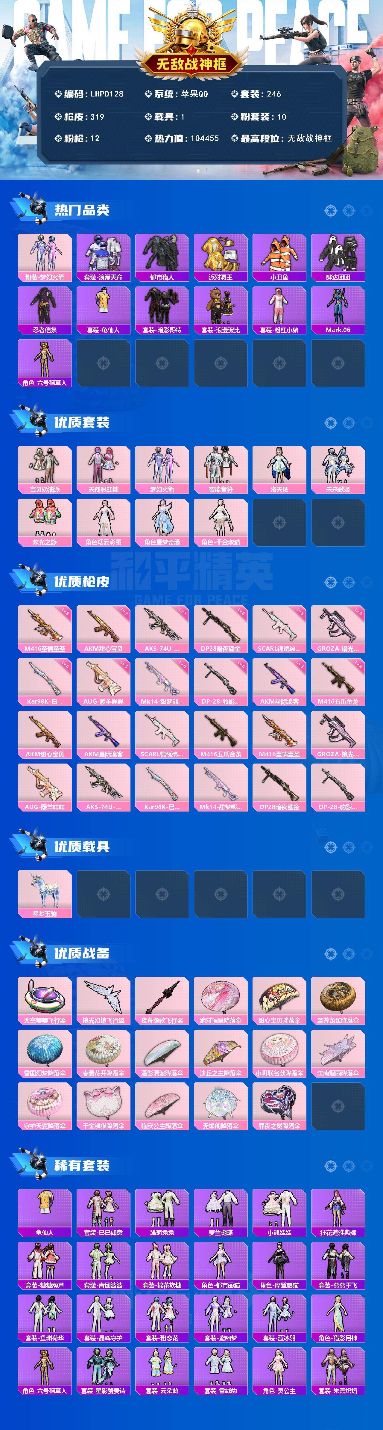 - [14451326]【1615】苹果 手Q-无敌战神框-1神装-17粉装-13特效枪-5载具-7粉色飞行器-124295热力值-32王牌印记-257套装-349枪皮 【红色神装等级】:盛世惊鸿-云鸾(二级) 【红色角色神装】:盛世惊鸿-云鸾 【热门品类】:粉装-梦幻火箭,粉装-缤纷油彩,绝对防御上衣,套装-浪漫天命,套装-冥河战士,套装-派对舞王,套装-奇异狩猎者,套装-胖达圆圆,套装-金羽特工,套装-龟仙人,套装-潮萌小黄鸭,套装-粉红小猪,套装-萌熊伴侣,M416-星际漫游 【粉色载具】:特斯拉Model X(珍珠白),玛莎拉蒂Ghibli(蓝),帕加尼imola(艺术银),护世瑞兽,晶梦灵驹 【粉色套装】:粉装-土曜战麒,粉装-蝶舞迷情,粉装-梦幻火箭,粉装-金风玉露,粉装-金属狂野,粉装-缤纷油彩,粉装-放客神游,粉装-天禅智恒,粉装-极致幻想,粉装-俏皮狐尾,粉装-恐龙拽拽,角色-千金淑猫,角色-萨利娅,角色-女娲灵识,角色-樱桃泡泡,角色-智耀战神,角色-异瞳寒姬 【粉色枪皮等级】:AKM-炫紫旋律(七级),SCAR-L-梦幻火箭(七级),M416-五爪金龙(七级),M416-风花雪月(五级),GROZA-镜光银凌(五级),AUG-暖羊咩咩(五级),M762-鬼刀(六级),Kar98K-巳巳如意(五级),Mini14-龙虾霸霸(六级),Mk14-盛世惊鸿(三级),Mk14-樱桃泡泡(六级),AMR-智耀战神(七级),DP-28-豹影疾电(五级) 【粉色枪皮】:AKM-炫紫旋律,SCAR-L-梦幻火箭,M416-五爪金龙,M416-风花雪月,GROZA-镜光银凌,AUG-暖羊咩咩,M762-鬼刀,Kar98K-巳巳如意,Mini14-龙虾霸霸,Mk14-盛世惊鸿,Mk14-樱桃泡泡,AMR-智耀战神,DP-28-豹影疾电 【粉色飞行器】:酣梦熊熊飞行器,梦幻火箭飞行器,炫紫旋律飞行器,太空嘟嘟飞行器,凤舞九天飞行器,圣域金龙飞行器 【粉色降落伞】:深海曼妙降落伞,极限特训降落伞,南瓜骑士降落伞,甜心宝贝降落伞,梦幻火箭降落伞,天启纪元降落伞,金风玉露降落伞,炫紫旋律降落伞,PEL轰鸣竞梦者降落伞,古堡领主降落伞,甜蜜誓约降落伞,四圣焕新降落伞,阿狸红降落伞,怪笑疯兔降落伞,暗夜玫瑰降落伞,精灵梦叶罗丽降落伞,千金淑猫降落伞,盛世惊鸿降落伞,金蛇镇世降落伞,鬼刀降落伞,晶梦幻