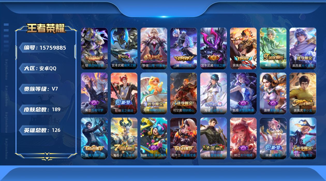 - [15083275]【店主推荐捡漏号!可直接换绑】对抗路33段,安卓Q-V8-最强王者段位-126英雄-340皮肤-1典藏皮肤-10传说-102史诗 【英雄全皮】:狂铁全皮,猪八戒全皮,蒙恬全皮 【荣耀典藏】:夏侯惇无限飓风号 【传说皮肤】:桑启鸣野蒿,铠冥王哈迪斯,吕布曦玄引,曜李逍遥 ,虞姬启明星使,孙悟空零号赤焰,后羿黄金射手座,孙尚香末日机甲,孙悟空地狱火,狄仁杰超时空战士 【限定皮肤】:白起狰,铠冥王哈迪斯,蔡文姬夏日便利店,大乔绒语心约,虞姬夏日便利店,姜子牙天穹之誓,狄仁杰阴阳师,虞姬凯尔特女王,廉颇寅虎御盾,赵云皇家上将,赵云引擎之心,墨子神迹守卫,嬴政白昼王子,鲁班七号乒乒小将,庄周高山流水,高渐离玩趣恶龙,钟无艳王者之锤,扁鹊炼金王,白起夜都怪侠,芈月幻夜卜梦,吕布猎兽之王,吕布御风骁将,元歌云间偶戏,夏侯惇朔风刀,典韦穷奇,典韦蓝屏警告,马可波罗暗影游猎,狄仁杰魔术师,狄仁杰万华元夜,达摩星际陆战队,达摩沙漠行僧,项羽海滩派对,老夫子醍醐杖,老夫子航海奇遇记,程咬金演武夺筹,韩信飞衡,王昭君午后时光,兰陵王金庭之子,花木兰默契交锋,亚瑟潮玩骑士王,孙悟空零号赤焰,孙悟空孙行者,牛魔御旌,后羿辉光之辰,后羿如梦令,后羿圣弓游侠,李元芳银河之约,李元芳云中旅人,虞姬启明星使,钟馗驱傩正仪,女娲朔望之晖,干将莫邪真爱魔法,雅典娜单词大作战,雅典娜黎明之约,蔡文姬繁星吟游,鬼谷子原初探秘者,黄忠烈魂,黄忠火炮绅士,苏烈千军破阵,百里玄策原初追逐者,百里守约朱雀志,弈星混沌棋,梦奇顽趣,公孙离蜜橘之夏,公孙离玉兔公主,沈梦溪大漠名商,明世隐疑决卦,裴擒虎李小龙,裴擒虎擒涛扼浪,狂铁御狮,狂铁电玩高手,米莱狄御霄,米莱狄胡桃异想国,云中君纤云弄巧,伽罗天狼溯光者,盾山御銮,猪八戒西部大镖客,猪八戒猪悟能,上官婉儿梁祝,嫦娥拒霜思,曜李逍遥 ,蒙犽狂想玩偶喵,鲁班大师探海日志,桑启海盐诗旅,艾琳女武神,艾琳流音漫舞,张良古海寻踪,蒙恬荣光圣徽,鬼谷子天穹祈灯,吕布曦玄引,沈梦溪龙舞盛年,刘邦剑破天穹,周瑜熔金海岸 【年限皮肤】:百里守约朱雀志,廉颇寅虎御盾,后羿辉光之辰,吕布御风骁将,韩信飞衡,黄忠烈魂 【赛季限定】:扁鹊炼金王,白起狰,夏侯惇朔风刀,典韦穷奇,狄仁杰万华元夜,达摩沙漠行僧,老夫子醍醐杖,程咬金演武夺筹,兰陵王金庭之子,张良古海寻踪,牛魔御旌,李元芳云中旅人,