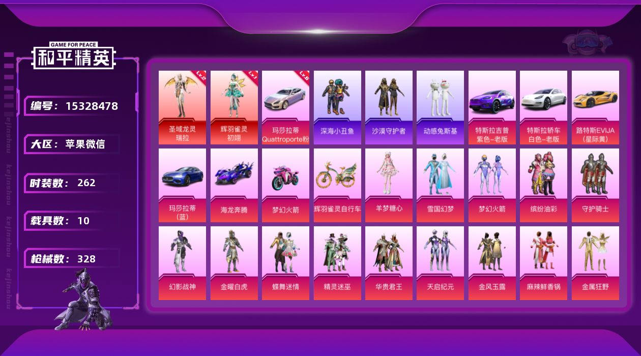 [15328478]【特价出售/店主推荐】 苹果 微信-2神装-38粉装-29特效枪-10载具-14粉色飞行器-169542热力值-14王牌印记-262套装-328枪皮【红色载具】:玛莎拉蒂Quattroporte(幻星粉)(六级)【红色神装等级】:辉羽雀灵-初翊(一级),圣域龙灵-瑞拉(二级)【红色角色神装】:辉羽雀灵-初翊,圣域龙灵-瑞拉【热门品类】:粉装-雪国幻梦,粉装-梦幻火箭,粉装-缤纷油彩,套装-浪漫天命,套装-深海小丑鱼,套装-沙漠守护者,套装-暗夜行者,套装-动感兔斯基人偶服,套装-潮萌小黄鸭,套装-浪漫波比,套装-粉红小猪,套装-萌熊伴侣,角色-六号稻草人【粉色套装】:粉装-守护骑士,粉装-幻影战神,粉装-金曜白虎,粉装-雪国幻梦,粉装-蝶舞迷情,粉装-精灵迷巫,粉装-梦幻火箭,粉装-华贵君王,粉装-天启纪元,粉装-金风玉露,粉装-麻辣鲜香锅,粉装-金属狂野,粉装-静灵氛围,粉装-智能音符,粉装-缤纷油彩,粉装-PEL轰鸣竞梦者,粉装-古堡领主,粉装-天禅智恒,粉装-狩月元帅,粉装-新星烈龙,粉装-向日葵,粉装-甜蜜誓约,粉装-香水柠檬,角色-洛天依,粉装-海渊国主,角色-初号机款机体服,粉装-恐龙拽拽,粉装-赤焰黑爵,粉装-炙焰牛王,粉装-暖熊萌萌,粉装-鸾凤武仙,粉装-太空嘟嘟,粉装-冰川幽秘,粉装-冰川红玫,角色-冰炎战车,角色-紫钛骑兵,粉装-幻彩电音,角色-羊梦糖心【粉色枪皮等级】:AKM-炫紫旋律(一级),AKM-熔岩统帅(三级),SCAR-L-梦幻火箭(五级),M416-五爪金龙(一级),M416-风花雪月(一级),M416-暖熊萌萌(一级),M416-至情至圣(九级),GROZA-香水柠檬(七级),AUG-妙趣可丽(七级),AUG-暖羊咩咩(一级),M762-甜蜜誓约(六级),M762-冷魅冰骑(二级),UZI-畅跳缤纷(五级),UMP45-雪国精灵(一级),UMP45-玉魂晶魄(八级),汤姆逊-冰川粉黛(四级),AKS-74U-星穹咏叹调(五级),P90-甜蜜草莓(五级),Kar98K-圣域龙灵(二级),M24-翩跹演武(四级),AWM-橘柚倾心(五级),Mini14-龙虾霸霸(四级),Mk14-甜梦熊击(五级),S12K-海渊国主(四级),DP-28-豹影疾电(五级),MG3-炙焰牛王(一级),MG3-辉羽雀灵(三级),MG-36-沧焰双生(五级