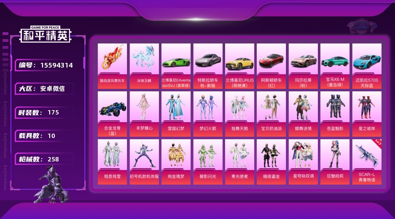 - [13012380]【1474】安卓 手Q-8粉装-8特效枪-2载具-1粉色飞行器-55706热力值-10王牌印记-106套装-156枪皮 【热门品类】:套装-奇异狩猎者,角色-军刀雅典娜,套装-龟仙人 【粉色载具】:玛莎拉蒂Ghibli(粉),焰龙咆哮 【粉色套装】:粉装-蜜桃特工,角色-洛天依,粉装-蓝莓炮弹,粉装-青葱仙萝,粉装-彩虹甜喵,角色-宙之时溯,角色-星云暗核,角色-冷漠罗丽 【粉色枪皮等级】:AKM-绿萝繁花(五级),SCAR-L-青春物语(五级),M416-五爪金龙(五级),Kar98K-巳巳如意(四级),Mk14-甜梦熊击(五级),M417-第五大道(四级),S12K-海渊国主(五级),MG3-洛神天依(七级) 【粉色枪皮】:AKM-绿萝繁花,SCAR-L-青春物语,M416-五爪金龙,Kar98K-巳巳如意,Mk14-甜梦熊击,M417-第五大道,S12K-海渊国主,MG3-洛神天依 【粉色飞行器】:星夜魔法师飞行翼 【粉色降落伞】:洛神天依降落伞,炙焰牛王降落伞,环太平洋降落伞,太空嘟嘟降落伞,彩虹甜喵降落伞,暗夜鎏金降落伞,第五大道降落伞,圣堂之誓降落伞 【稀有套装】:套装-龟仙人 【稀有枪皮】:AKM-彩虹符号,AKM-海渊国主,AKM-灼热熔岩,AKM-环太平洋,AKM-缤纷海域,AKM-萌趣颜团子,AKM-虎虎生威,AKM-霓虹街区,M16A4-幻世战舞者,M16A4-甜心亚梦,SCAR-L-夜灯,SCAR-L-炫彩节奏,SCAR-L-玉兔迎春,SCAR-L-甜蜜誓约,SCAR-L-红色方程式,M416-糯团青竹,M416-红色方程式,GROZA-异彩先驱,GROZA-懵萌河马,GROZA-田园牧歌,AUG-天降萌叽,AUG-怪笑疯兔,AUG-青春冒险家,QBZ-妙趣可丽,QBZ-洛神天依,QBZ-神秘黑猫,M762-彩虹甜喵,M762-瑞龙福将,M762-第五大道,Mk47-妙红点点,Mk47-洛神天依,Mk47-炫光之旅,Mk47-青春冒险家,G36C-懵萌河马,G36C-时空追击者,AC-VAL-天降萌叽,AC-VAL-彩虹甜喵,AC-VAL-甜心亚梦,蜜獾-天降萌叽,蜜獾-娇憨猪猪,UZI-啾咪啾咪,UZI-天降萌叽,UZI-娇憨猪猪,UMP45-夜灯,UMP45-时空追击者,UMP45-海渊国主,UMP45-生命誓言,Vector-生命誓言