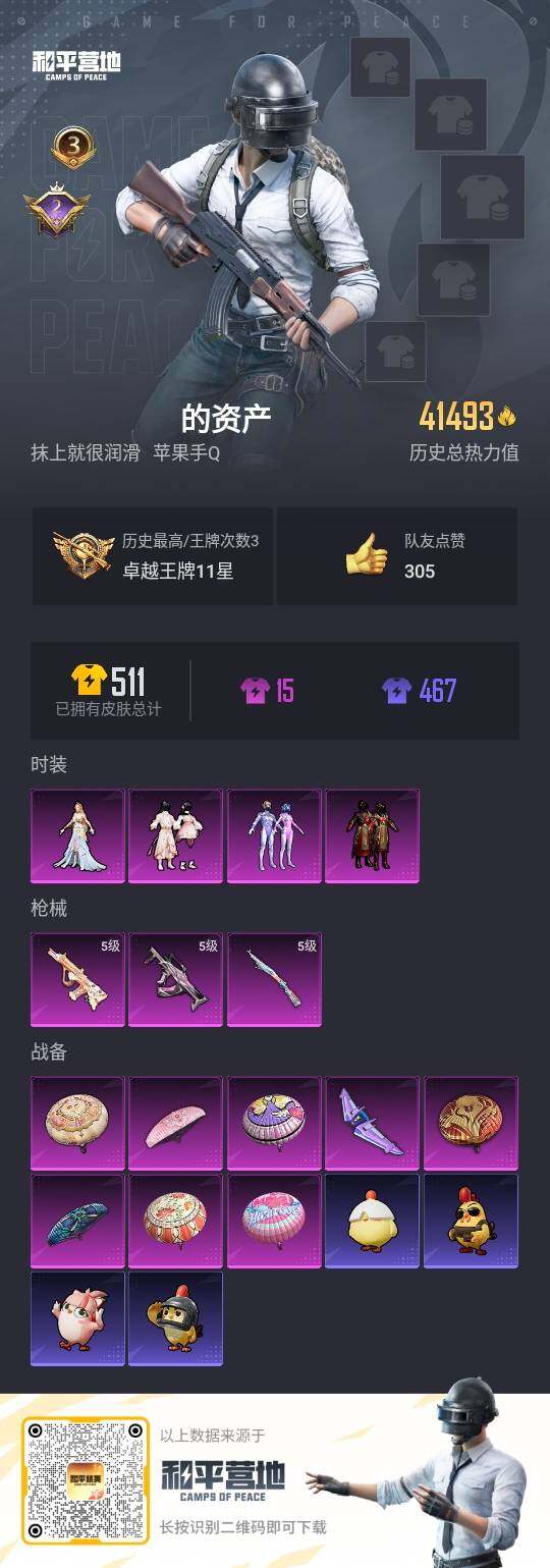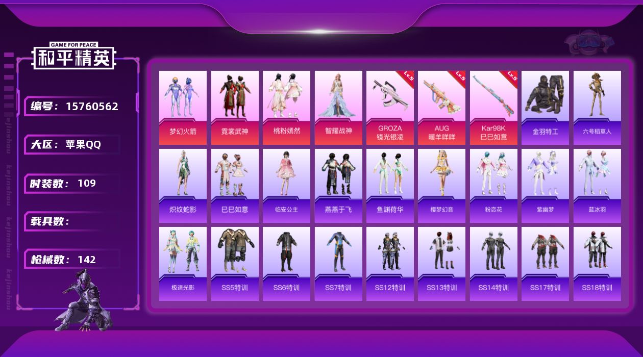 - PX_2081813- 苹果手Q-5王牌印记-4粉装-5特效枪-1载具-36782热力值-107套装-107枪皮-0卓越印记-0传奇印记 【4粉装】,复仇流浪者,薄荷物语,霁雪冰心,樱桃泡泡 【5特效枪】SCAR-L-青春物语-4级 M416-暖熊萌萌-4级 Kar98K-巳巳如意-5级 Vector-环太平洋-4级 DP-28-暗夜鎏金-4级 【2稀有紫装】,暗影哥特,浪漫波比, 【1稀有载具