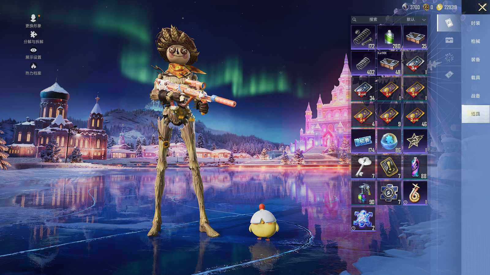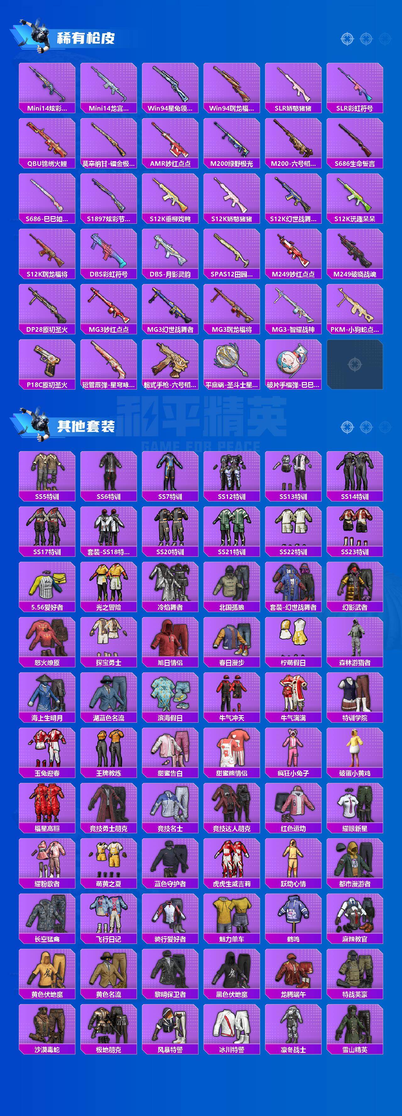 【稀有枪皮】:AKM-冰凉西瓜,AKM-夜灯,AKM-破晓战魂,AKM-虎虎生威,AKM-霓虹街区,M16A4-红色方程式,SCAR-L-炫彩节奏,SCAR-L-玉兔迎春,SCAR-L-红色方程式,SCAR-L-黄金龙骨,SCAR-L-小狗蛇点点,M416-糯团青竹,M416-红色方程式,M416-绯红前夜,M416-绿野极光,M416-蓝色火焰,GROZA-异彩先驱,GROZA-影袭,GROZA-治愈之星,GROZA-田园牧歌,AUG-耀粉歌者,QBZ-原初圣火,M762-天降萌叽,M762-牛气冲天,M762-瑞龙福将,M762-绯红前夜,Mk47-妙红点点,AC-VAL-天降萌叽,AC-VAL-六号稻草人,蜜獾-天降萌叽,蜜獾-娇憨猪猪,ACE32-蓝晶绮麟,UZI-娇憨猪猪,UZI-炫彩节奏,UZI-红色方程式,UMP45-夜灯,UMP45-时空追击者,UMP45-蓝色火焰,UMP45-绒宝小鹅,Vector-彩虹符号,Vector-生命誓言,Vector-田园牧歌,Vector-音爆索尼克,汤姆逊-异彩先驱,汤姆逊-耀粉歌者,MP5K-异彩先驱,MP5K-蓝莓炮弹,AKS-74U-鬼刀,P90-飞驰魅影,P90-巳巳如意,Kar98K-彩虹符号,Kar98K-梦幻火箭,Kar98K-电玩视界,Kar98K-红色方程式,Kar98K-星穹咏叹调,VSS-田园牧歌,VSS-
