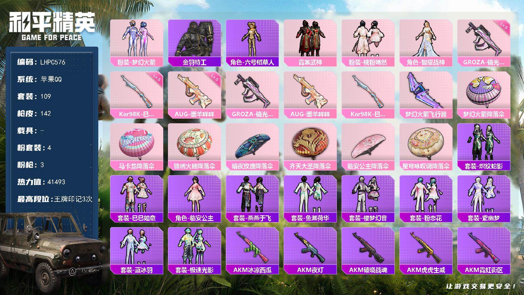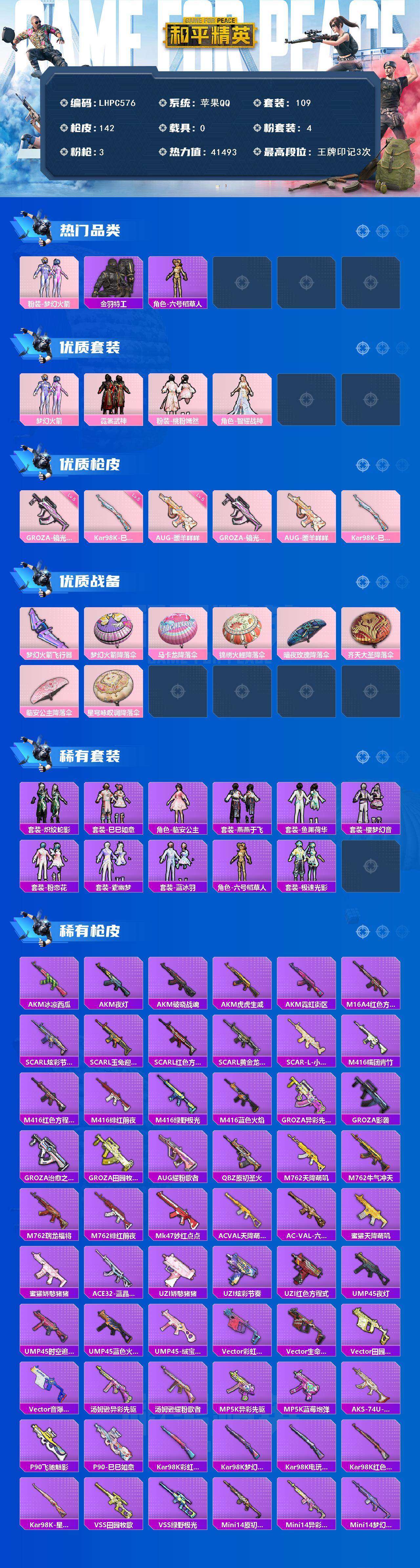 [15760562]【特价出售/店主推荐】苹果 手Q-4粉装-3特效枪-0载具-1粉色飞行器-41493热力值-3王牌印记-109套装-142枪皮 【热门品类】:粉装-梦幻火箭,套装-金羽特工,角色-六号稻草人 【粉色套装】:粉装-梦幻火箭,粉装-霓裳武神,粉装-桃粉嫣然,角色-智耀战神 【粉色枪皮等级】:GROZA-镜光银凌(五级),AUG-暖羊咩咩(五级),Kar98K-巳巳如意(五级) 【粉色枪皮】:GROZA-镜光银凌,AUG-暖羊咩咩,Kar98K-巳巳如意 【粉色飞行器】:梦幻火箭飞行器 【粉色降落伞】:梦幻火箭降落伞,马卡龙降落伞,锦绣火鲤降落伞,暗夜玫瑰降落伞,齐天大圣降落伞,临安公主降落伞,星穹咏叹调降落伞 【稀有套装】:套装-炽纹蛇影,套装-巳巳如意,角色-临安公主,套装-燕燕于飞,套装-鱼渊荷华,套装-樱梦幻音,套装-粉恋花,套装-紫幽梦,套装-蓝冰羽,角色-六号稻草人,套装-极速光影 【稀有枪皮】:AKM-冰凉西瓜,AKM-夜灯,AKM-破晓战魂,AKM-虎虎生威,AKM-霓虹街区,M16A4-红色方程式,SCAR-L-炫彩节奏,SCAR-L-玉兔迎春,SCAR-L-红色方程式,SCAR-L-黄金龙骨,SCAR-L-小狗蛇点点,M416-糯团青竹,M416-红色方程式,M416-绯红前夜,M416-绿野极光,M416-蓝色火焰,GROZA-异彩先驱,GROZA-影袭,GROZA-治愈之星,GROZA-田园牧歌,AUG-耀粉歌者,QBZ-原初圣火,M762-天降萌叽,M762-牛气冲天,M762-瑞龙福将,M762-绯红前夜,Mk47-妙红点点,AC-VAL-天降萌叽,AC-VAL-六号稻草人,蜜獾-天降萌叽,蜜獾-娇憨猪猪,ACE32-蓝晶绮麟,UZI-娇憨猪猪,UZI-炫彩节奏,UZI-红色方程式,UMP45-夜灯,UMP45-时空追击者,UMP45-蓝色火焰,UMP45-绒宝小鹅,Vector-彩虹符号,Vector-生命誓言,Vector-田园牧歌,Vector-音爆索尼克,汤姆逊-异彩先驱,汤姆逊-耀粉歌者,MP5K-异彩先驱,MP5K-蓝莓炮弹,AKS-74U-鬼刀,P90-飞驰魅影,P90-巳巳如意,Kar98K-彩虹符号,Kar98K-梦幻火箭,Kar98K-电玩视界,Kar98K-红色方程式,Kar98K-星穹咏叹调,VSS-田园牧歌,VSS-
