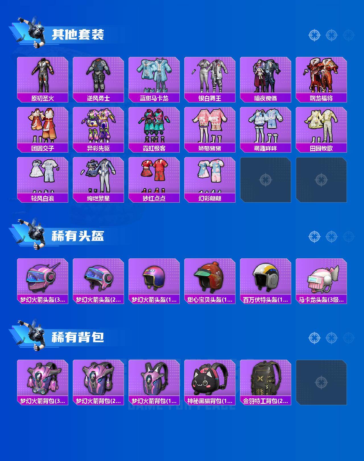 【粉色套装】:粉装-梦幻火箭,粉装-霓裳武神,粉装-桃粉嫣然,角色-智耀战神