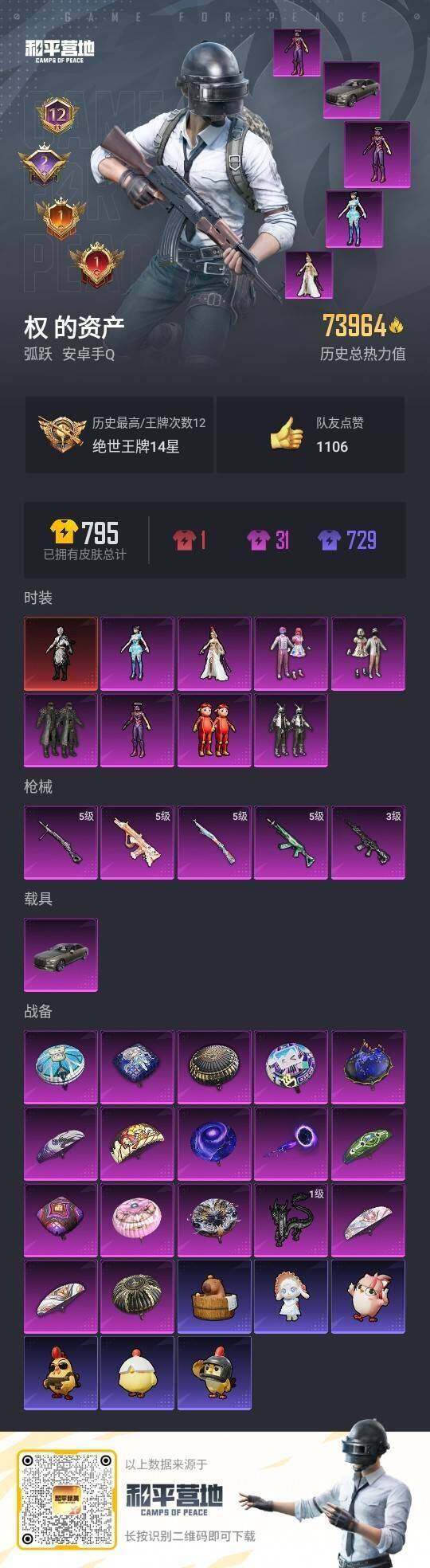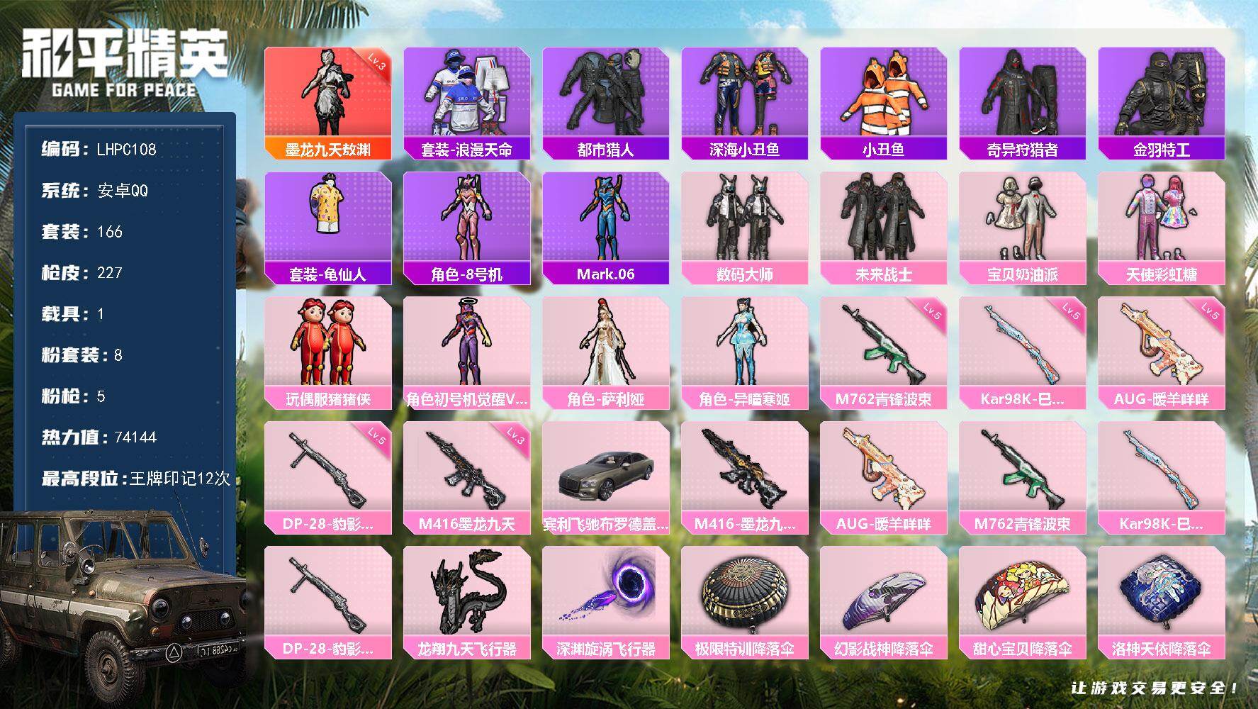 [15760575]安卓 手Q-1神装-8粉装-5特效枪-1载具-2粉色飞行器-74144热力值-12王牌印记-166套装-227枪皮