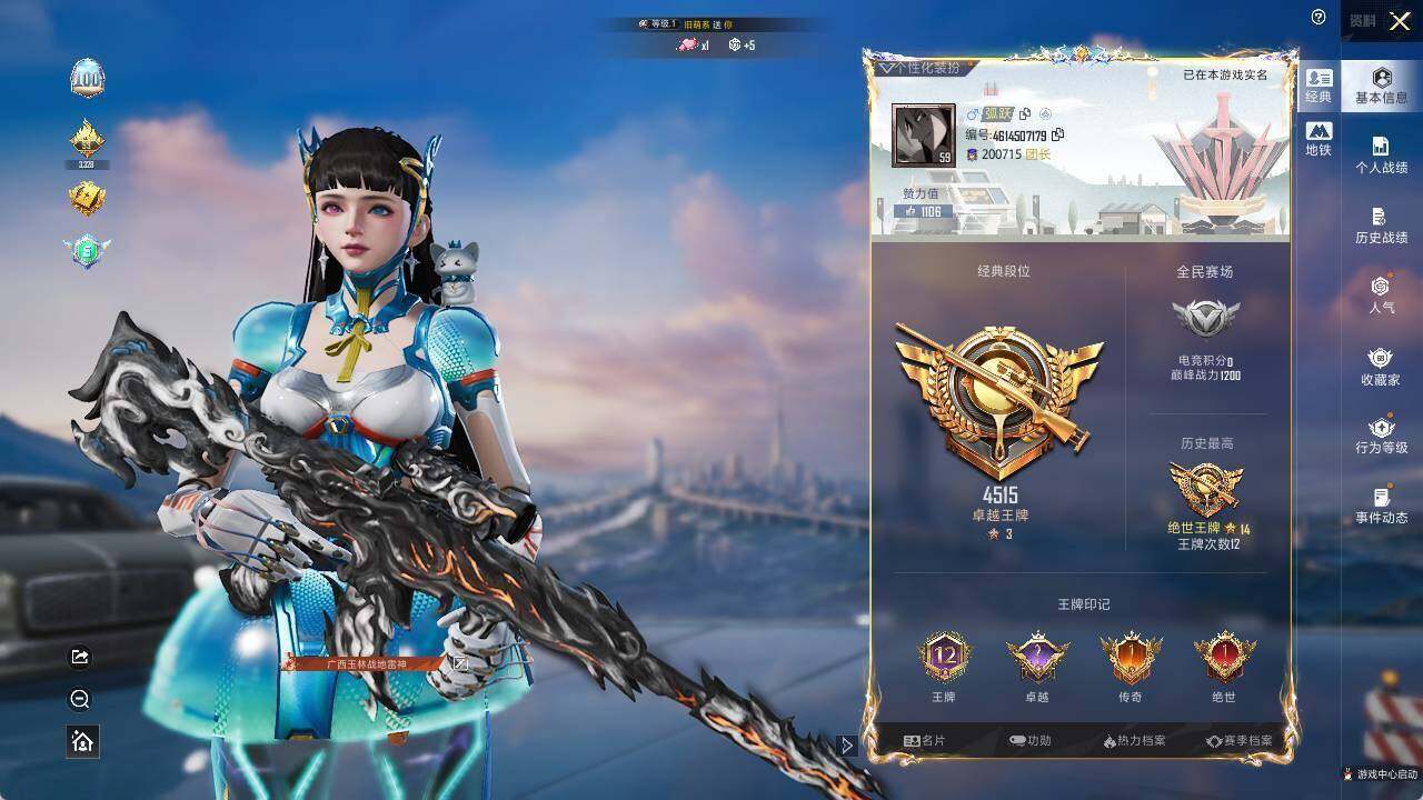 - [15472406]山东一区-6V-0王者-0炫金 【热门武器】:M200-幻神 【皮肤】:幻神-宠儿-2021MVP,M200-幻神-N9-2022MVP 【角色】:战地猎狐,乔伊教练,暗夜-X,嘉年华灵狐,灵狐者-X,潘多拉-X,潘多拉-甜心教官,潜龙队-X,蜀雪,新娜塔莎 【人偶武器】:AWM-灵狐-15周年嘉年华*2,迷你裂空之翼,生化手雷-机甲核心*2 【暴走生化】:超级对讲机 【挑战大师】:激光毁灭者III-白马银枪 【英雄级武器】:M4A1-雷神,无影-神兵利器,M200-幻神,AWM-昌龙 【道具】:云山科技背包,全能枪王背包,超级背包,救世主-黑桃战神,绿色巨人,灵魂忍者,迷雾幽灵,生化弹匣,夺命之镰,防化服*3,金色流光-枪王排位*2,星辰流光-枪王排位,流光-再燃火线,防弹头盔*5,防弹衣*5,C4工具钳*5,手雷包*5 【特殊枪械】: