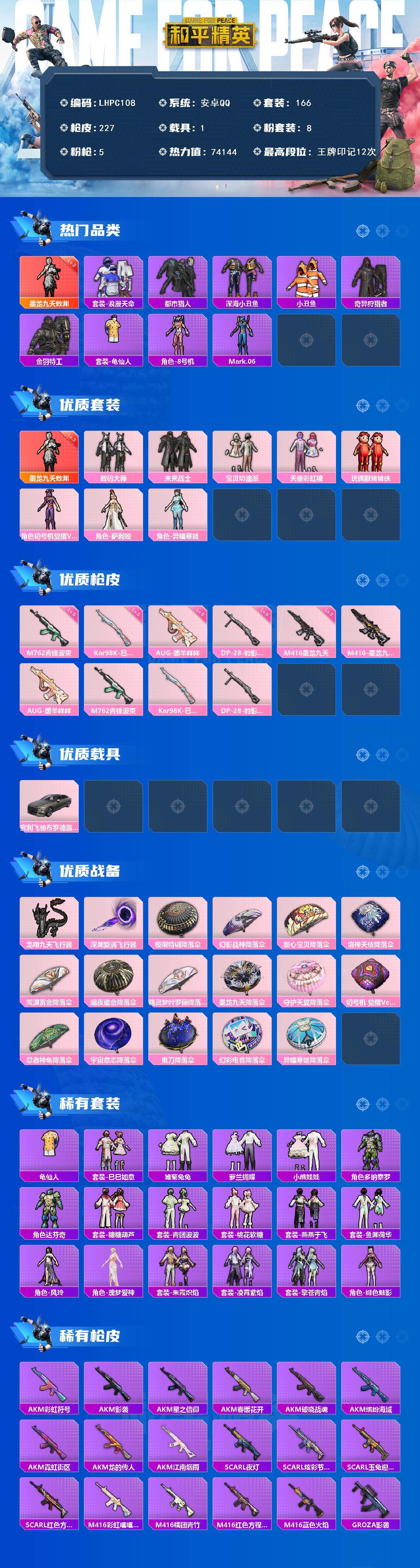 [15760575]安卓 手Q-1神装-8粉装-5特效枪-1载具-2粉色飞行器-74144热力值-12王牌印记-166套装-227枪皮 【红色神装等级】:墨龙九天-敖渊(三级) 【红色角色神装】:墨龙九天-敖渊 【热门品类】:套装-浪漫天命,套装-都市猎人,套装-深海小丑鱼,套装-小丑鱼,套装-奇异狩猎者,套装-金羽特工,套装-龟仙人,角色-8号机,角色-Mark.06 【粉色套装】:粉装-数码大师,粉装-未来战士,粉装-宝贝奶油派,粉装-天使彩虹糖,玩偶服-猪猪侠,角色-初号机 觉醒Ver.,角色-萨利娅,角色-异瞳寒姬 【粉色枪皮等级】:M416-墨龙九天(三级),AUG-暖羊咩咩(五级),M762-青锋波束(五级),Kar98K-巳巳如意(五级),DP-28-豹影疾电(五级) 【粉色载具】:宾利飞驰(布罗德盖棕双色) 【粉色枪皮】:M416-墨龙九天,AUG-暖羊咩咩,M762-青锋波束,Kar98K-巳巳如意,DP-28-豹影疾电 【粉色飞行器】:龙翔九天飞行器,深渊漩涡飞行器 【粉色降落伞】:极限特训降落伞,幻影战神降落伞,甜心宝贝降落伞,洛神天依降落伞,荒漠赏金降落伞,暗夜鎏金降落伞,精灵梦叶罗丽降落伞,墨龙九天降落伞,守护天翼降落伞,初号机 觉醒Ver.降落伞,忍者神龟降落伞,宇宙意志降落伞,鬼刀降落伞,幻彩电音降落伞,异瞳寒姬降落伞,炫彩糖果降落伞 【稀有套装】:套装-龟仙人,套装-巳巳如意,套装-雏菊兔兔,套装-萝兰蝴蝶,套装-小熊娃娃,角色-多纳泰罗,角色-达芬奇,套装-糖糖葫芦,套装-青团波波,套装-棉花软糖,套装-燕燕于飞,套装-鱼渊荷华,角色-风玲,角色-瑰梦爱神,套装-朱霞炽焰,套装-凌霄紫焰,套装-擎苍青焰,角色-绯色魅影 【稀有枪皮】:AKM-彩虹符号,AKM-影袭,AKM-星之信仰,AKM-春暖花开,AKM-江南烟雨,AKM-破晓战魂,AKM-缤纷海域,AKM-霓虹街区,AKM-龙的传人,SCAR-L-夜灯,SCAR-L-炫彩节奏,SCAR-L-玉兔迎春,SCAR-L-红色方程式,M416-彩虹嘻嘻猴,M416-糯团青竹,M416-红色方程式,M416-蓝色火焰,GROZA-影袭,GROZA-懵萌河马,GROZA-田园牧歌,AUG-天降萌叽,AUG-海螺星光,AUG-耀粉歌者,QBZ-洛神天依,M762-天降萌叽,M762-甜心宝贝,Mk47-妙红点